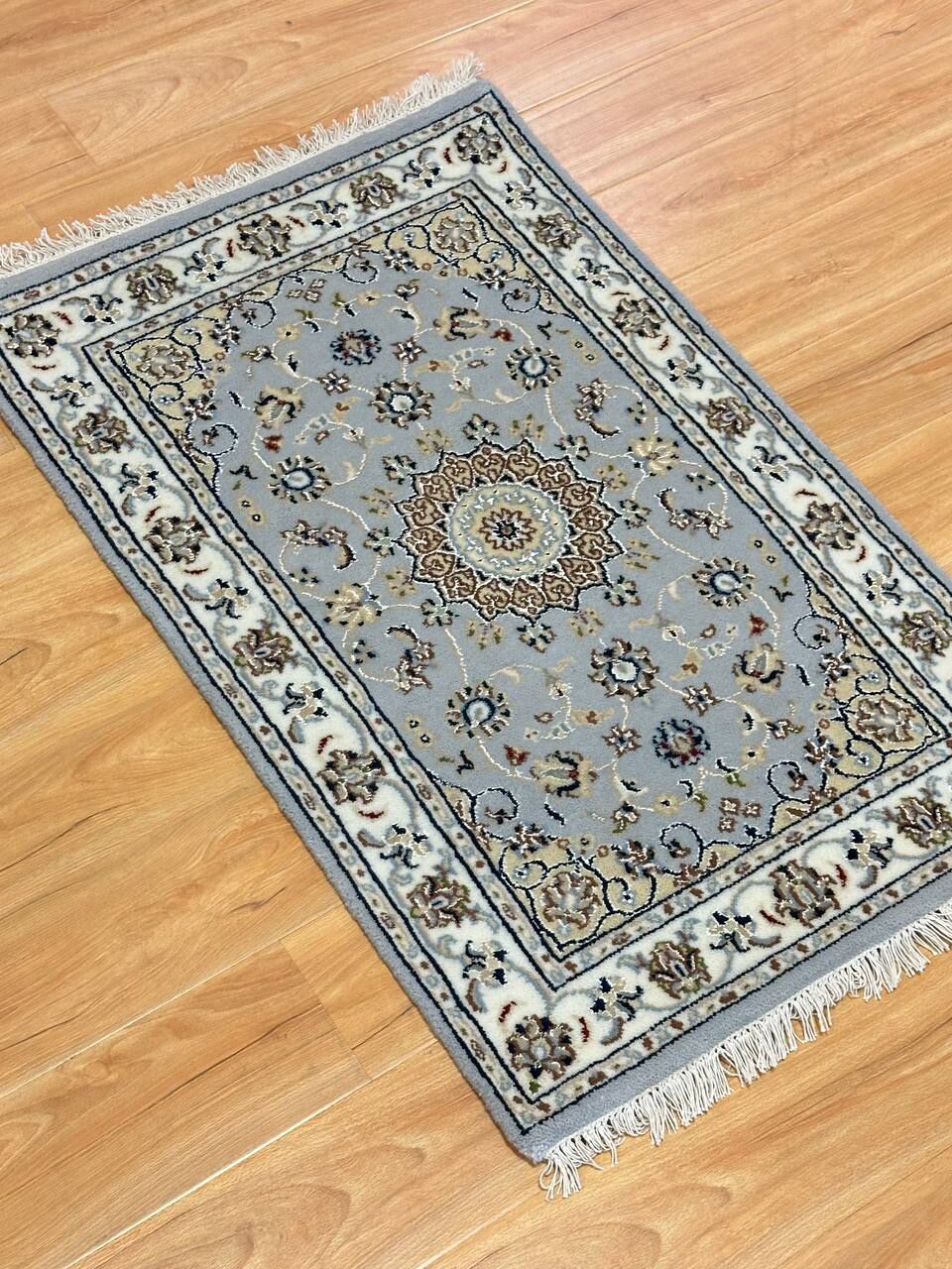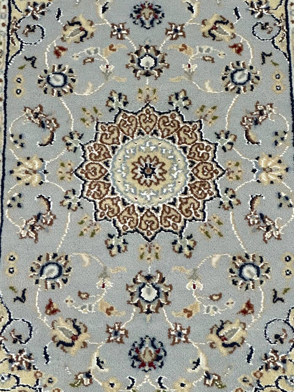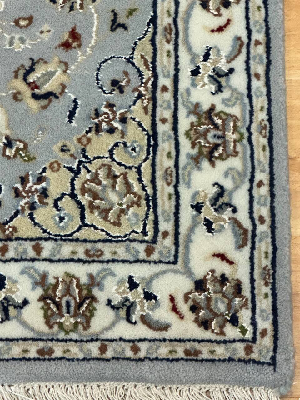 – Timeless Beauty: Add sophistication to your home with this brand-new, full-pile hand-knotted Indian rug, featuring a refined Nain design. Made from pure wool and silk-like blend on a cotton base, it showcases vibrant tones of light Blue, creamy ivory, and light tones vegetable dyed using traditional methods.