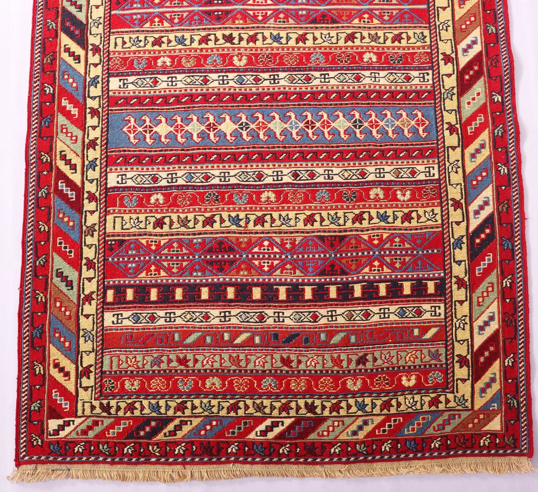 – Artistic Craftsmanship: Immerse yourself in the beauty of a Persian Ardebil Sumak Kilim Runner Rug, featuring three weaving techniques and a pure hand-spun wool pile with silk on a wool base.
