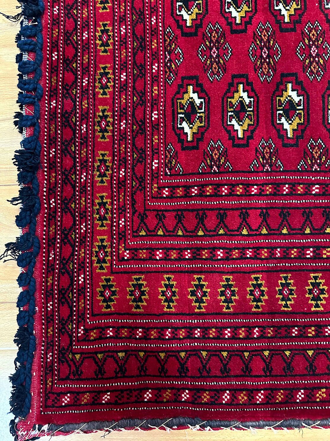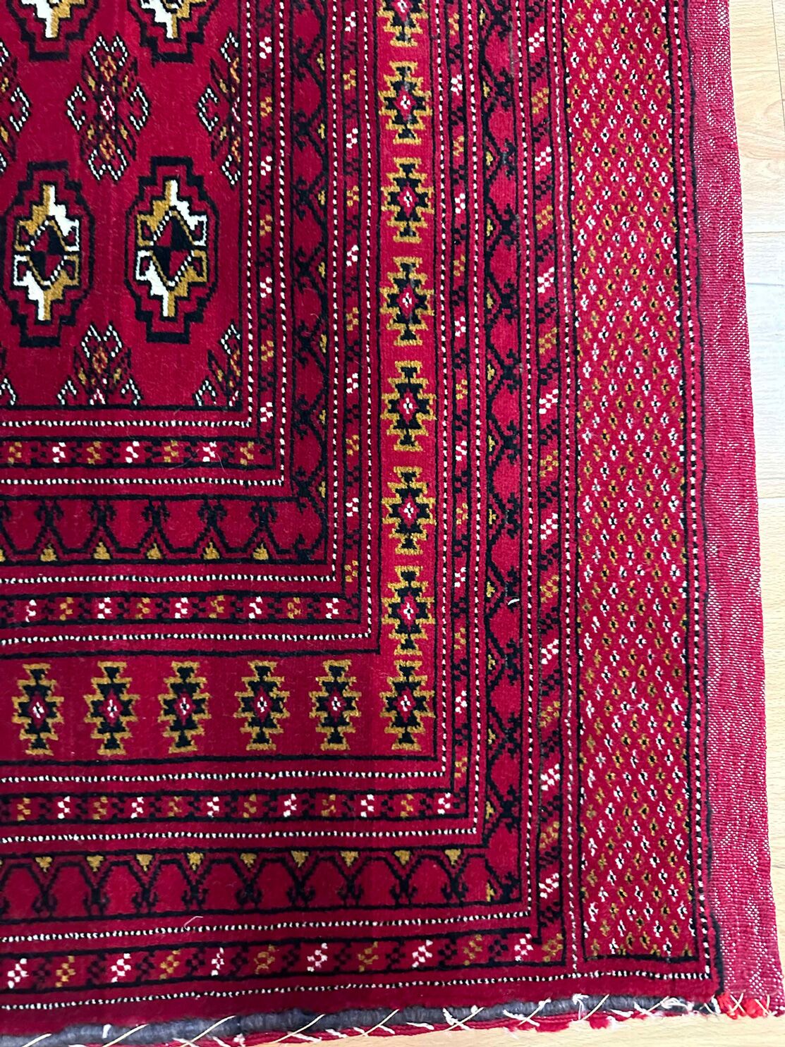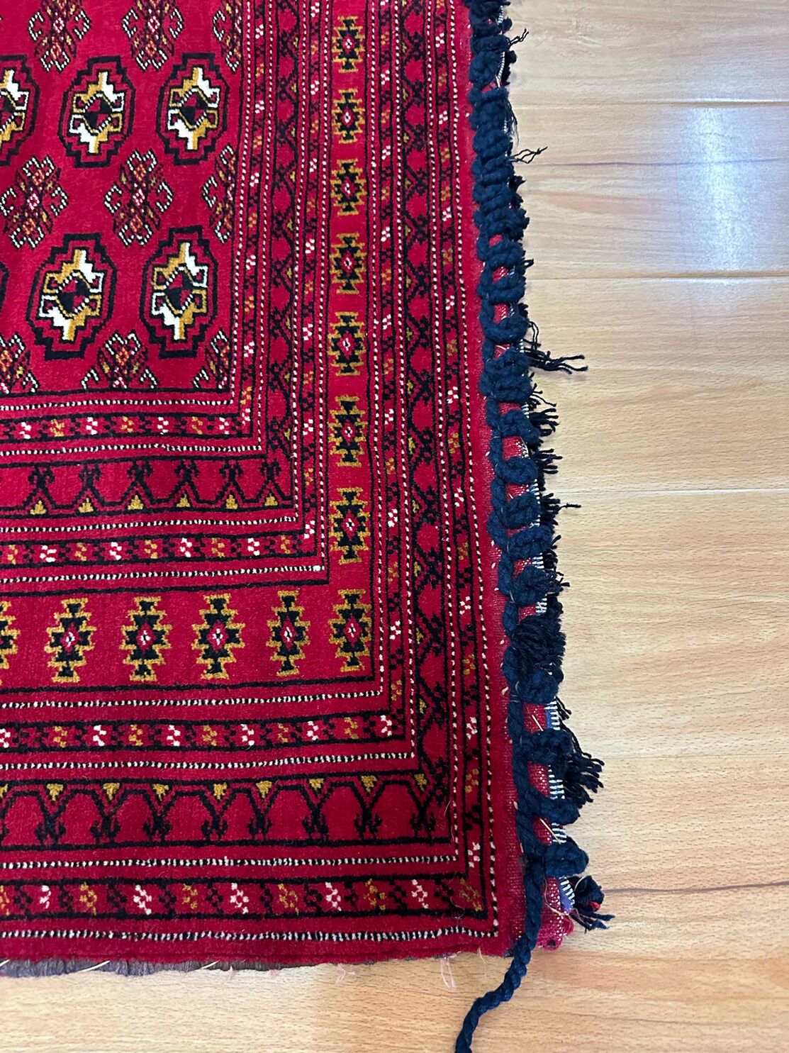 • Rich Heritage: Crafted with pure hand-spun wool on a durable cotton base, this Poshti features deep red hues and intricate Bokhara patterns, dyed using traditional techniques, preserving its authenticity and charm.