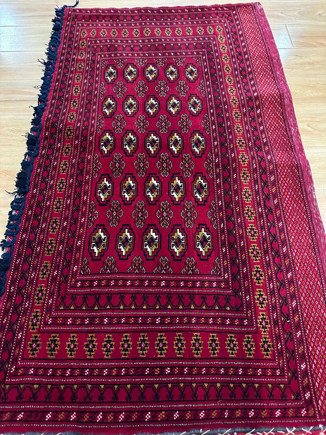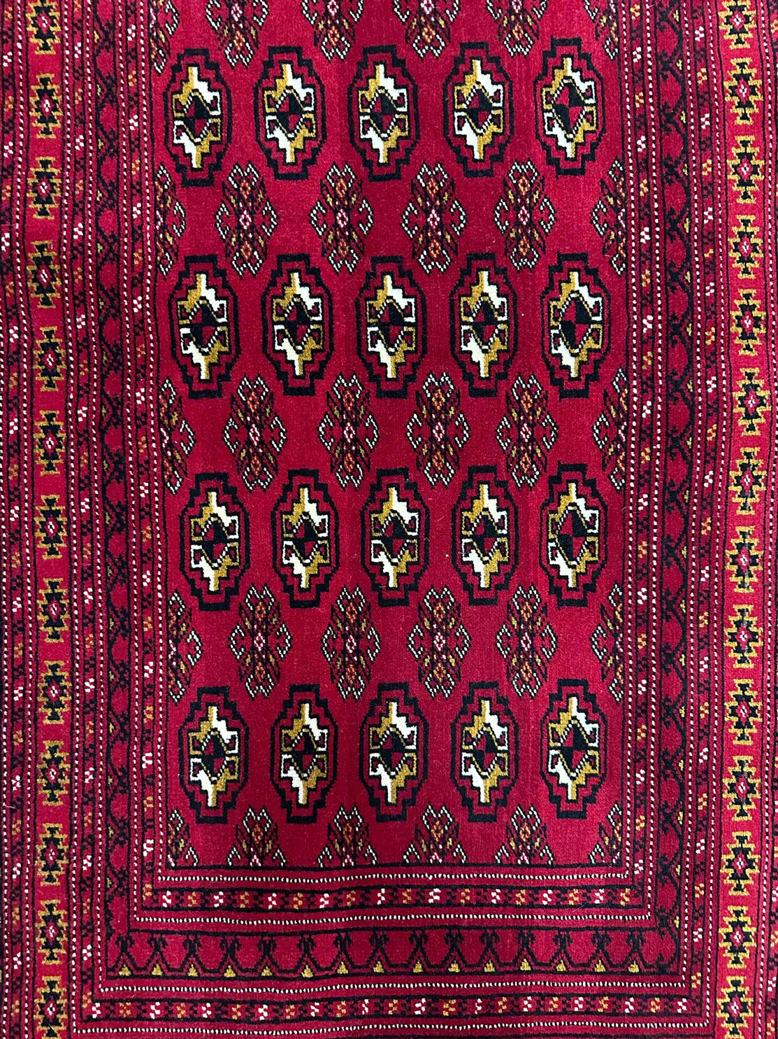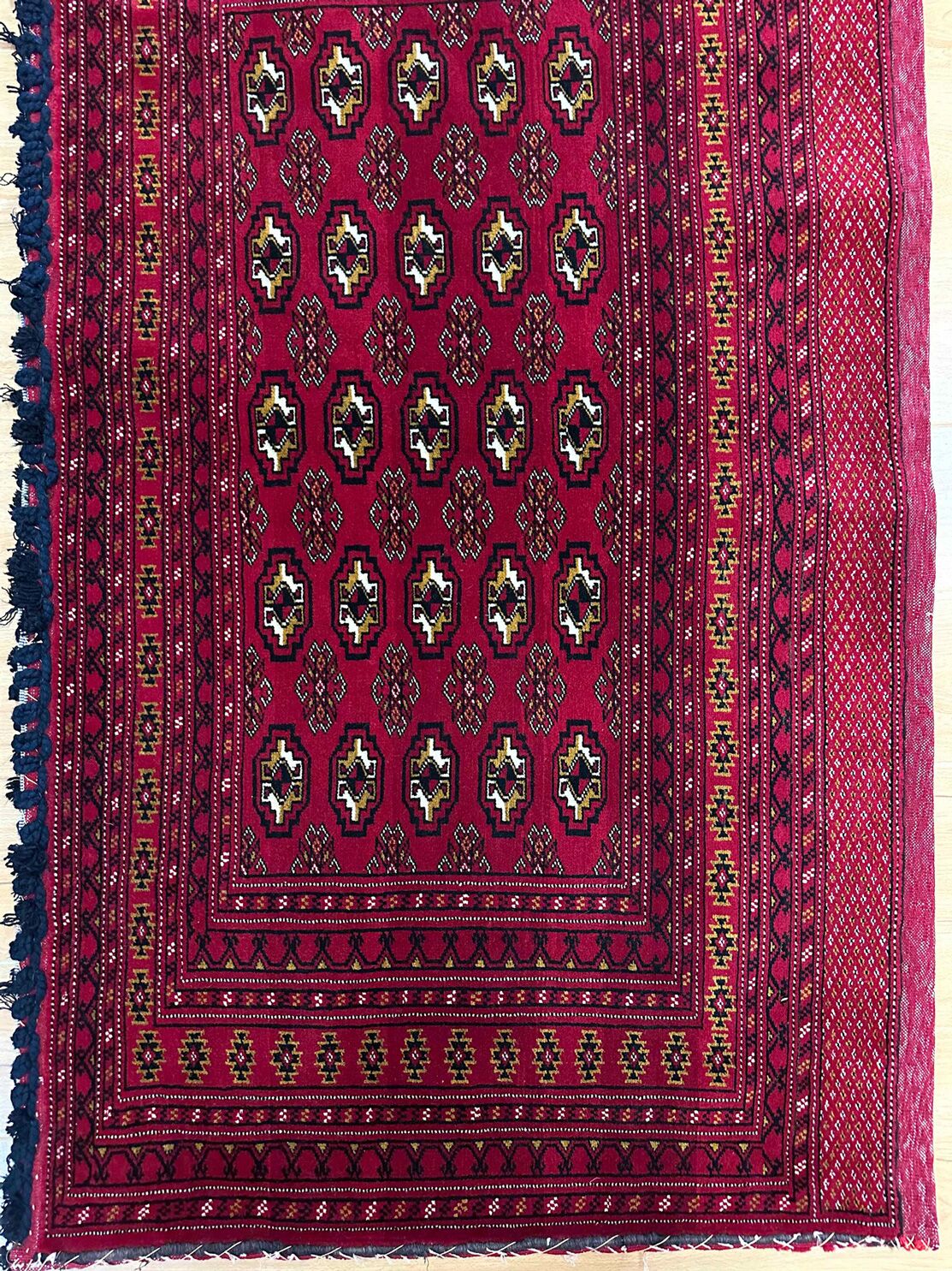 • Rich Heritage: Crafted with pure hand-spun wool on a durable cotton base, this Poshti features deep red hues and intricate Bokhara patterns, dyed using traditional techniques, preserving its authenticity and charm.