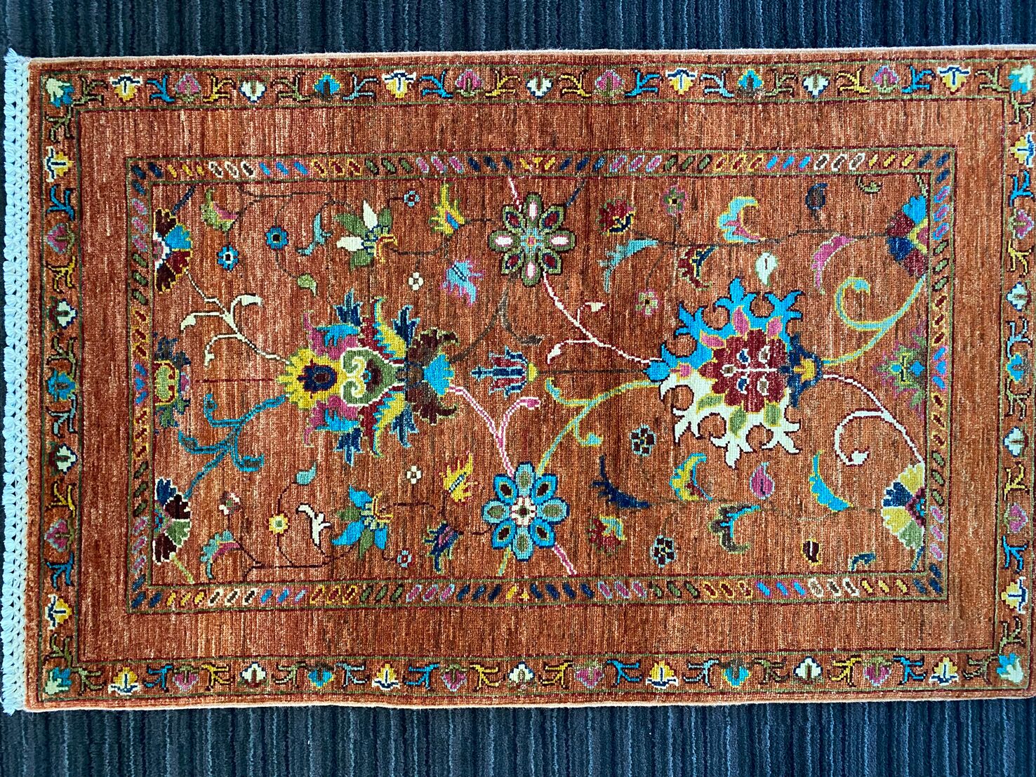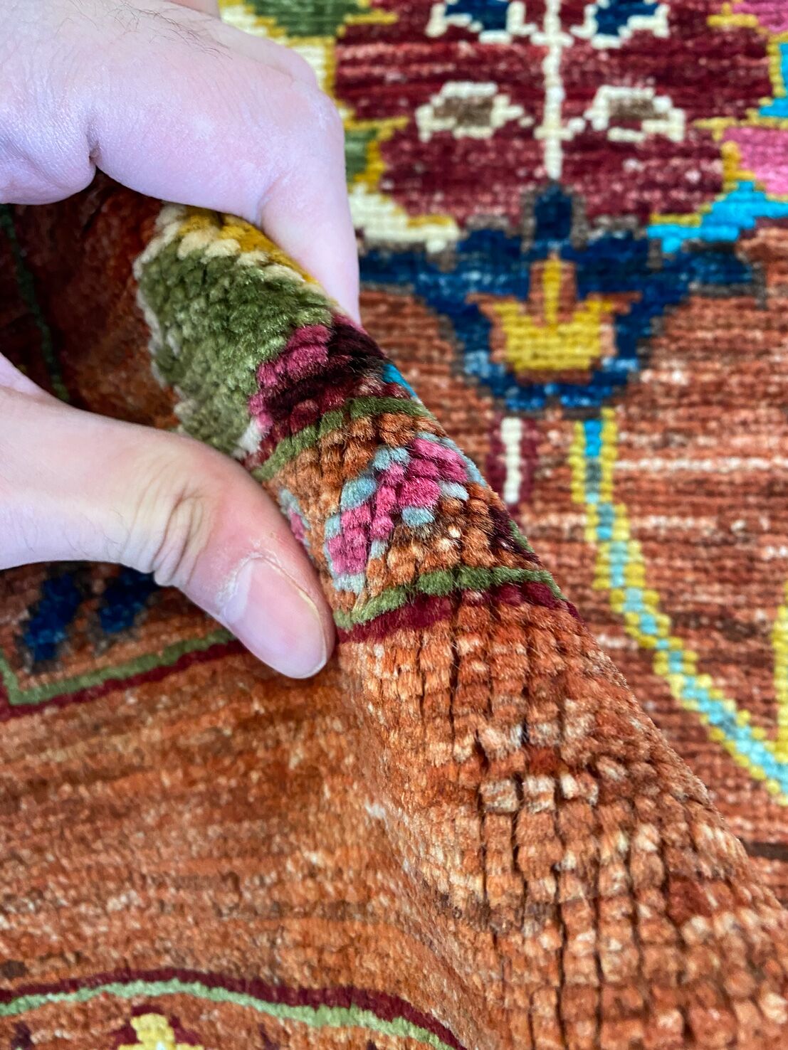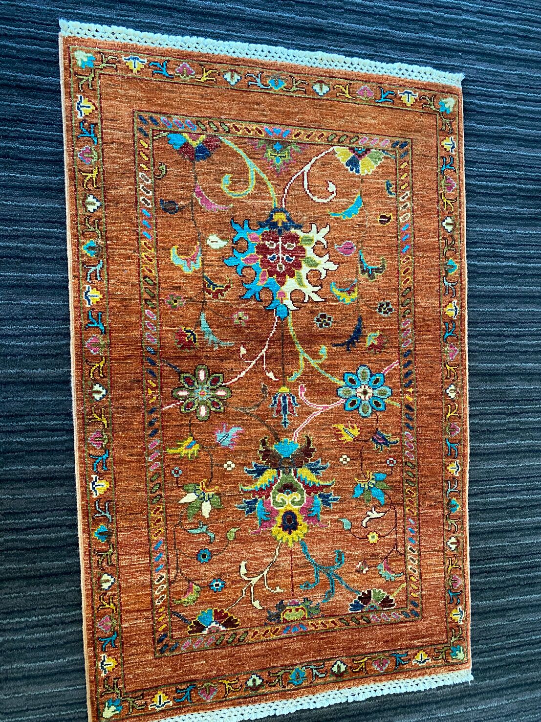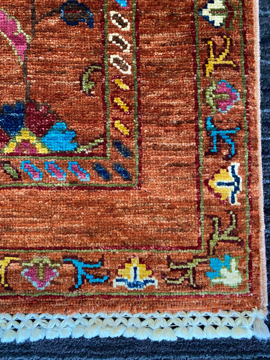 – Stunning Small Size Golden Brown Tone Super Kazak Rug: A rare find in this size, featuring pure hand-spun wool pile on a cotton base. Exquisite brown tones dyed using traditional methods (vegetable dyes), representing the last of true woven tribal art.