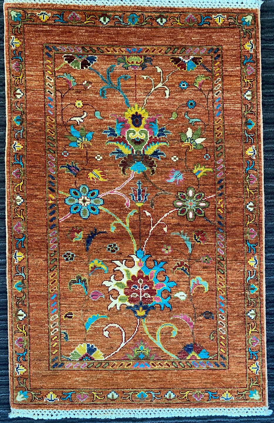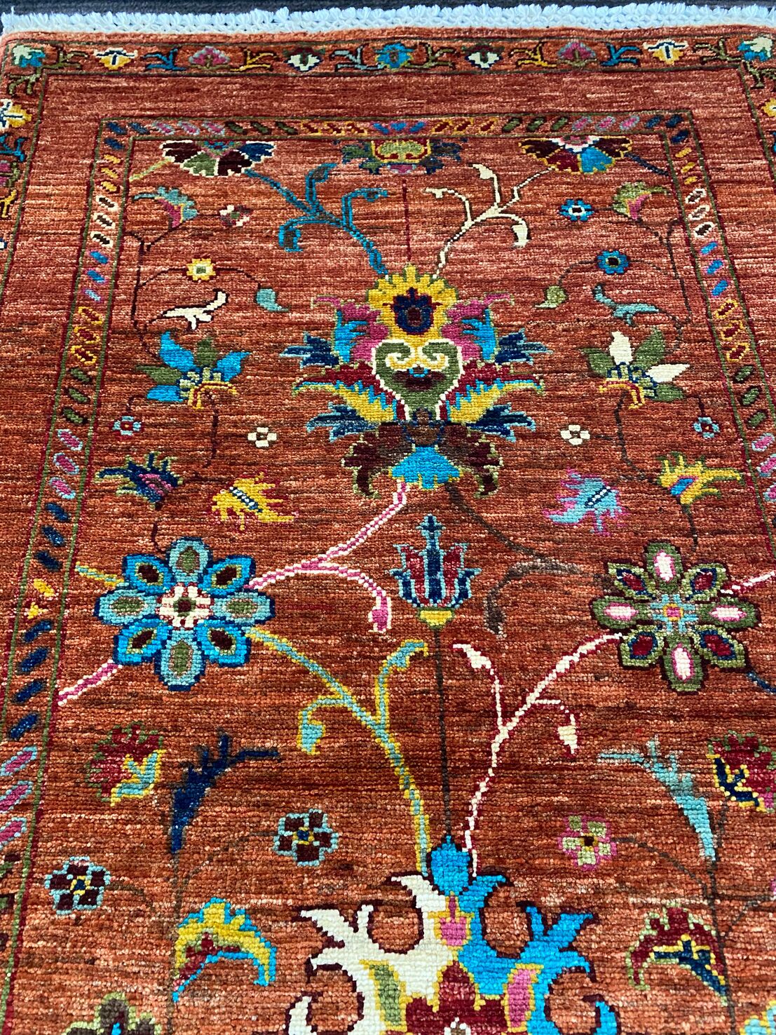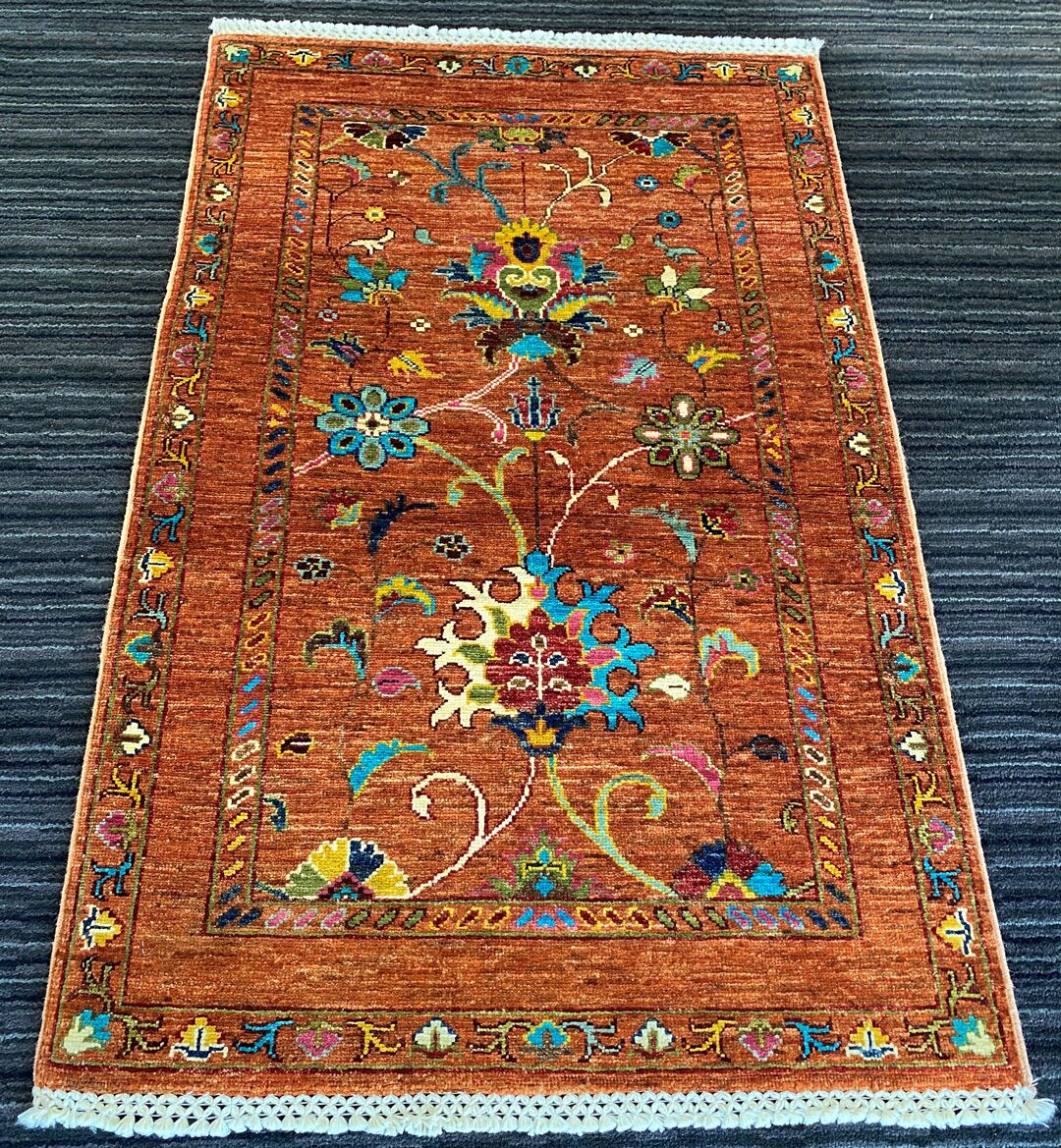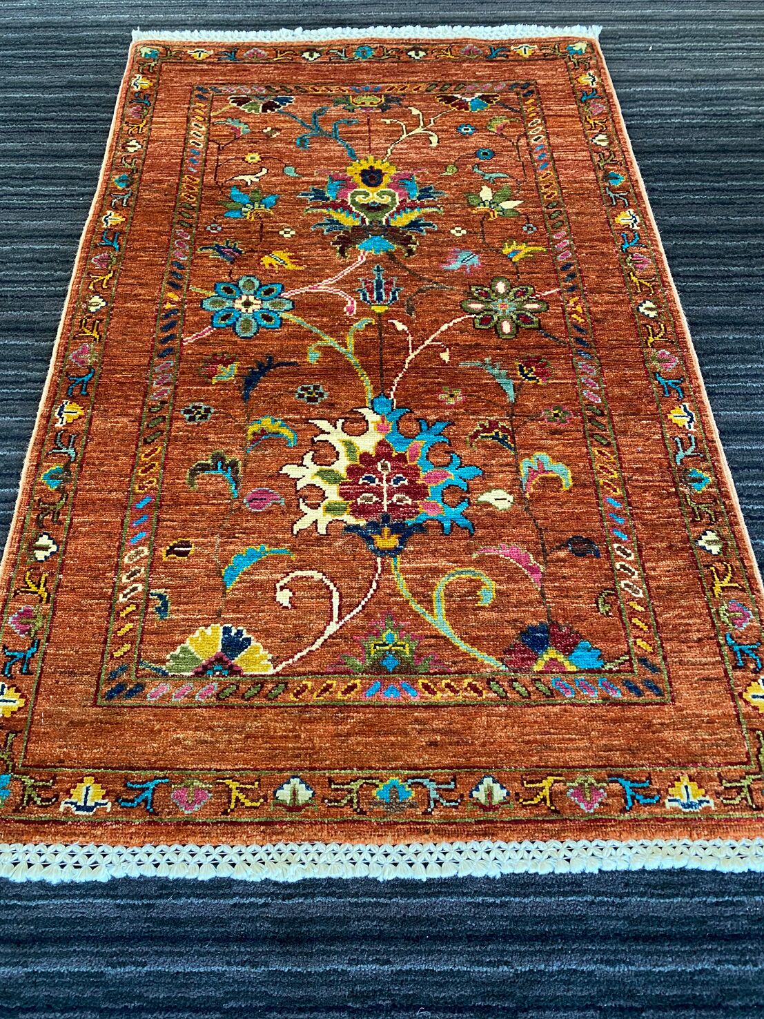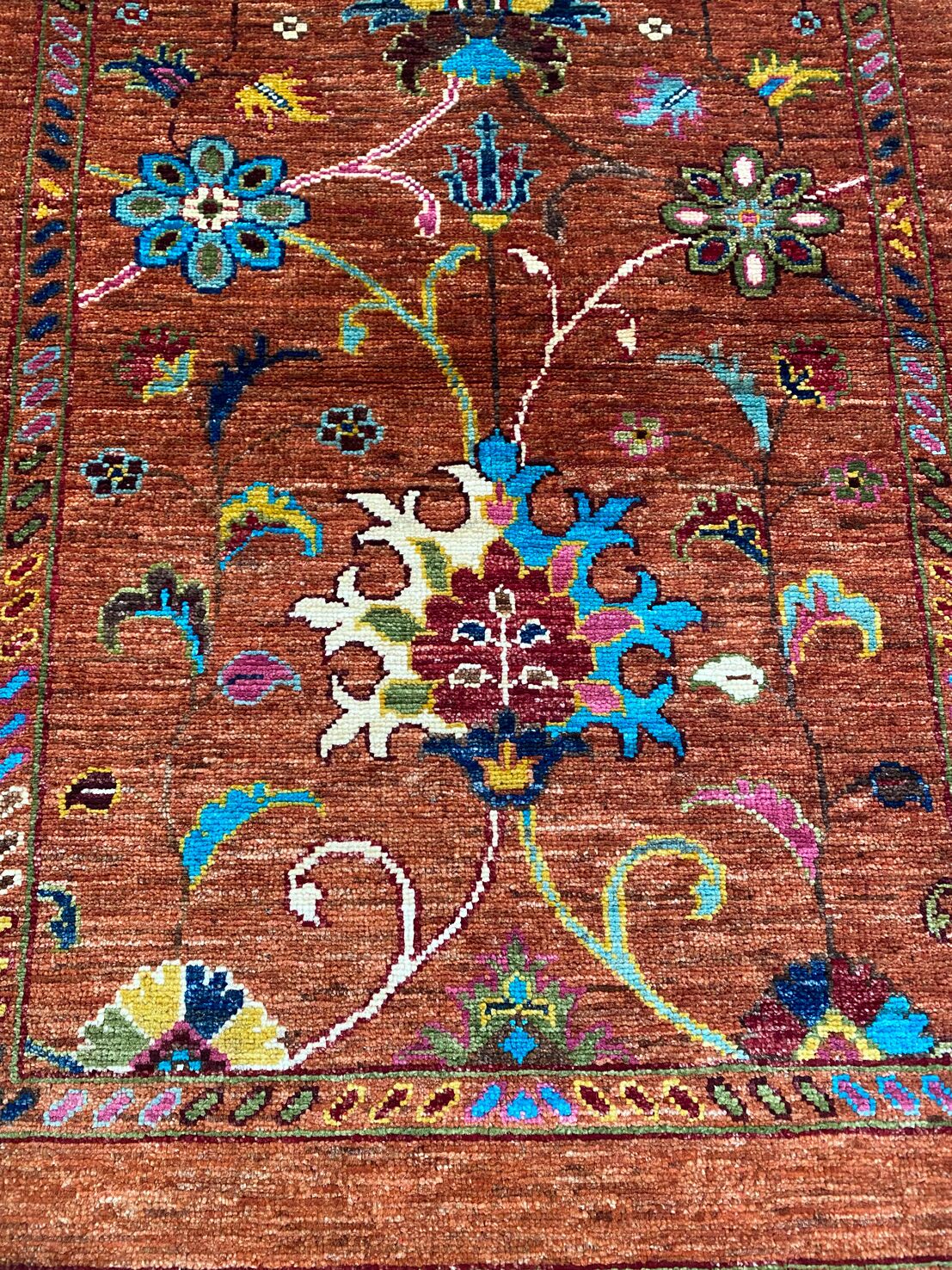 – Stunning Small Size Golden Brown Tone Super Kazak Rug: A rare find in this size, featuring pure hand-spun wool pile on a cotton base. Exquisite brown tones dyed using traditional methods (vegetable dyes), representing the last of true woven tribal art.