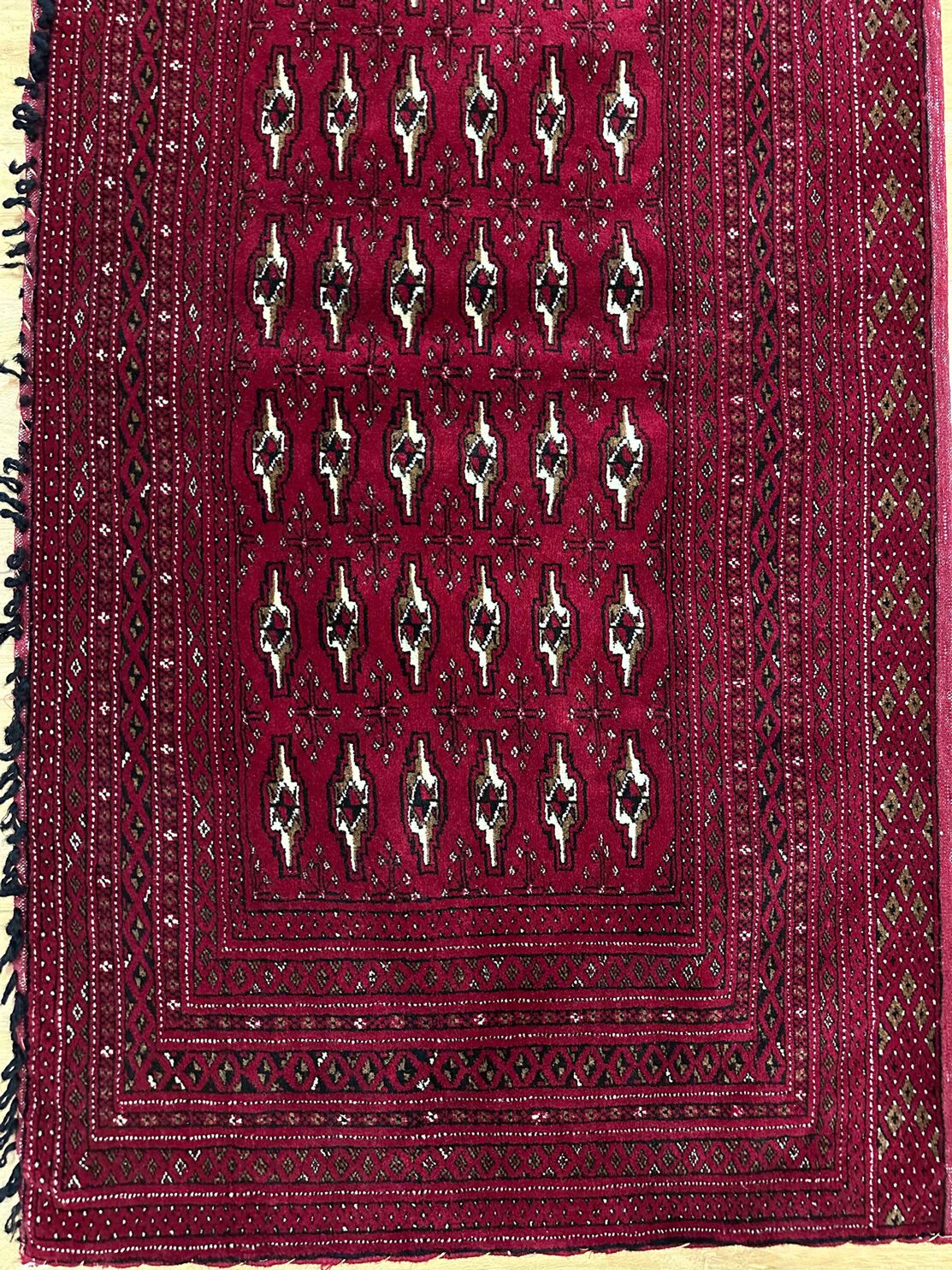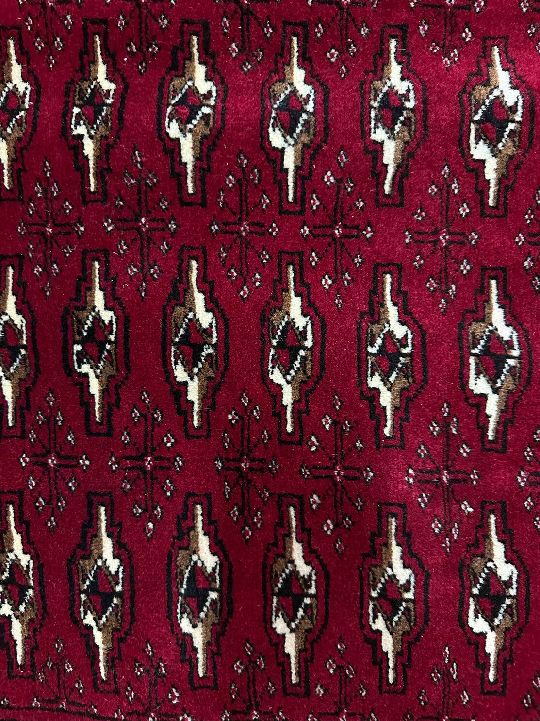 • Rich Heritage: Crafted with pure hand-spun wool on a durable cotton base, this Poshti features deep red hues and intricate Bokhara patterns, dyed using traditional techniques, preserving its authenticity and charm.