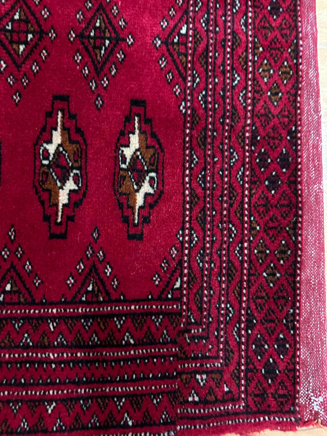 • Rich Heritage: Crafted with pure hand-spun wool on a durable cotton base, this Poshti features deep red hues and intricate Bokhara patterns, dyed using traditional techniques, preserving its authenticity and charm.