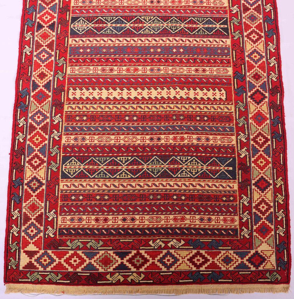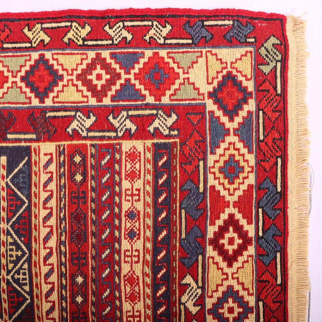 – Artistic Craftsmanship: Immerse yourself in the beauty of a Persian Ardebil Sumak Kilim Runner Rug, featuring three weaving techniques and a pure hand-spun wool pile with silk on a wool base.