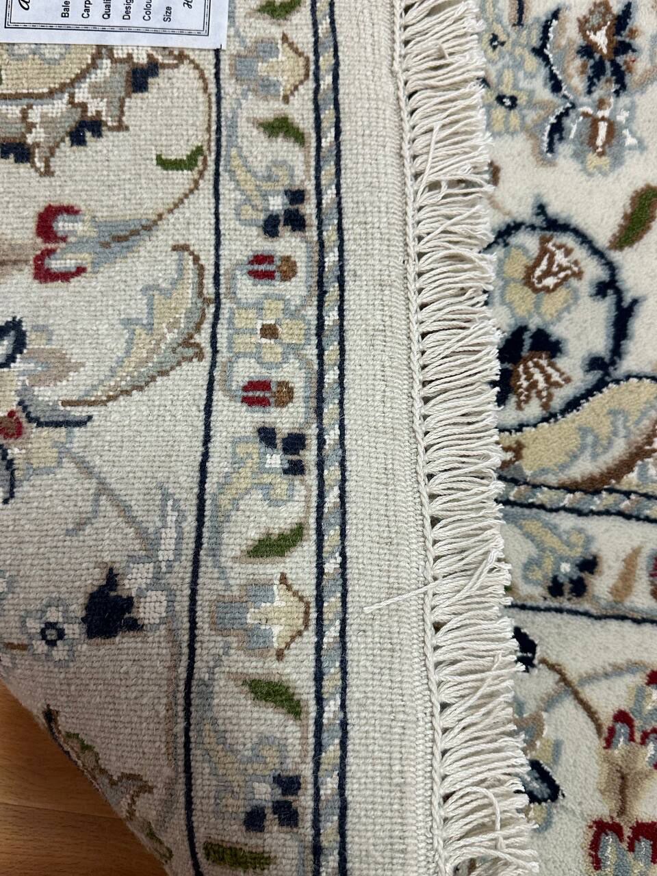 – Timeless Beauty: Add sophistication to your home with this brand-new, full-pile hand-knotted Indian rug, featuring a refined Nain design. Made from pure wool and silk-like blend on a cotton base, it showcases vibrant tones of Light Blue, creamy ivory, and light tones vegetable dyed using traditional methods.
