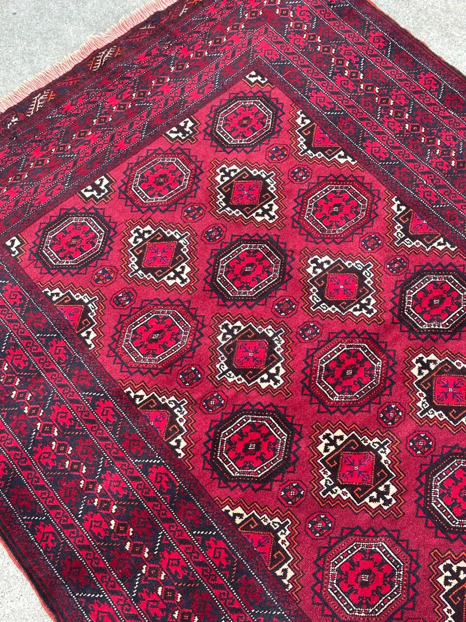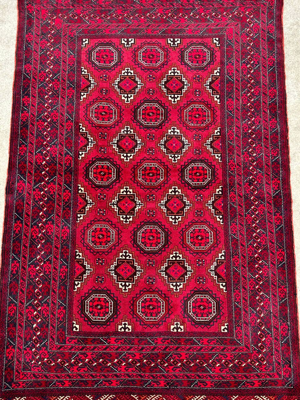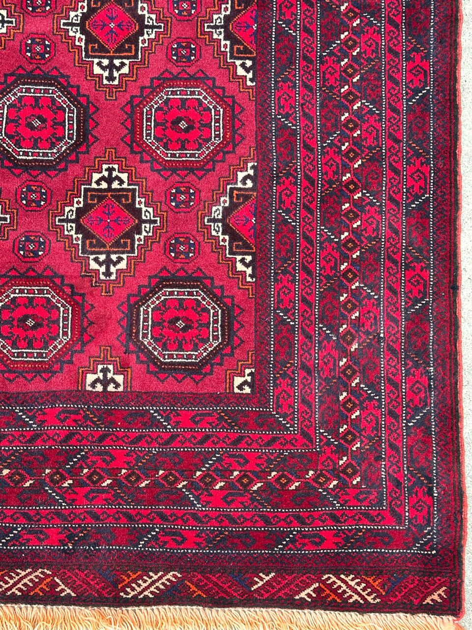 – Tribal Elegance: Immerse your space in the tribal elegance of this hand-knotted Turkoman rug. Crafted with pure hand-spun wool pile on a cotton base, it features a red tone dyed using traditional methods.
