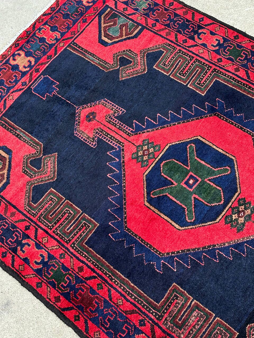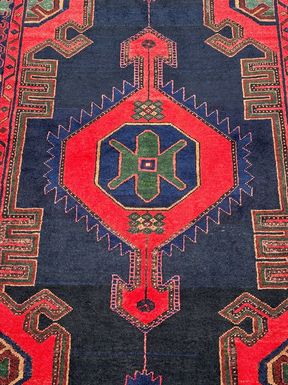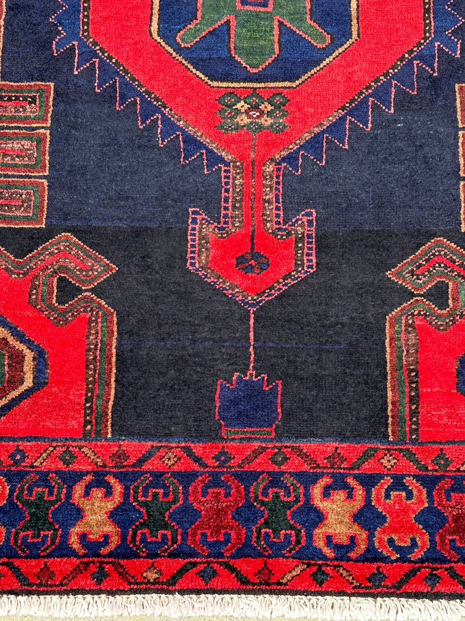 – Unique Tribal Beauty: Discover the unique tribal beauty of this hand-knotted Persian Hamadan rug. Rare in design, it boasts pure hand-spun wool pile on a cotton base, featuring a deep indigo blue tone dyed using traditional methods.