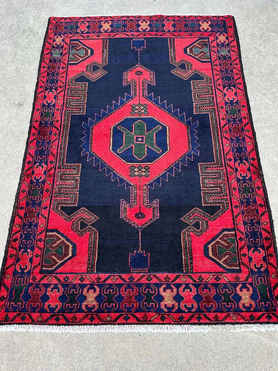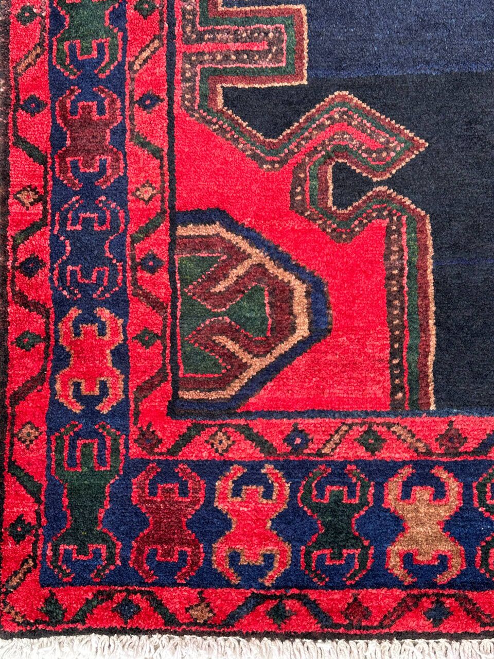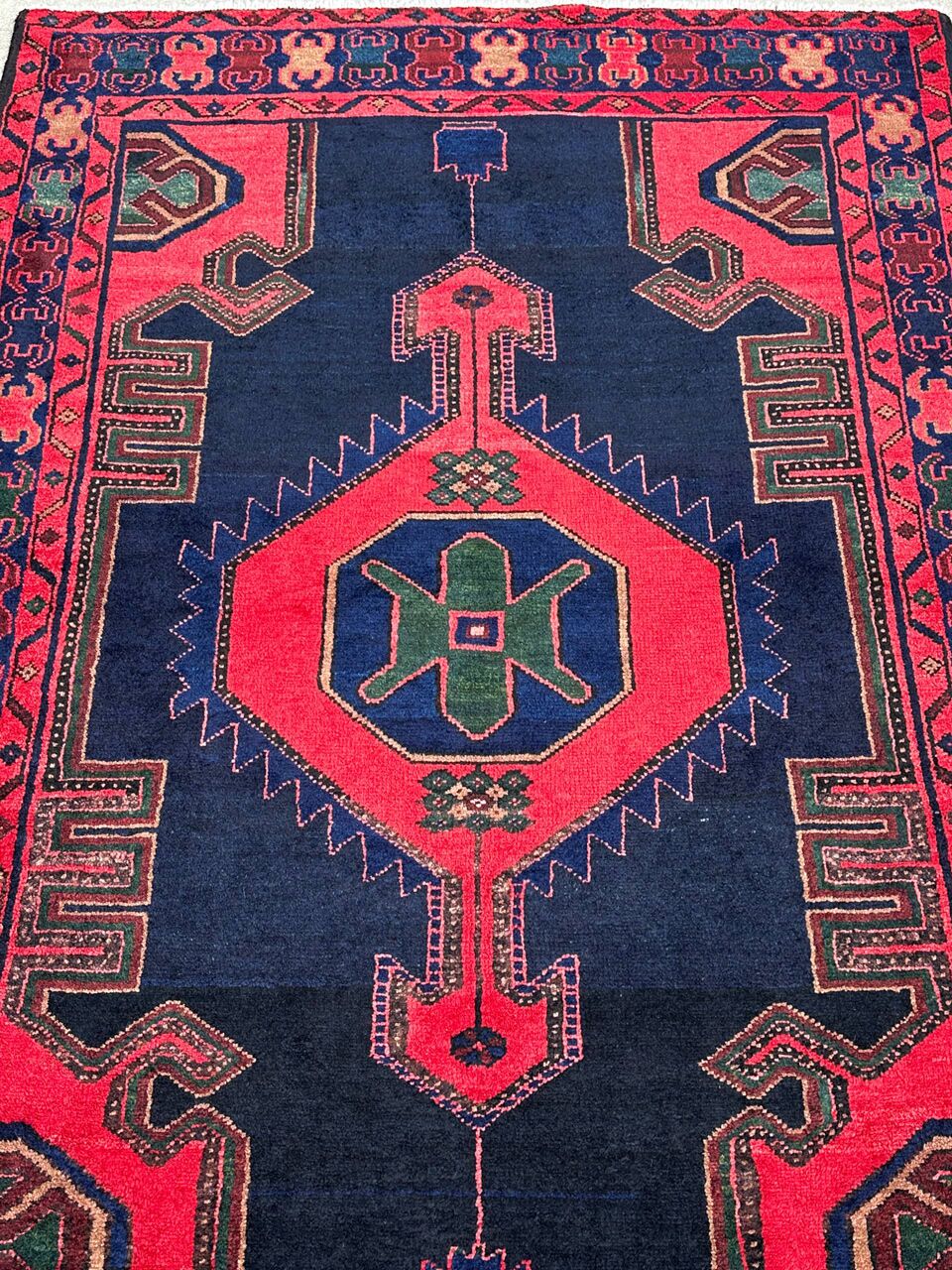 – Unique Tribal Beauty: Discover the unique tribal beauty of this hand-knotted Persian Hamadan rug. Rare in design, it boasts pure hand-spun wool pile on a cotton base, featuring a deep indigo blue tone dyed using traditional methods.