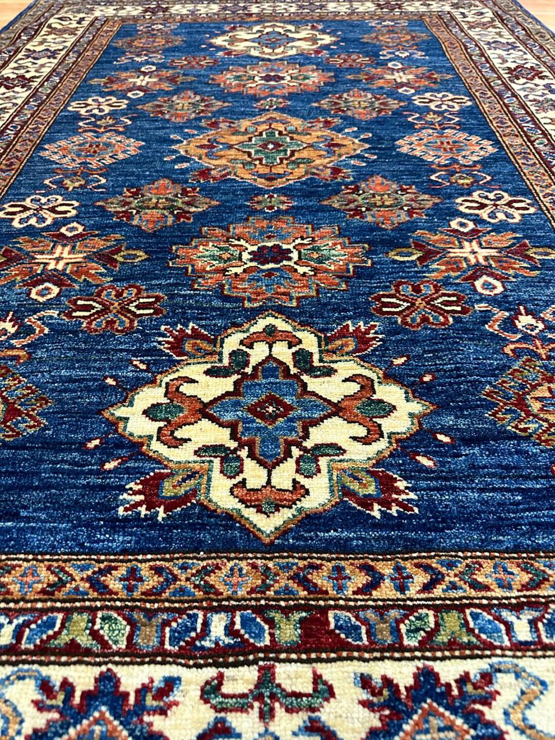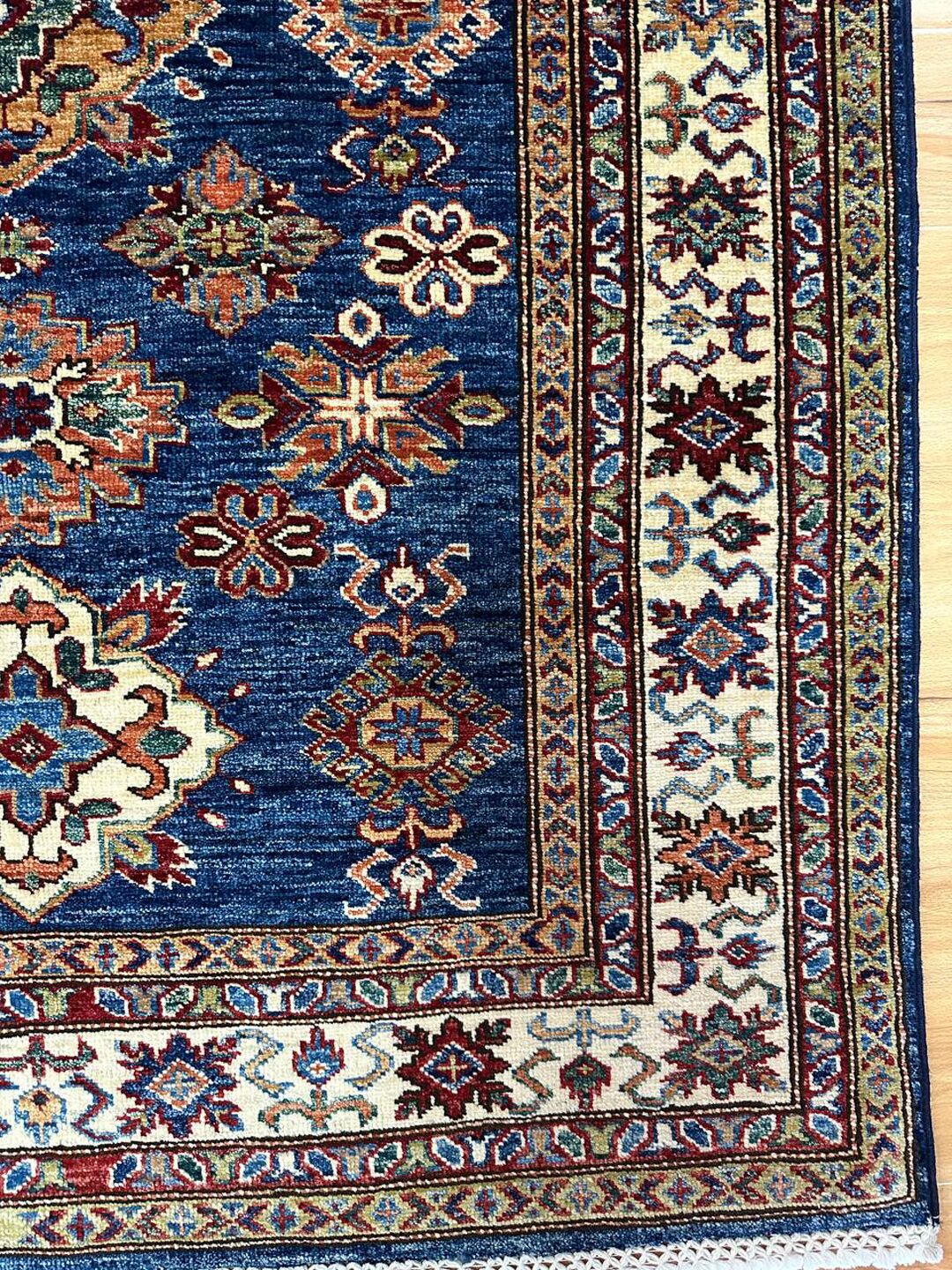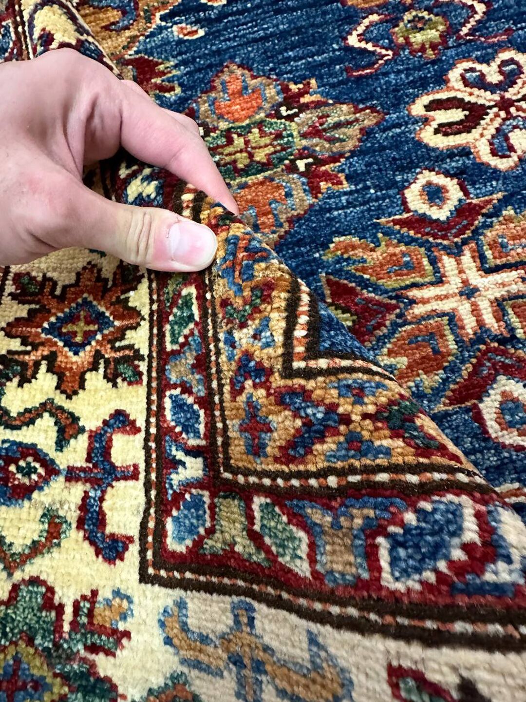 • Design: Showcases a beautiful geometric Caucasian design in blue, beige, yellow, green, and maroon tones, dyed using traditional vegetable dye methods.