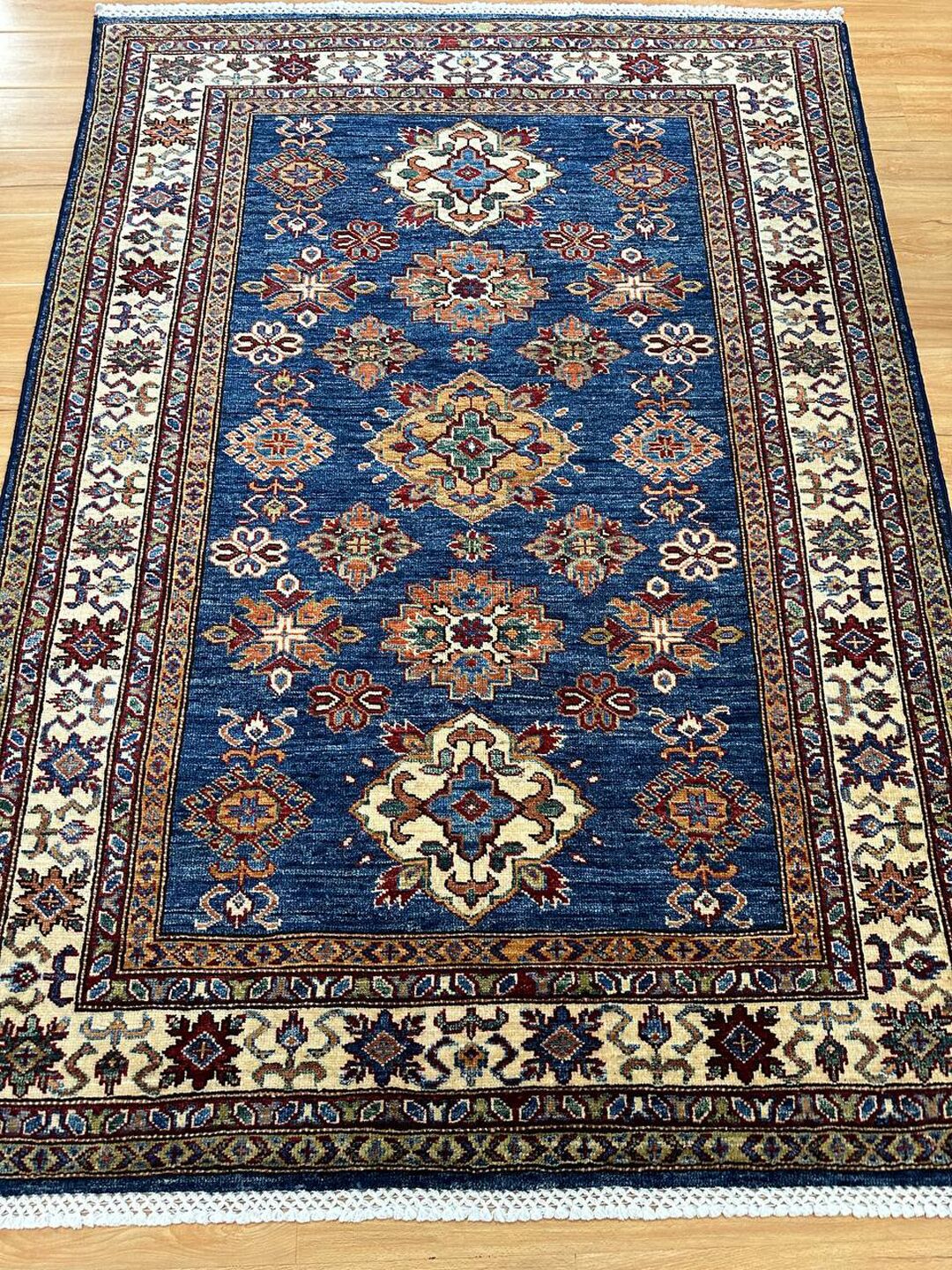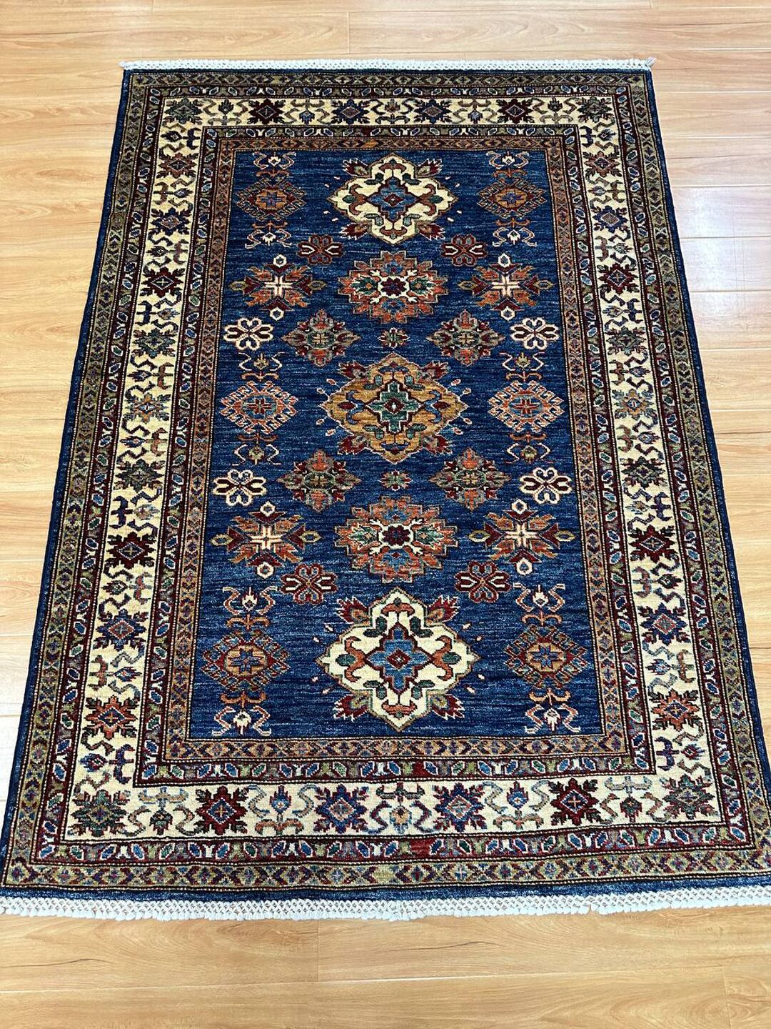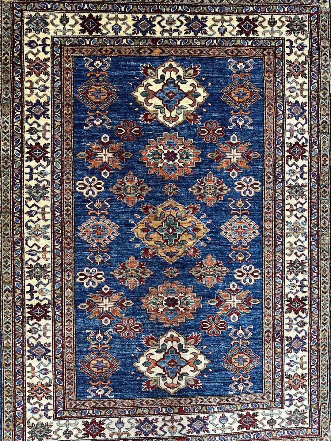 • Design: Showcases a beautiful geometric Caucasian design in blue, beige, yellow, green, and maroon tones, dyed using traditional vegetable dye methods.