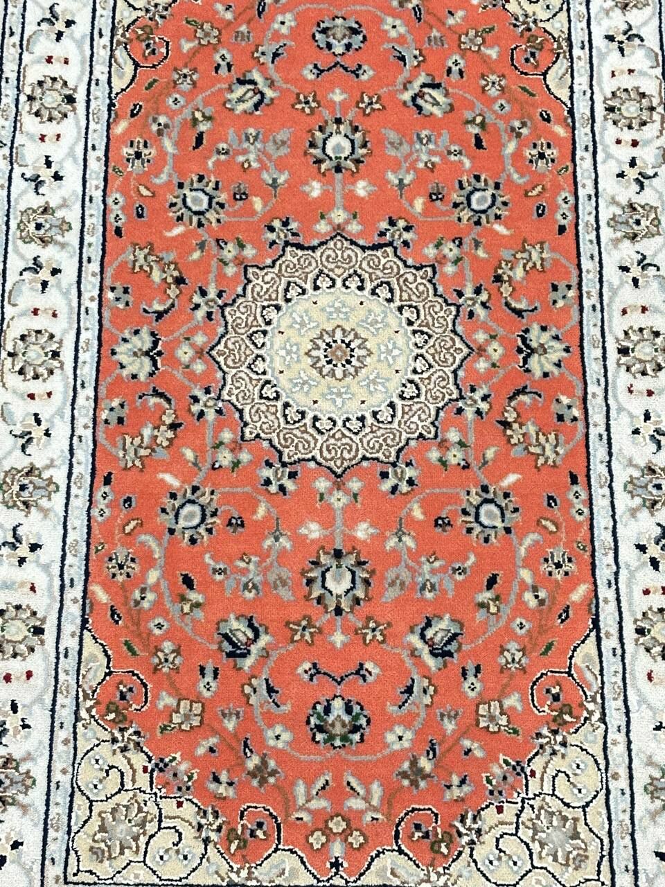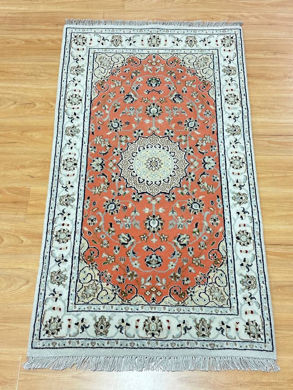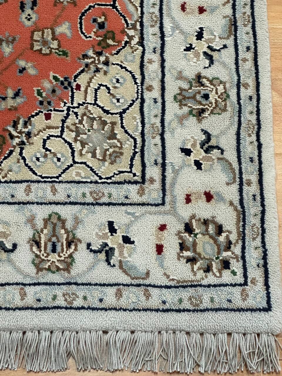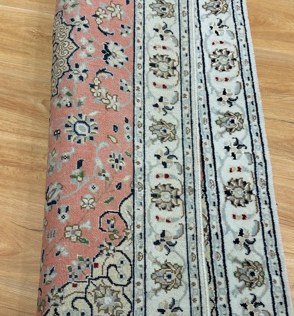 – Timeless Beauty: Add sophistication to your home with this brand-new, full-pile hand-knotted Indian rug, featuring a refined Nain design. Made from pure wool and silk-like blend on a cotton base, it showcases vibrant tones of Salmon Pink, creamy ivory, and light tones vegetable dyed using traditional methods.