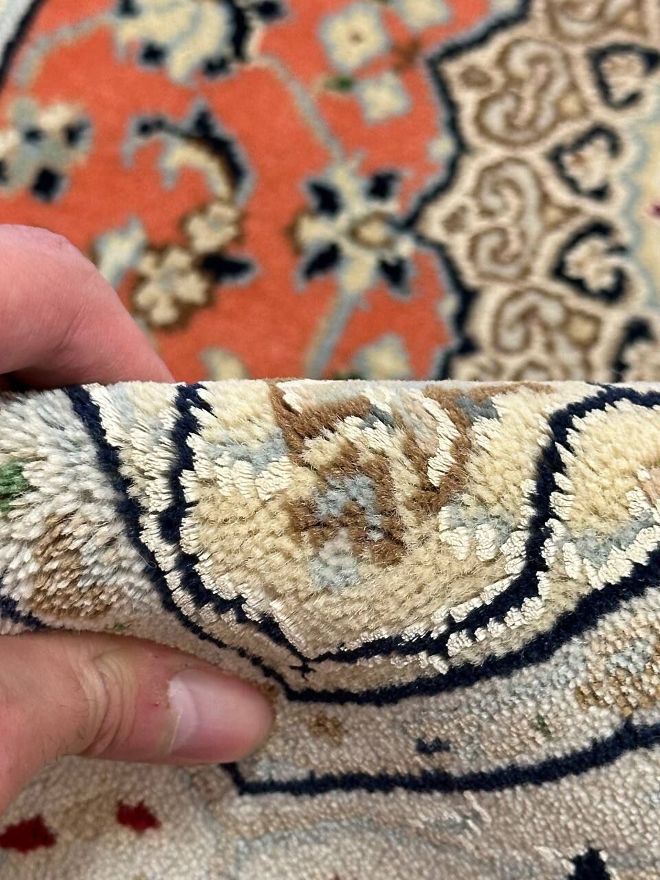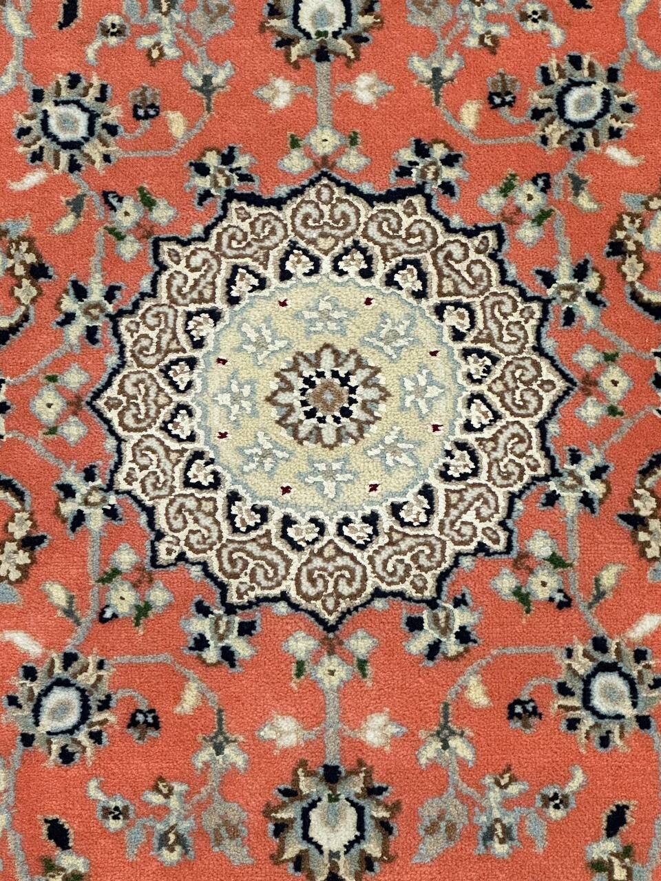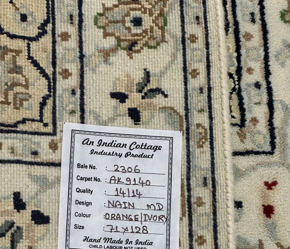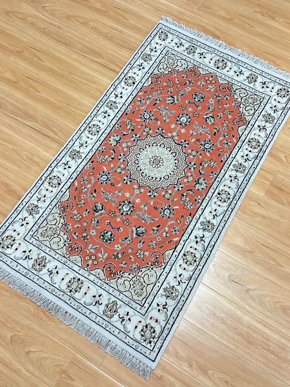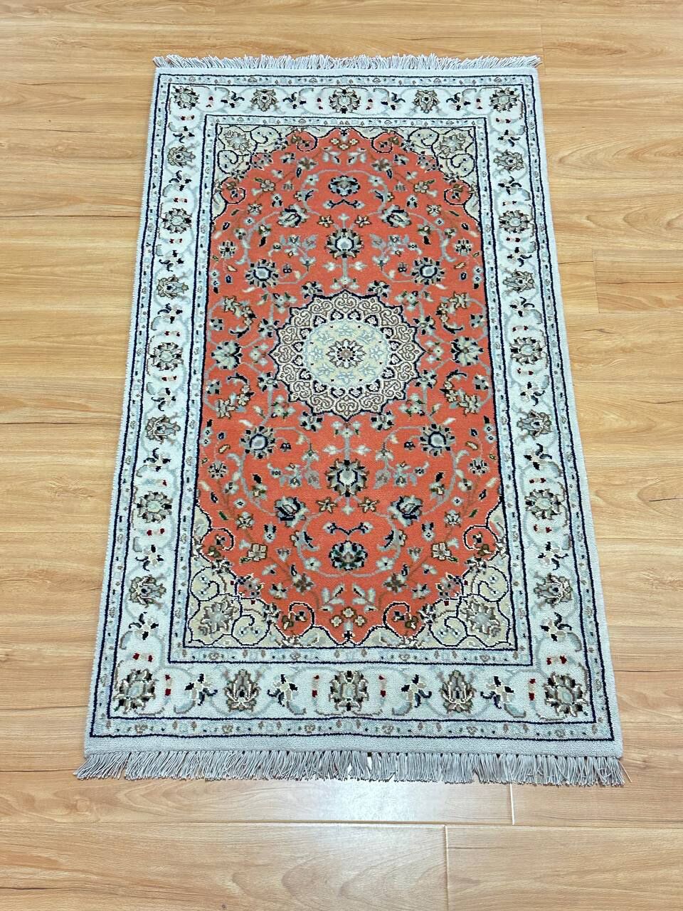 – Timeless Beauty: Add sophistication to your home with this brand-new, full-pile hand-knotted Indian rug, featuring a refined Nain design. Made from pure wool and silk-like blend on a cotton base, it showcases vibrant tones of Salmon Pink, creamy ivory, and light tones vegetable dyed using traditional methods.