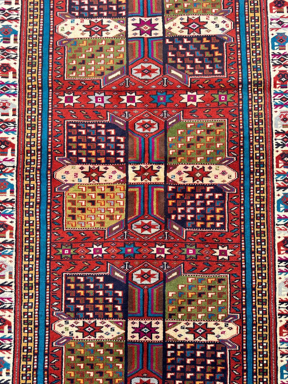 – Colors: The vibrant red and beige and blue tones, dyed using traditional methods, adds warmth and character to this unique piece.
