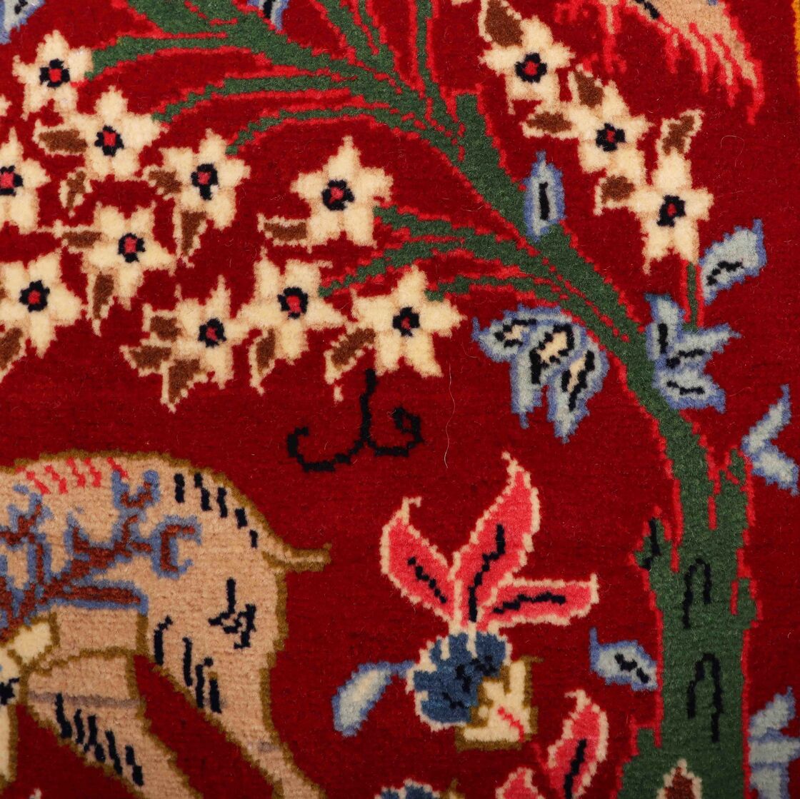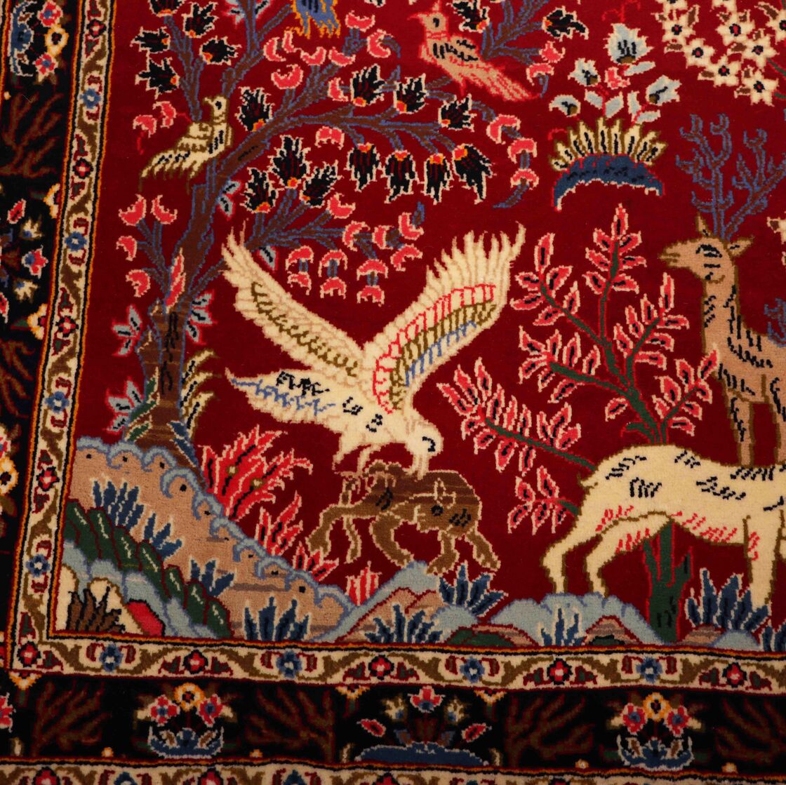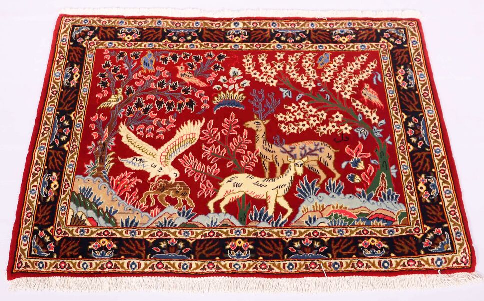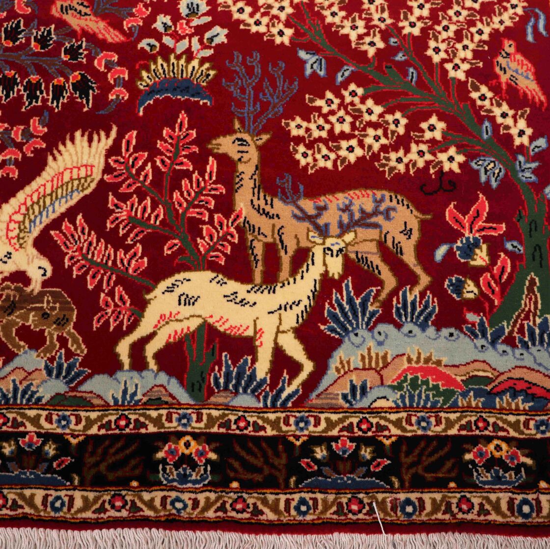 – Authentic Elegance: Discover the rarity of an authentic handmade Hunting Design Persian Kashmar rug, a unique design that’s not easily found among original handmade Persian rugs.
