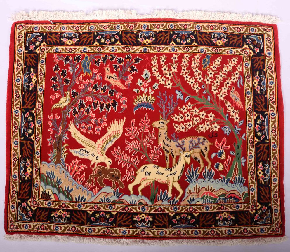 – Authentic Elegance: Discover the rarity of an authentic handmade Hunting Design Persian Kashmar rug, a unique design that’s not easily found among original handmade Persian rugs.