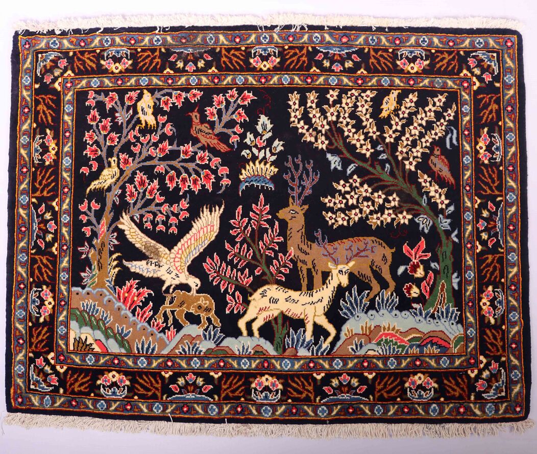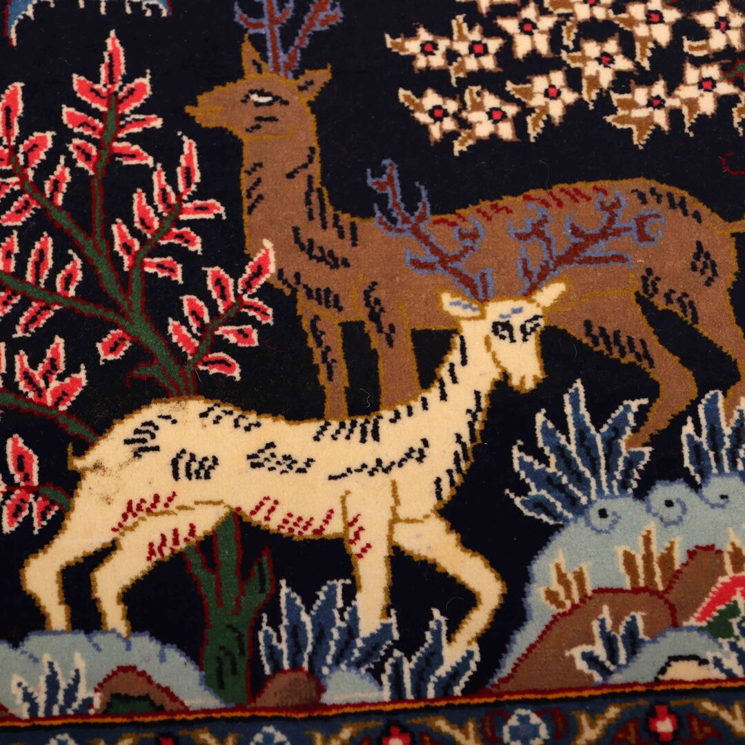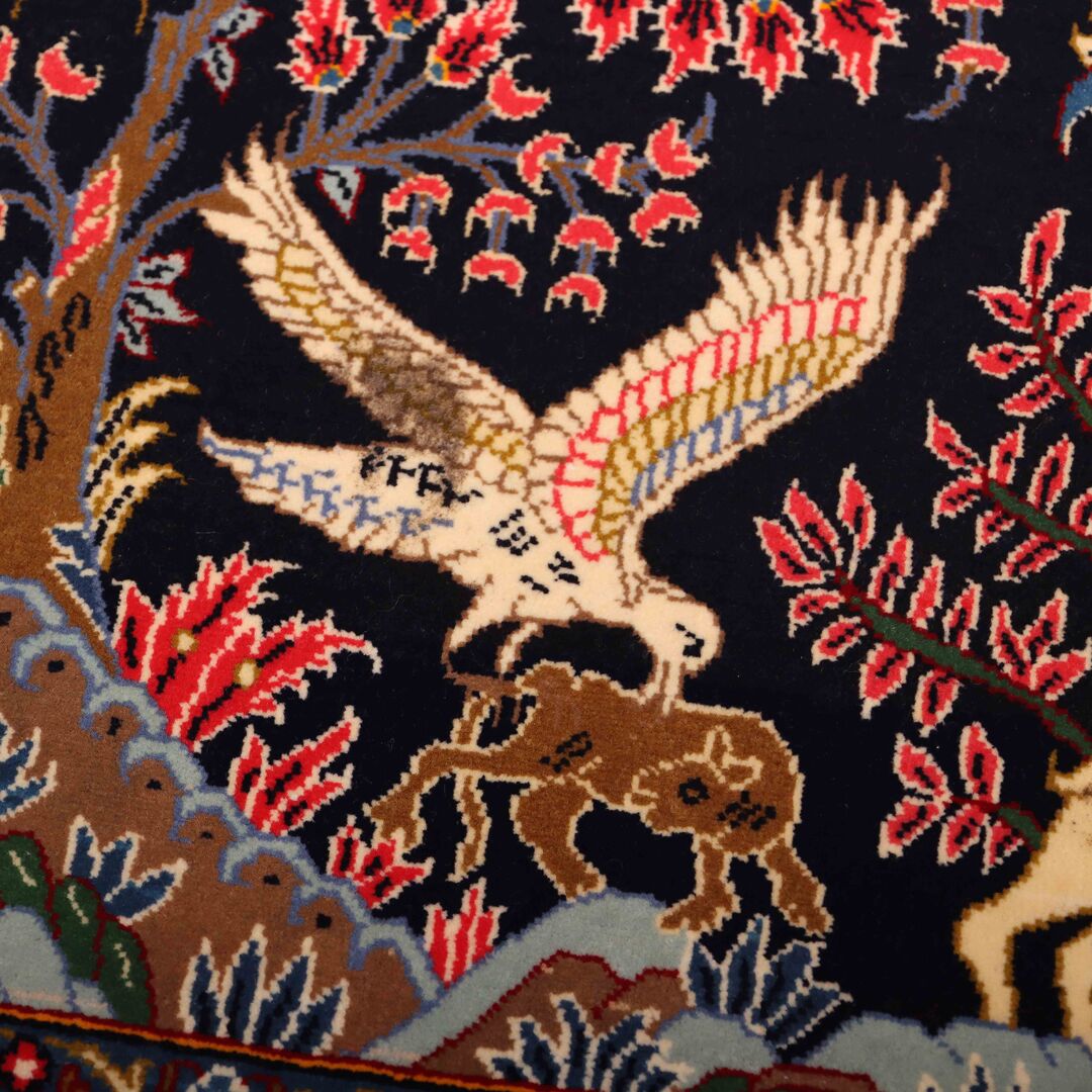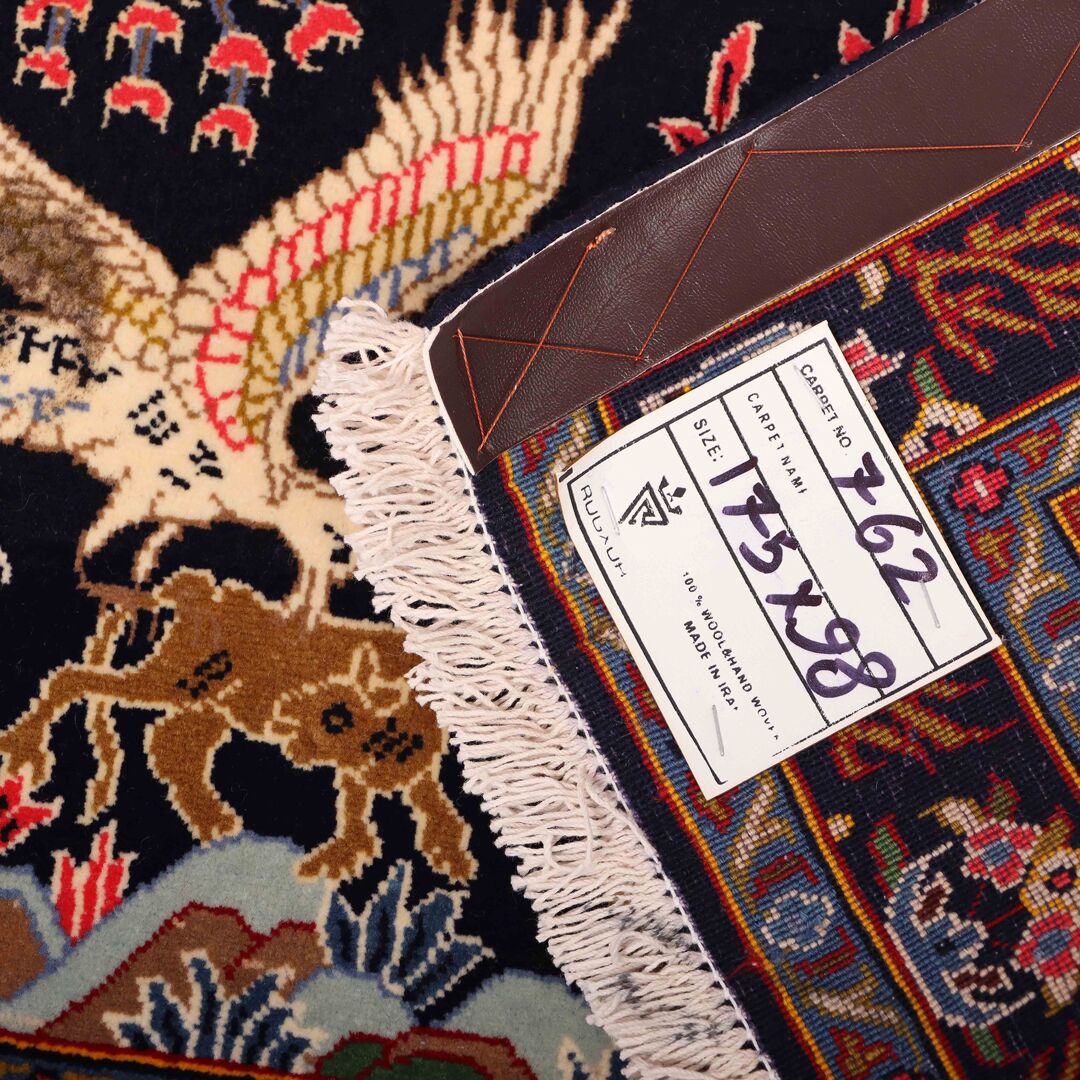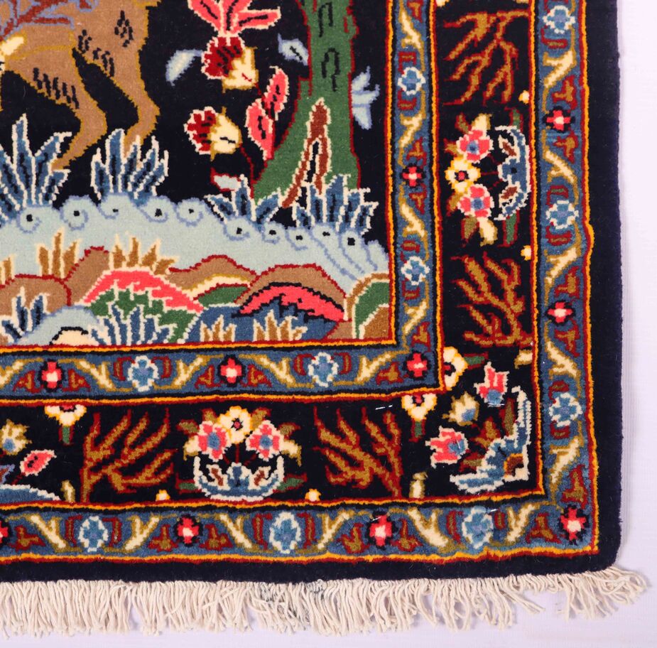 – Authentic Elegance: Discover the rarity of an authentic handmade Hunting Design Persian Kashmar rug, a unique design that’s not easily found among original handmade Persian rugs.