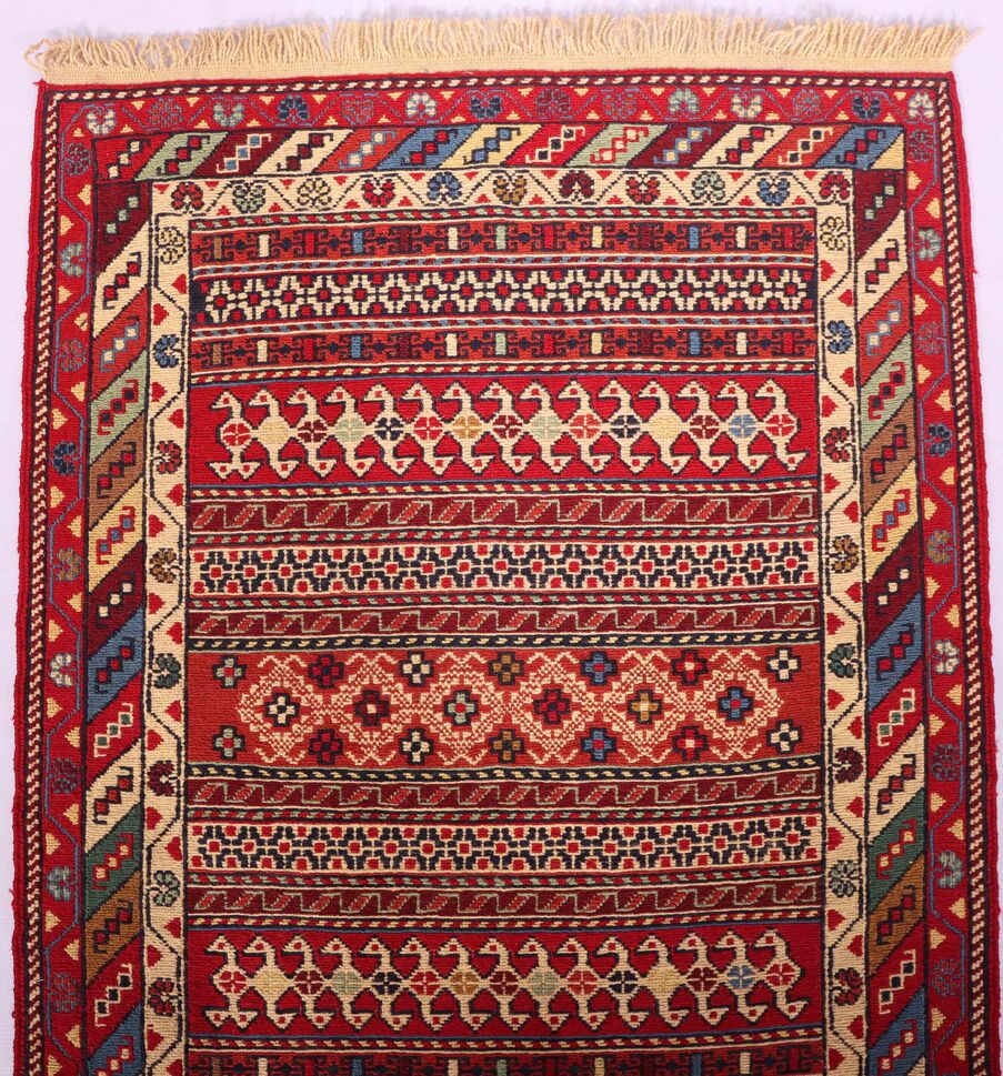 – Artistic Craftsmanship: Immerse yourself in the beauty of a Persian Ardebil Sumak Kilim Runner Rug, featuring three weaving techniques and a pure hand-spun wool pile with silk on a wool base.
