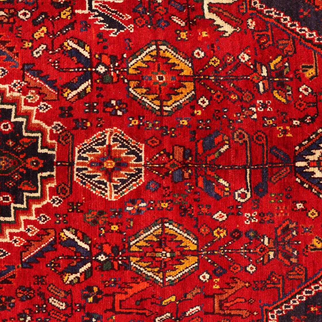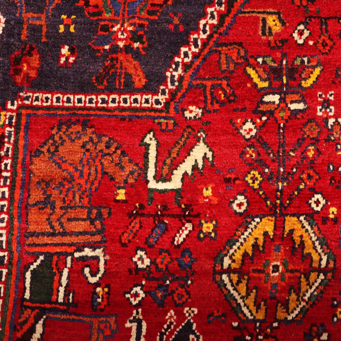 – Timeless Elegance: Immerse your space in the timeless elegance of this certified hand-knotted Persian Qashghai Shiraz rug. A wide, heavy-quality piece with a dense pile that promises durability for generations. The rug features pure hand-spun wool pile on a wool base, showcasing a deep red tone dyed using traditional methods.
