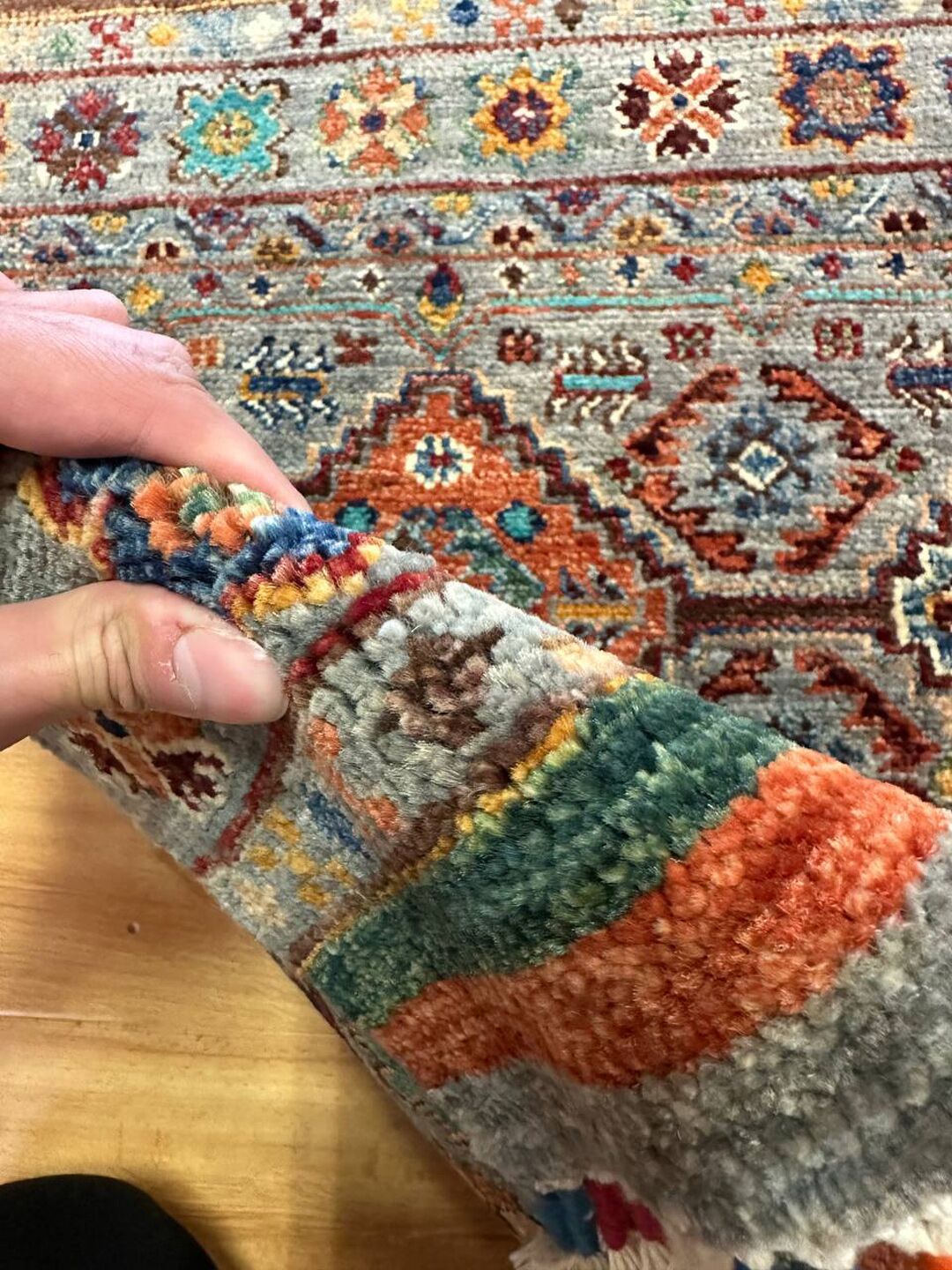 Note: Photographed in standard interior lighting; colors may appear 5-10% brighter or darker in person. Each side of this handmade rug shows subtle color variations, showcasing its unique craftsmanship.