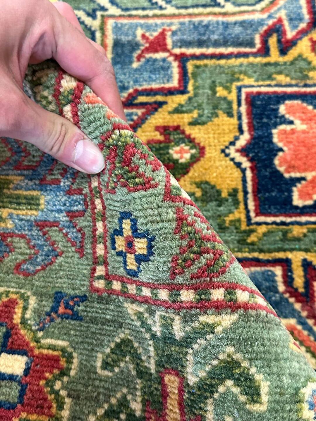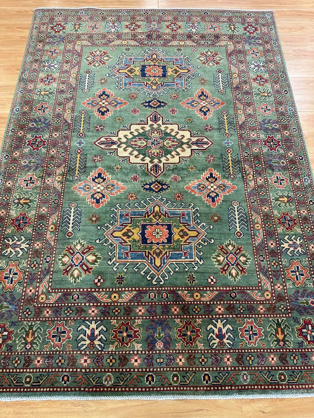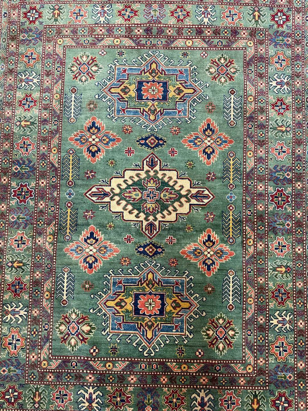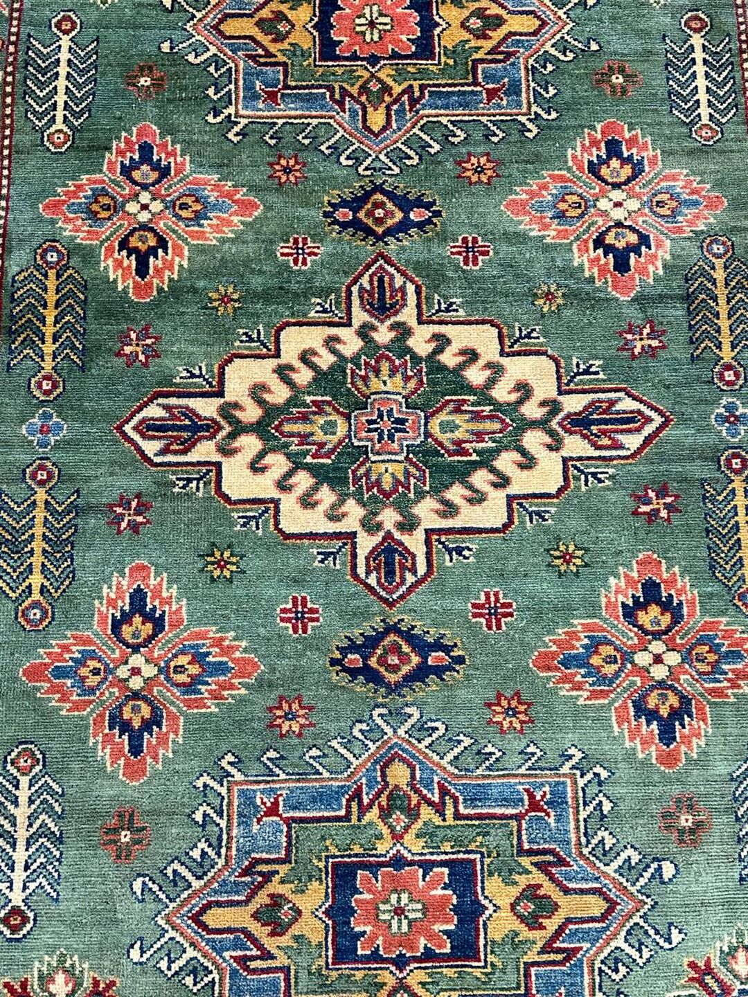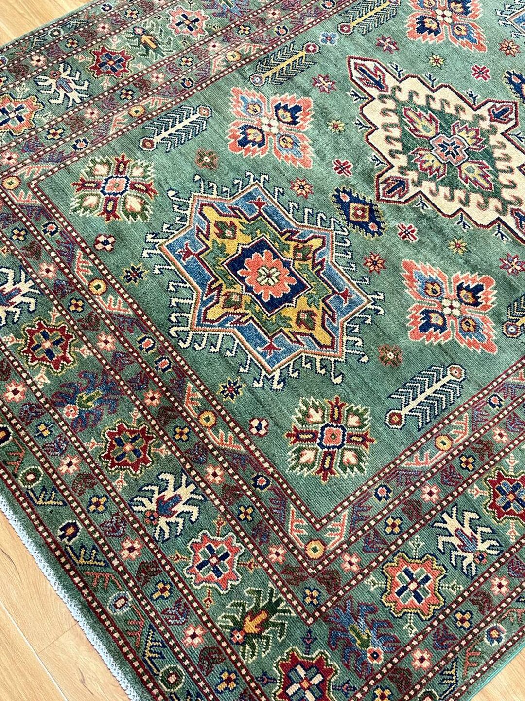 • Design: Showcases a beautiful geometric Caucasian design in green, beige, yellow, green, and maroon tones, dyed using traditional vegetable dye methods.