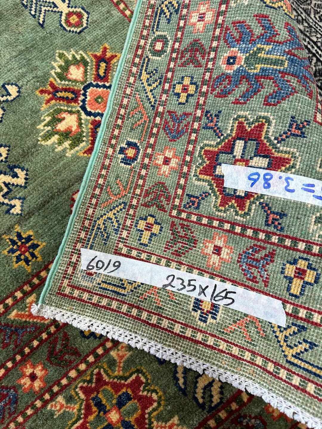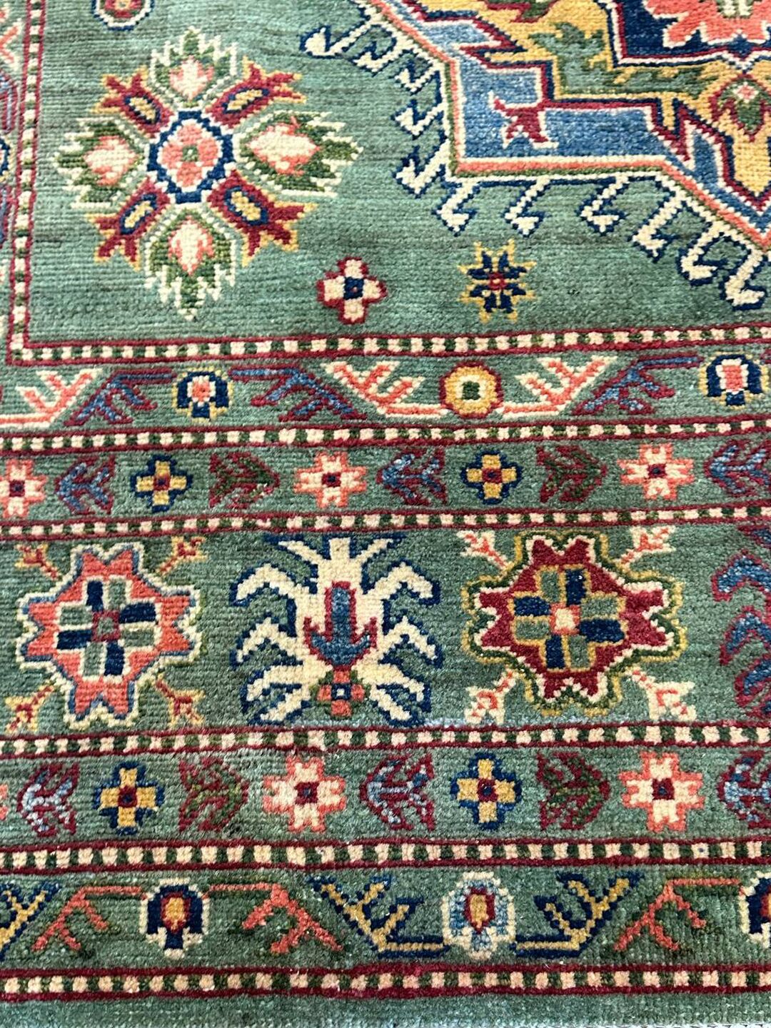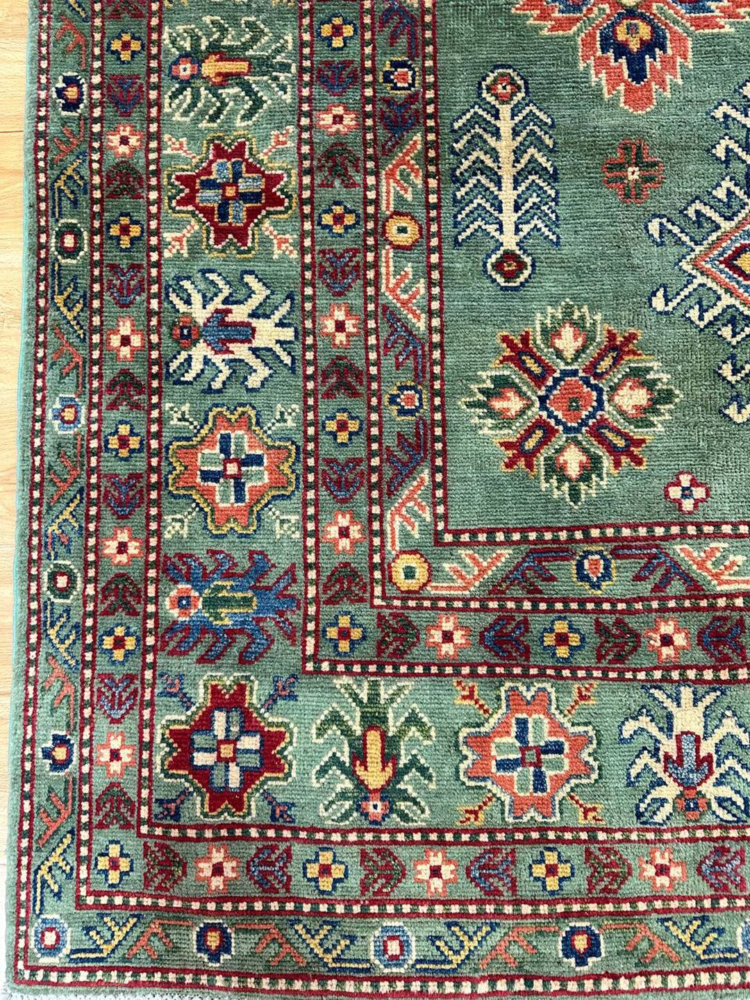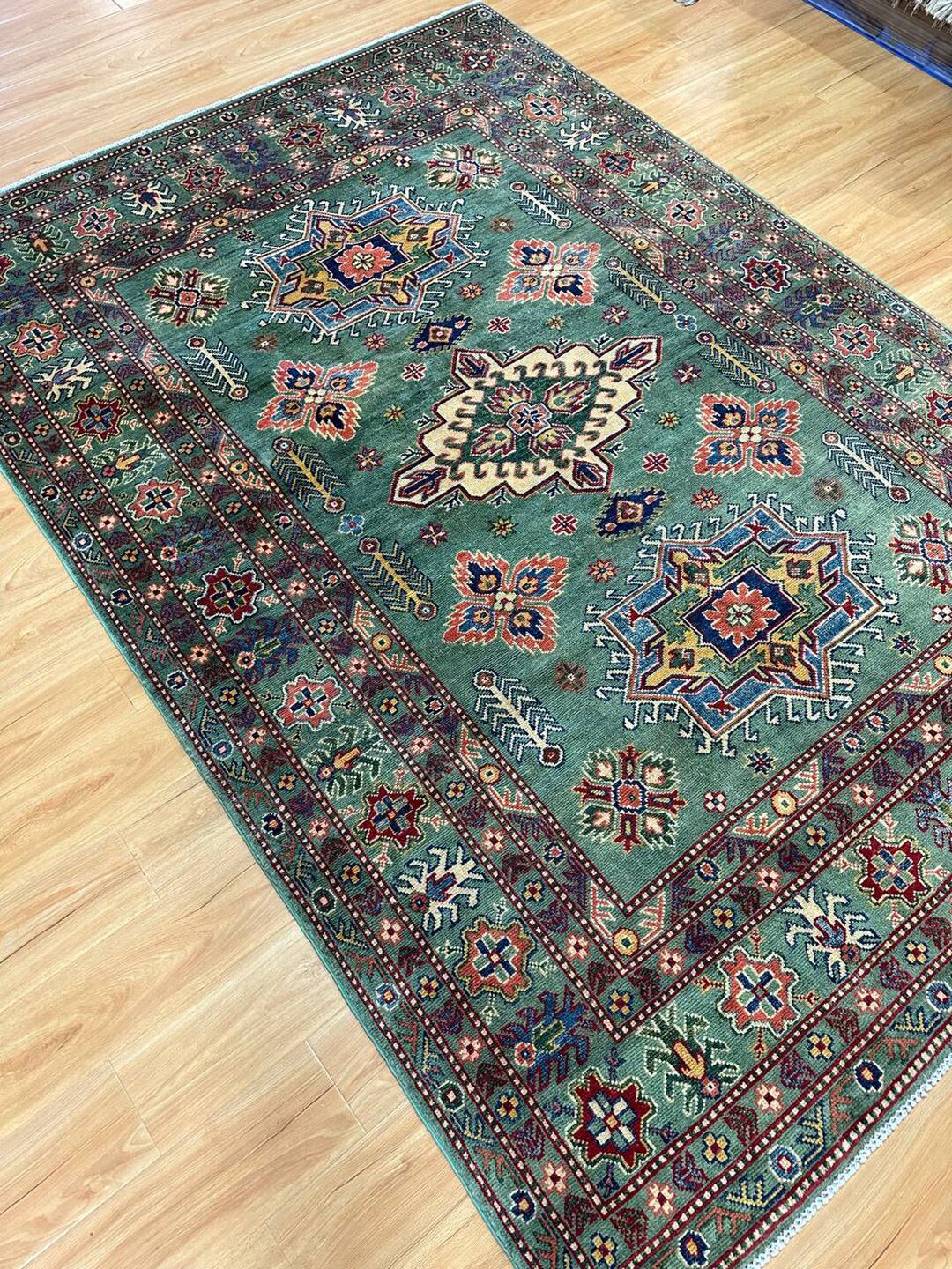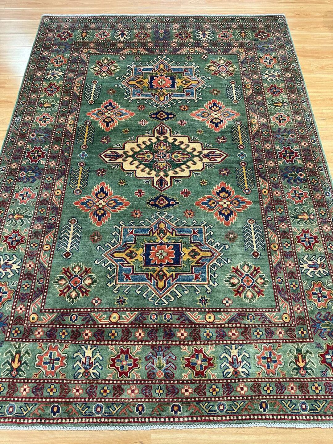 • Design: Showcases a beautiful geometric Caucasian design in green, beige, yellow, green, and maroon tones, dyed using traditional vegetable dye methods.