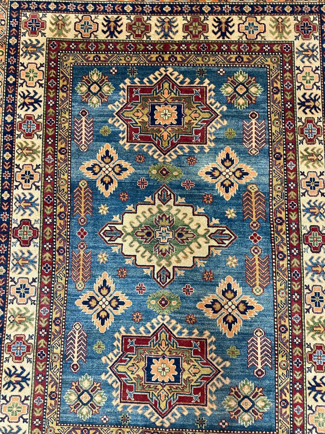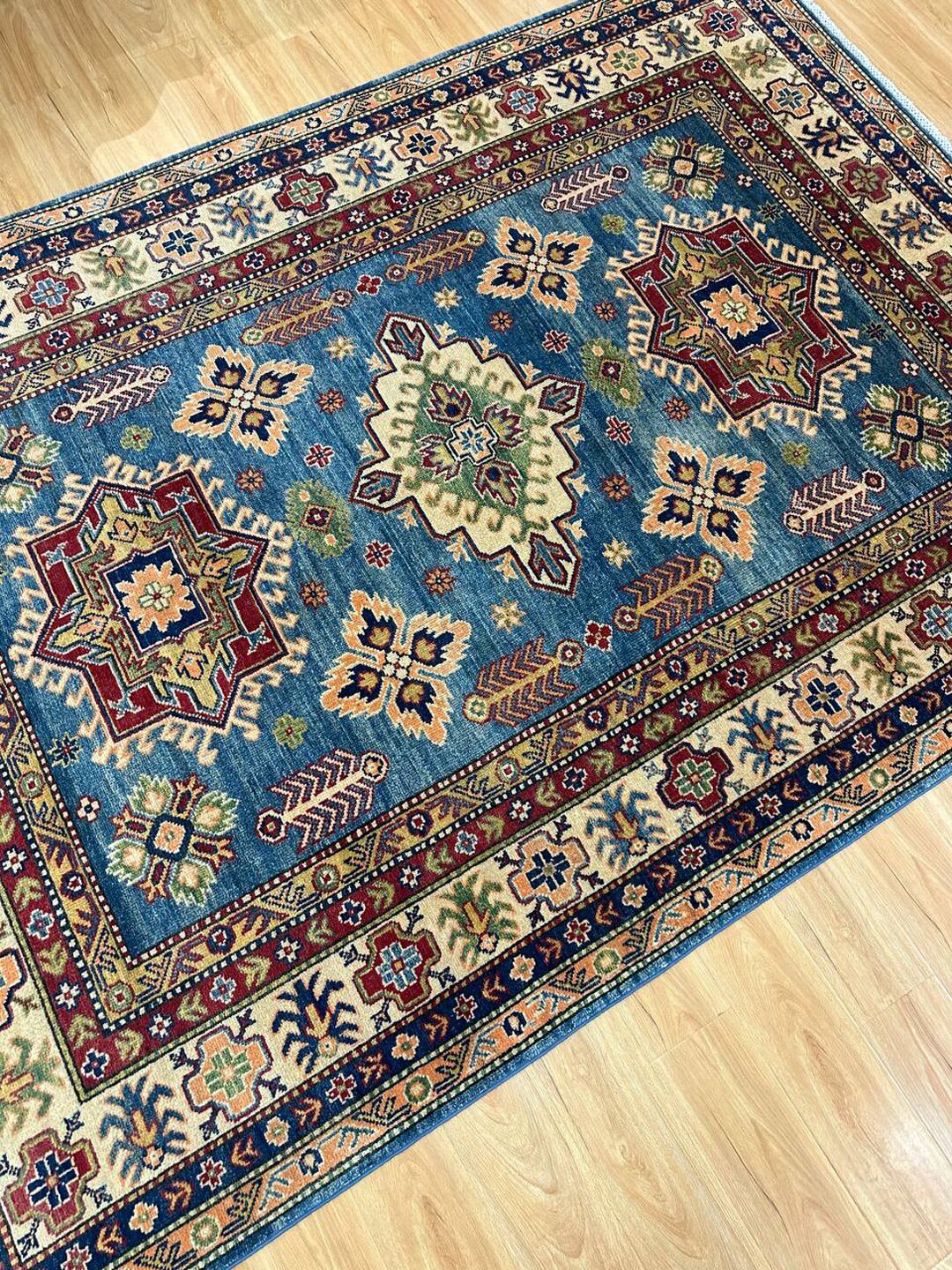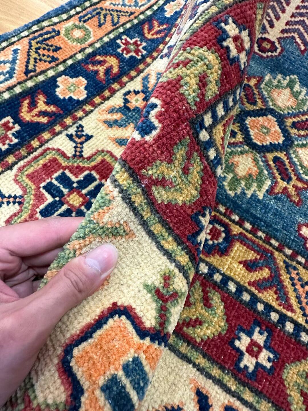 • Design: Showcases a beautiful geometric Caucasian design in blue, beige, yellow, green, and maroon tones, dyed using traditional vegetable dye methods.