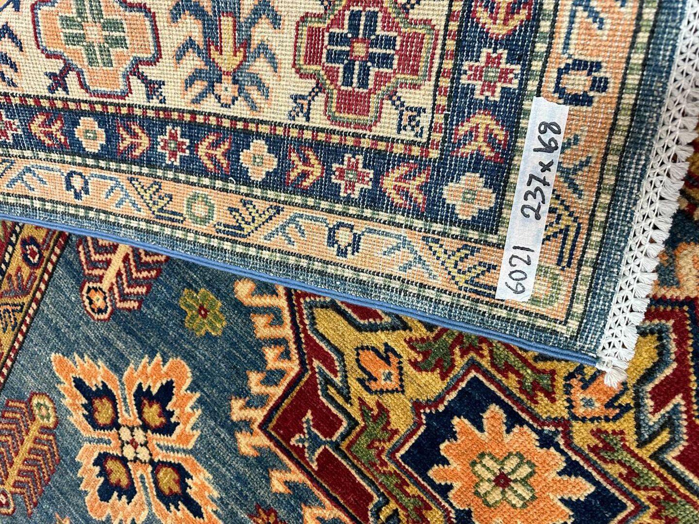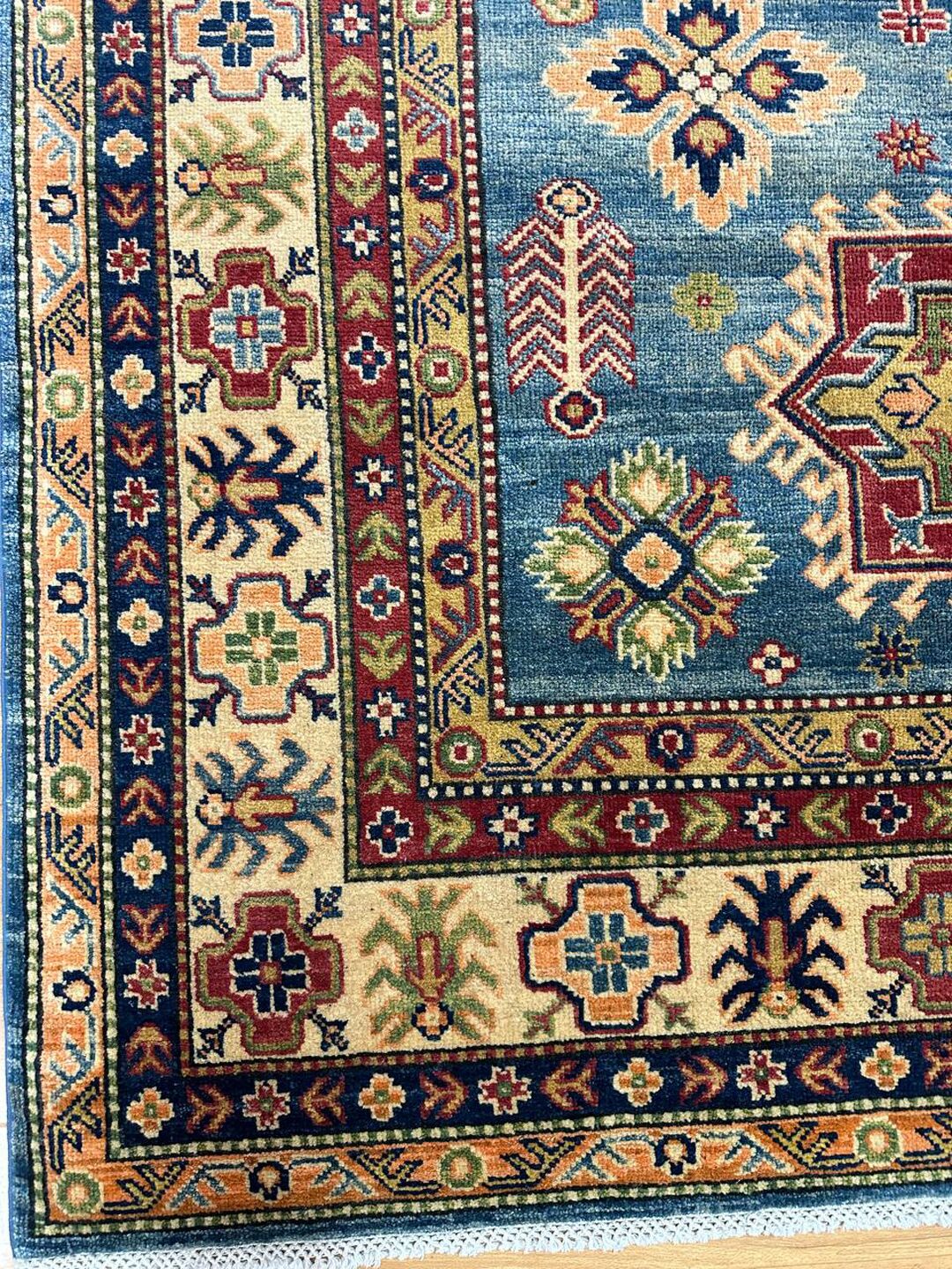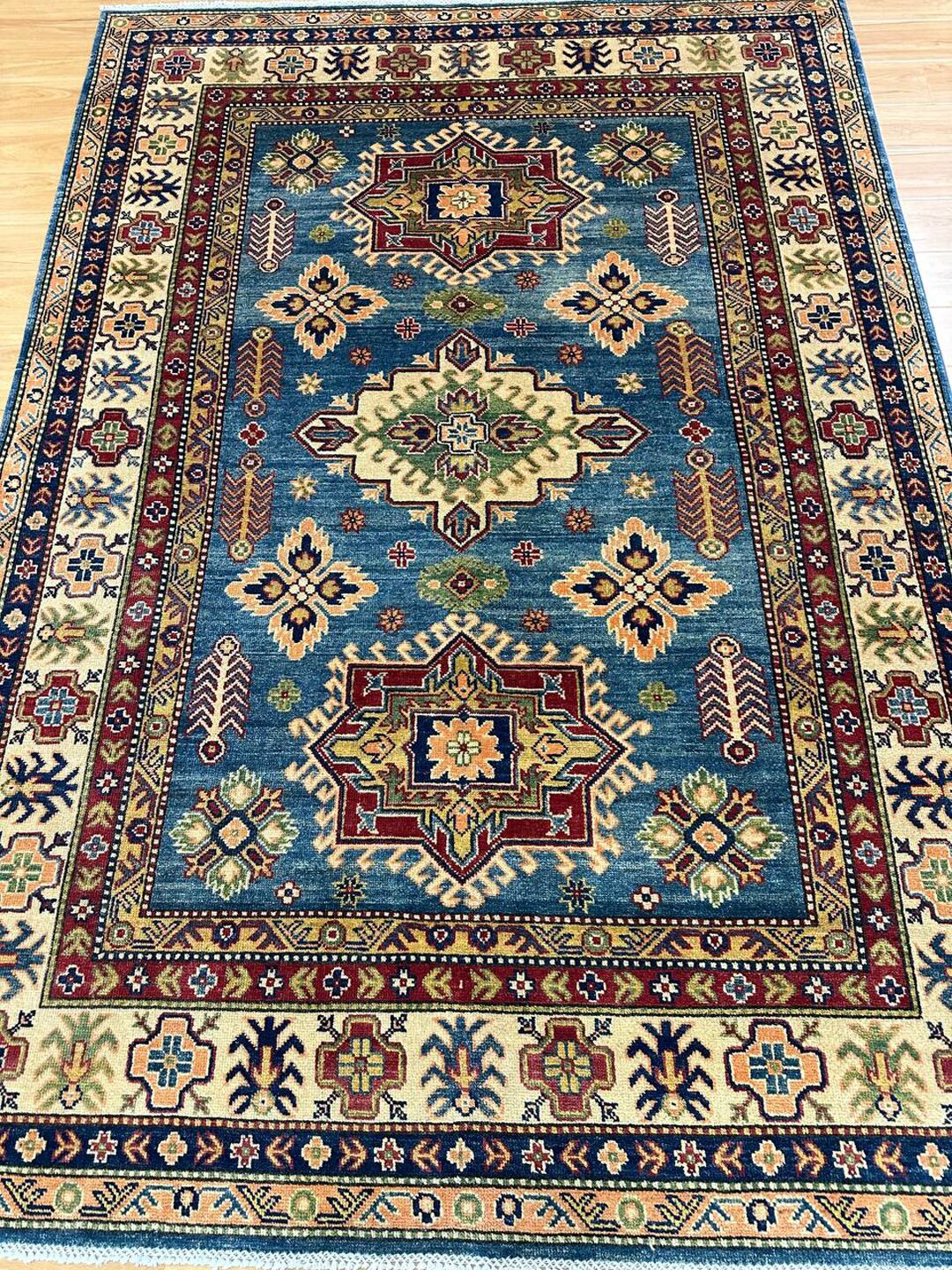 • Design: Showcases a beautiful geometric Caucasian design in blue, beige, yellow, green, and maroon tones, dyed using traditional vegetable dye methods.