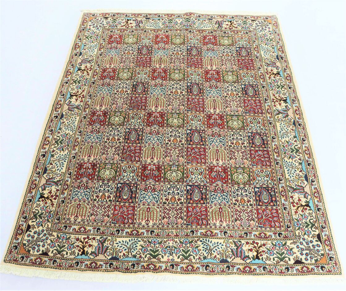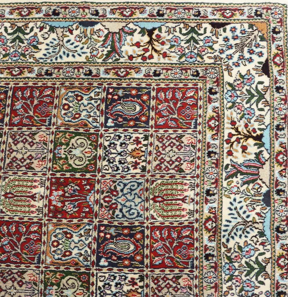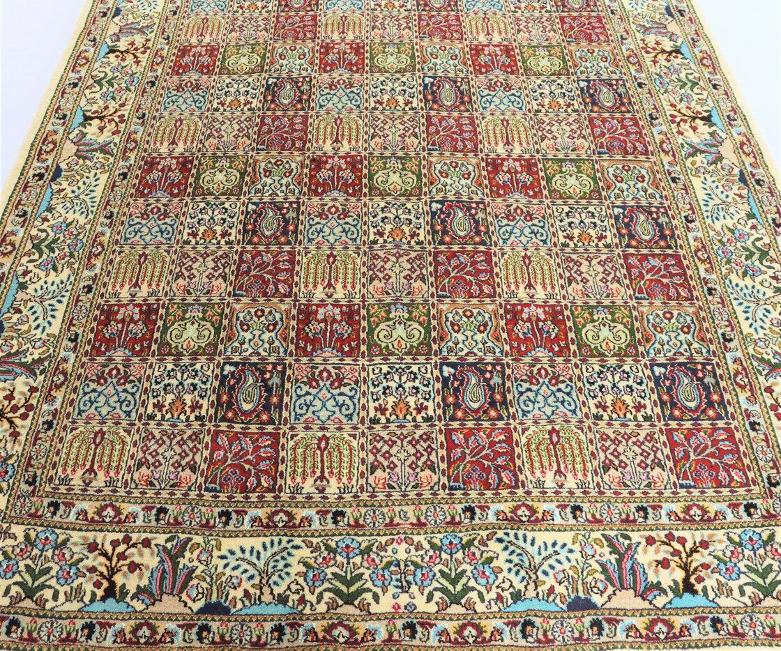 – Garden Elegance: Immerse yourself in the exquisite design of this amazing room size handmade Persian Mood Rug. A rare find, it boasts pure lamb’s wool pile on a fine cotton base, with multi-color tones dyed using traditional methods.