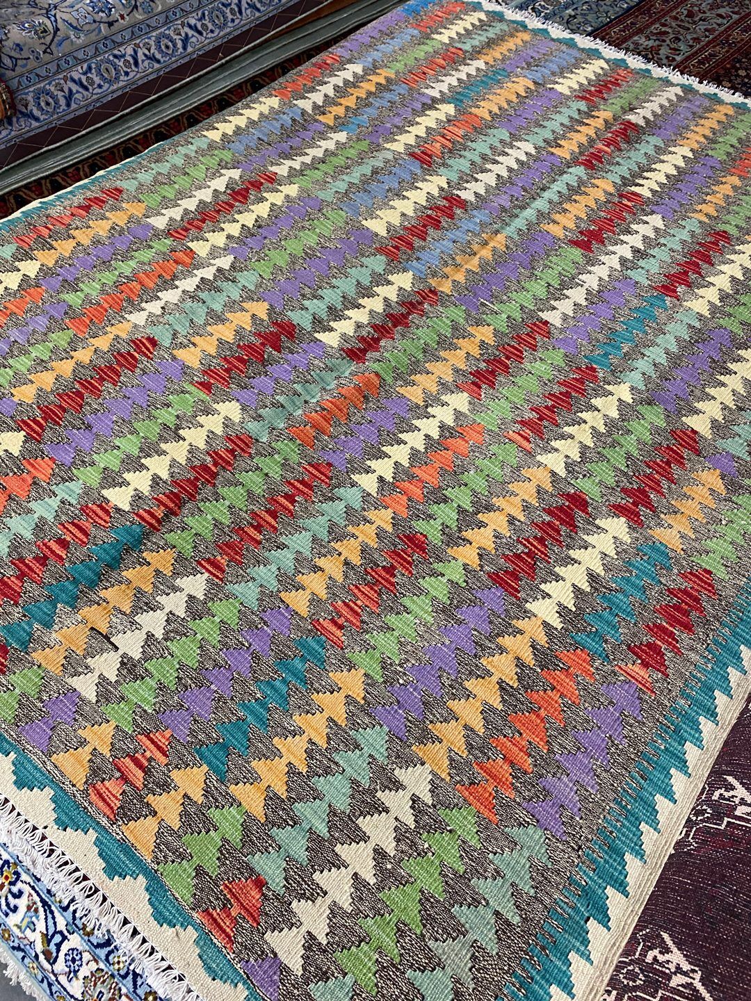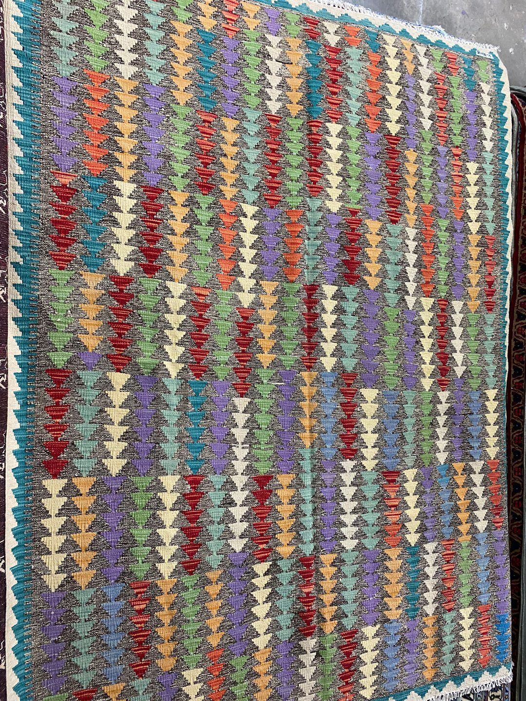 – Rare Massive Size Decorative Kilim Rug: Handwoven with care, this Boho Maymana Kilim is a unique piece, reversible and crafted with a pure hand-spun wool pile on a wool base. The vibrant tones are dyed using vegetable dyes.