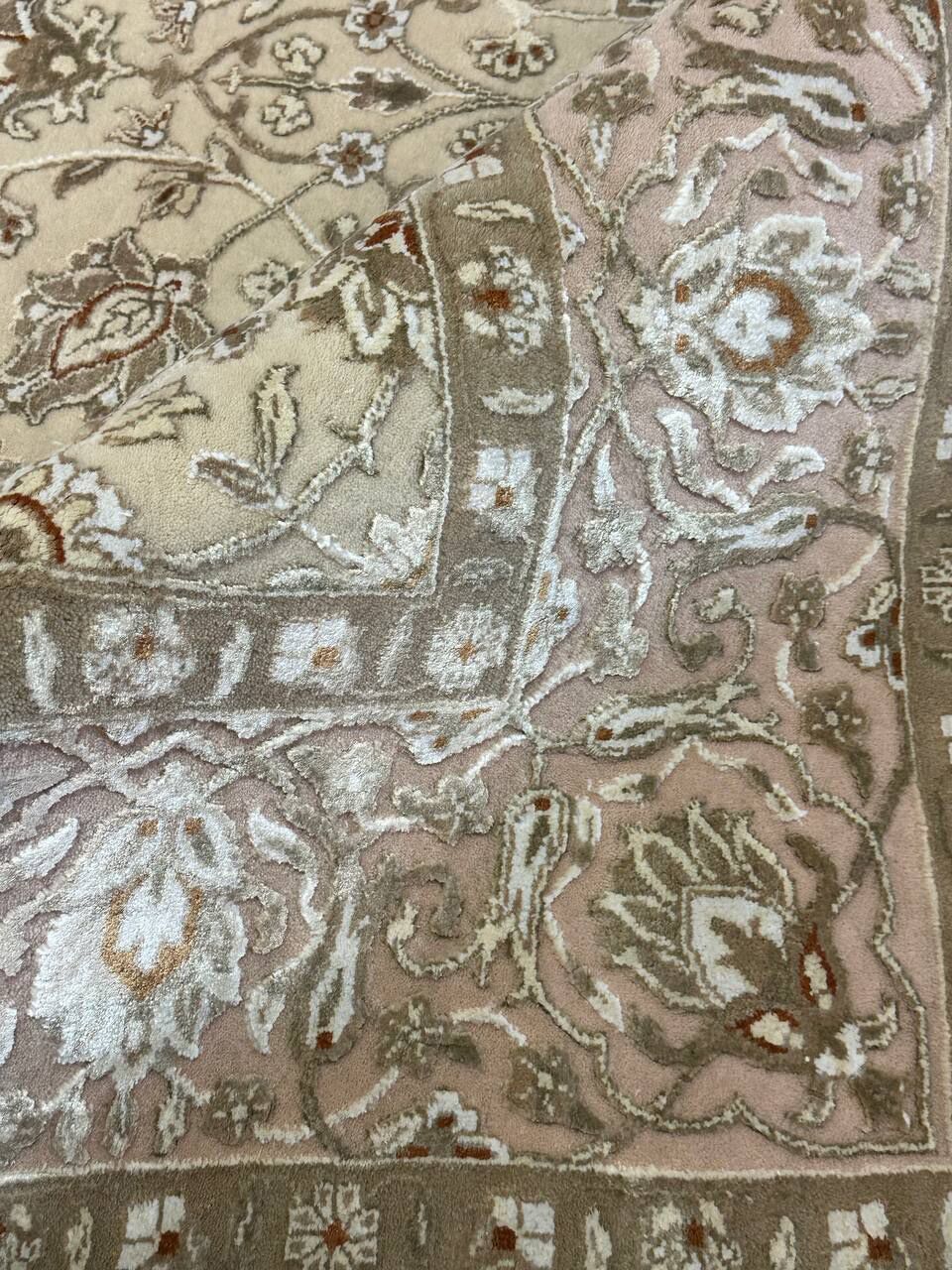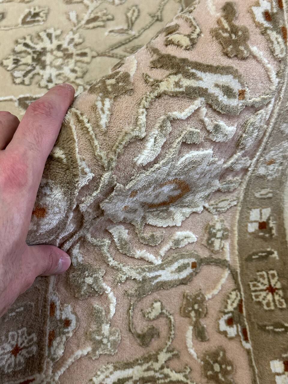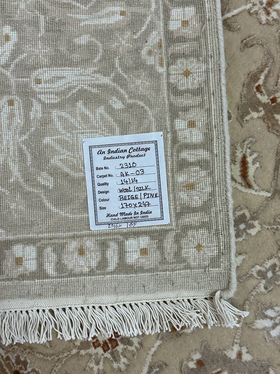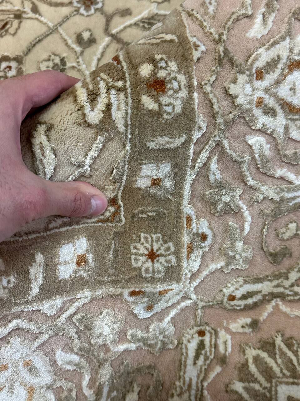 – Embossed Allover Floral Pattern: The raised floral motifs are meticulously carved to create a stunning embossed effect, adding depth and dimension to the rug. Dyed in modern neutral tones like Light Brown, ivory, and soft Pink using traditional vegetable dyes.