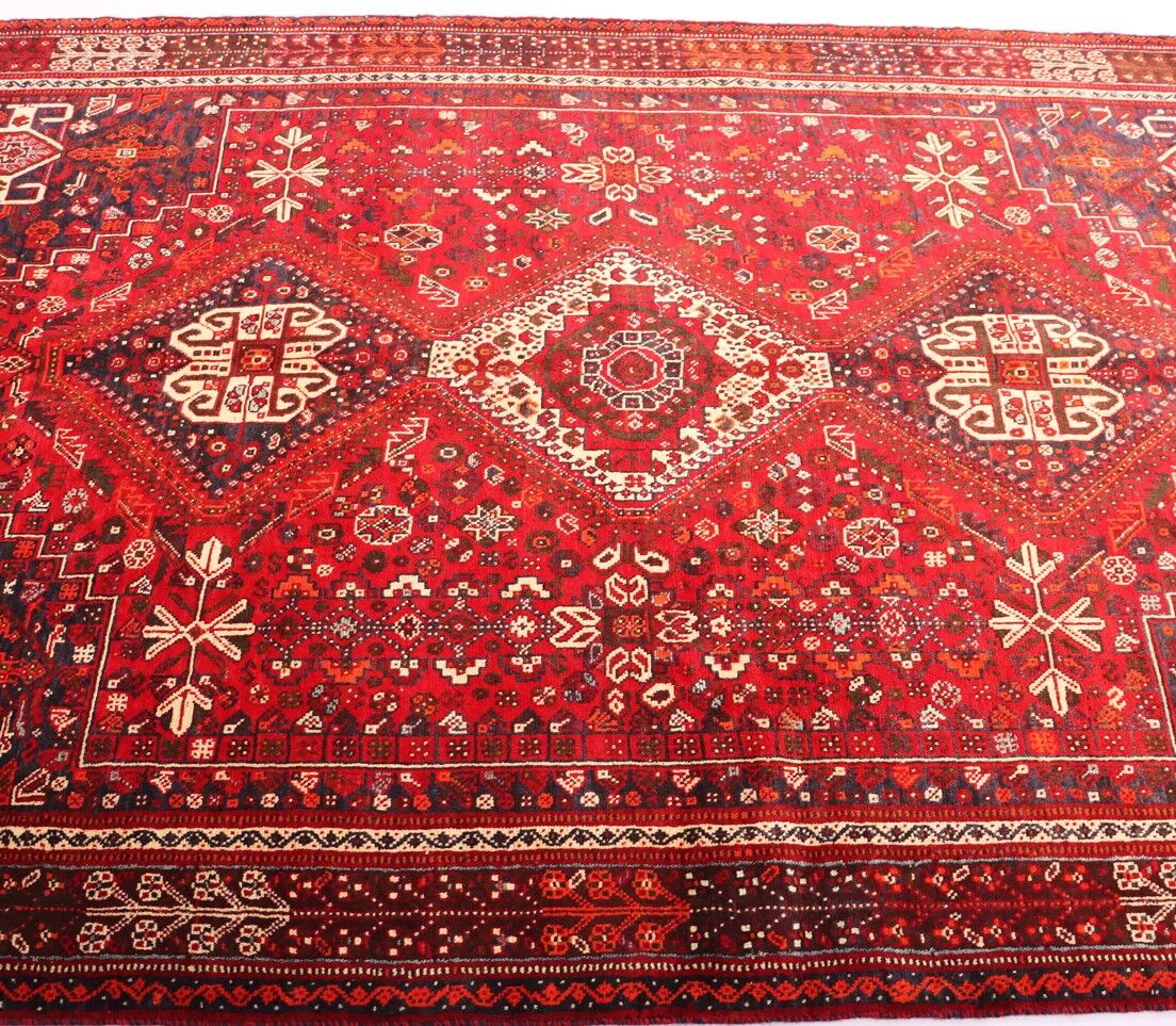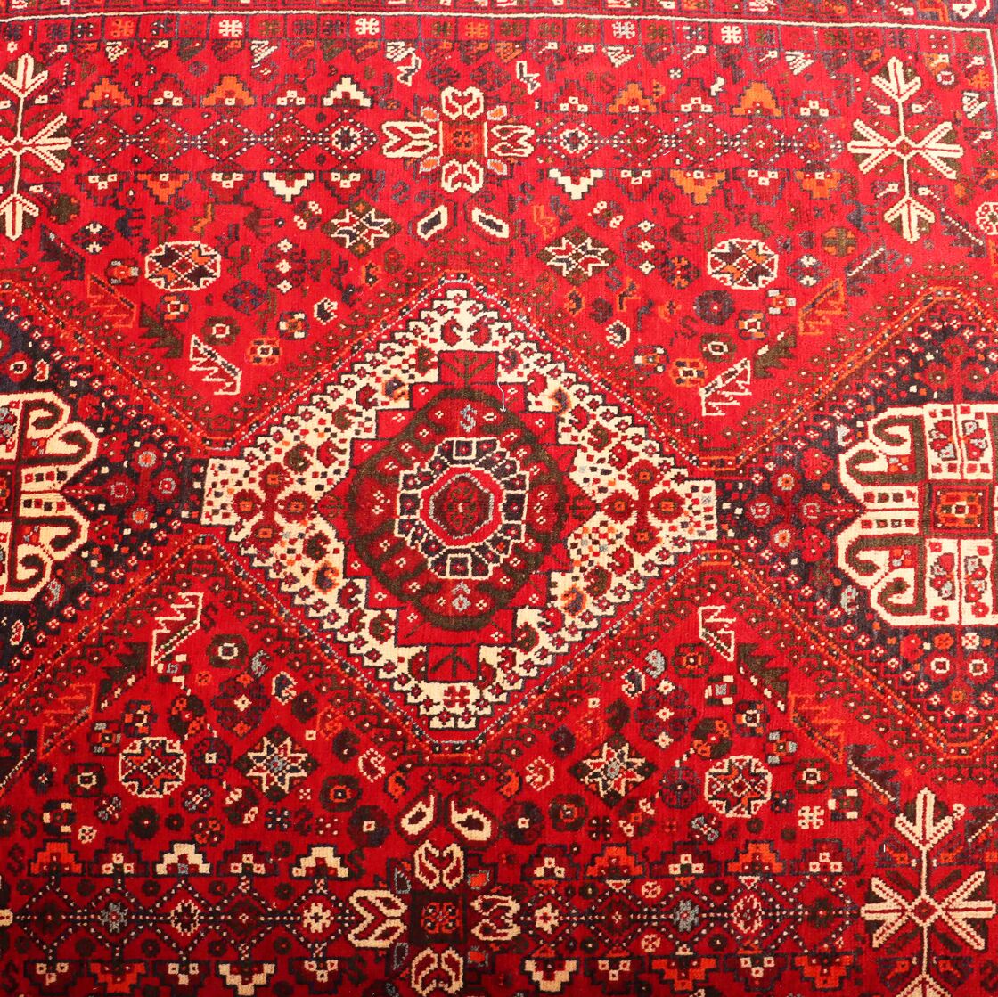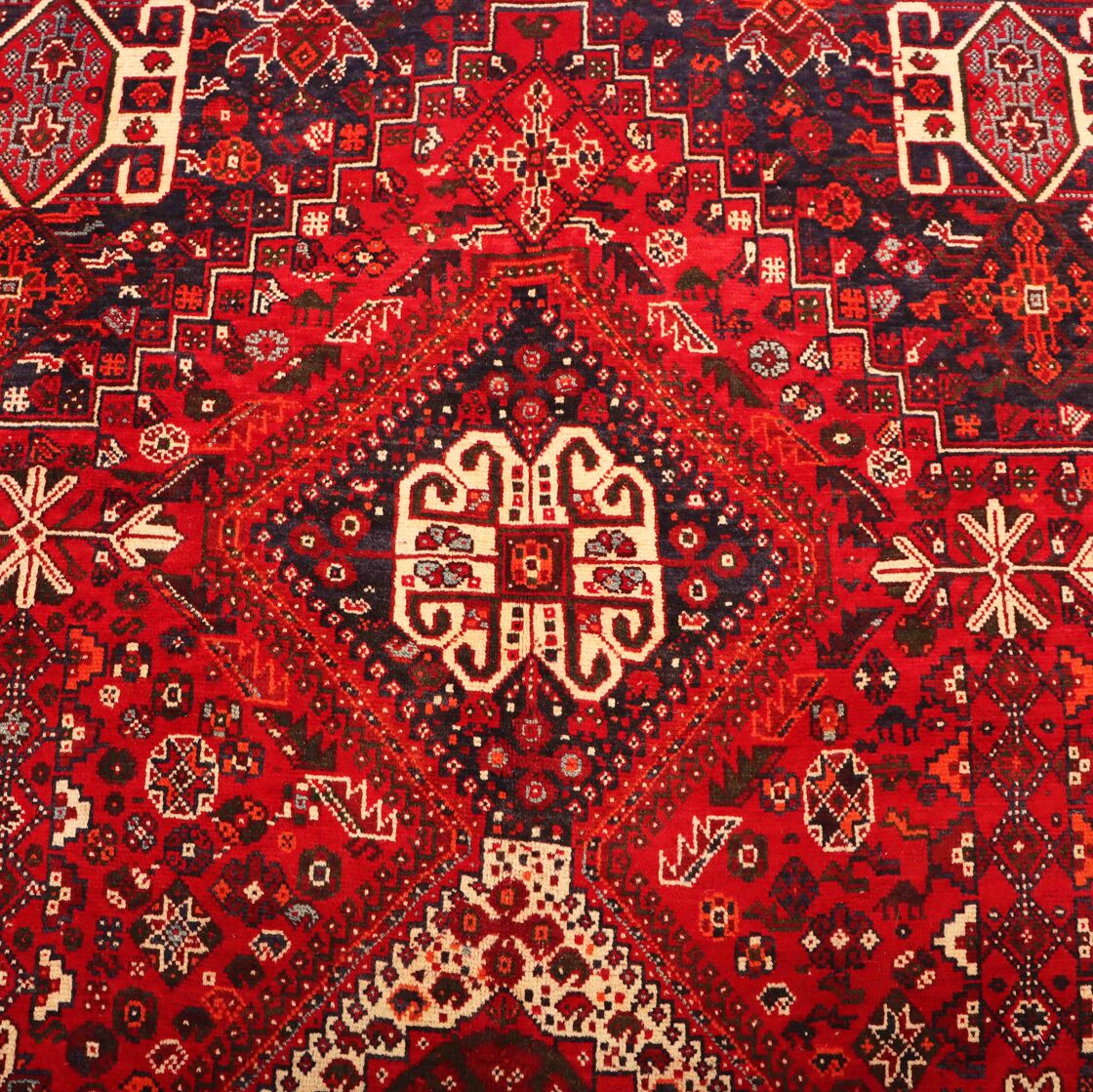 – Timeless Elegance: Immerse your space in the timeless elegance of this certified hand-knotted Persian Qashghai Shiraz rug. A wide, heavy-quality piece with a dense pile that promises durability for generations. The rug features pure hand-spun wool pile on a wool base, showcasing a deep red tone dyed using traditional methods.