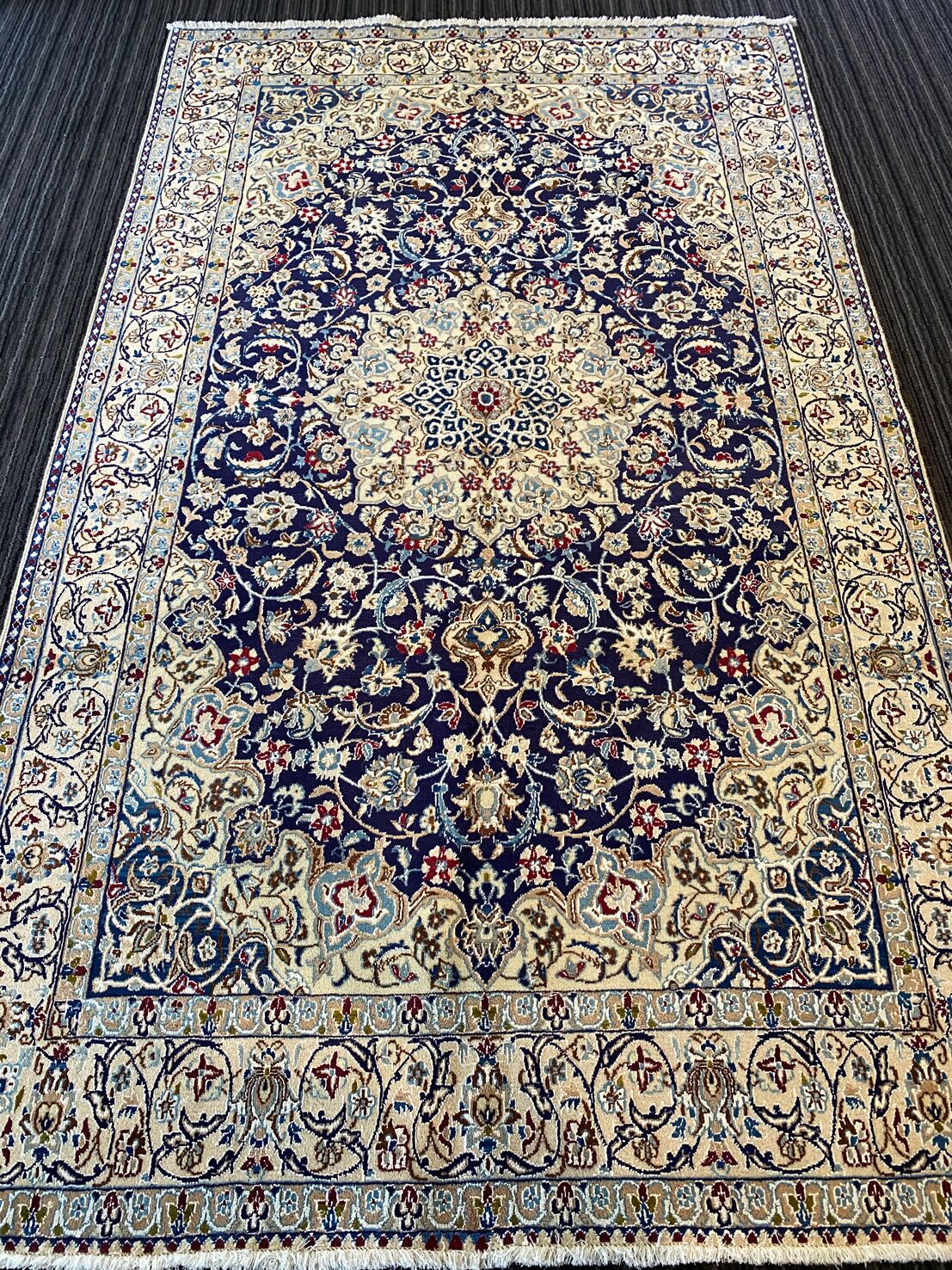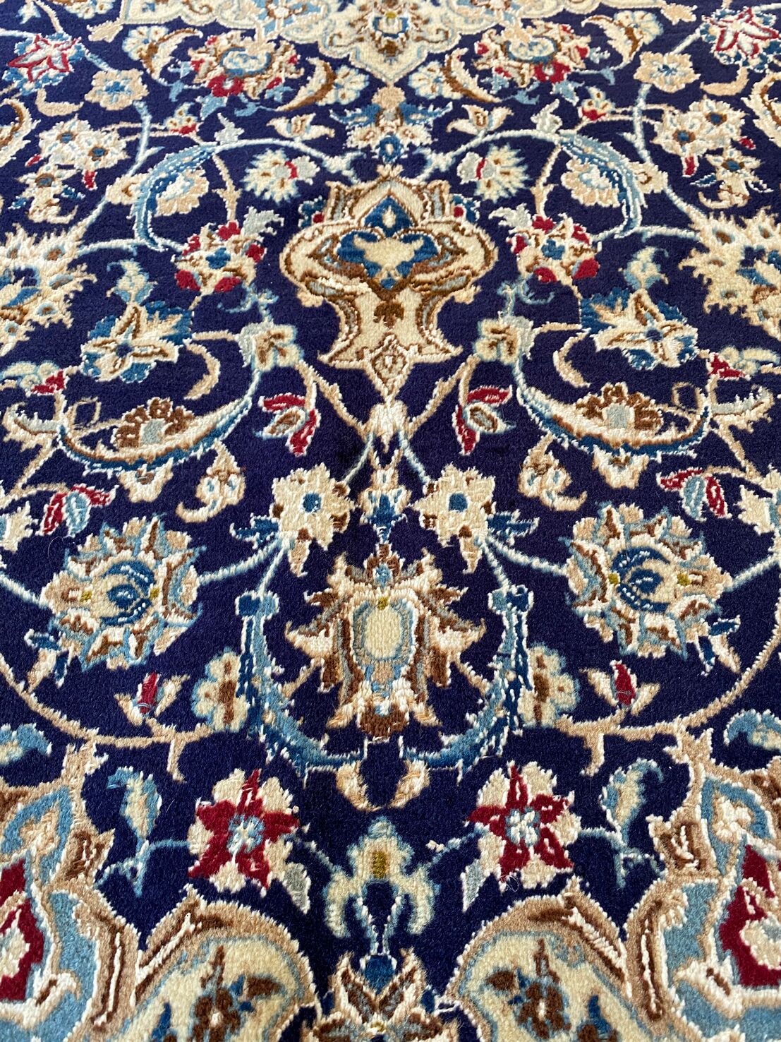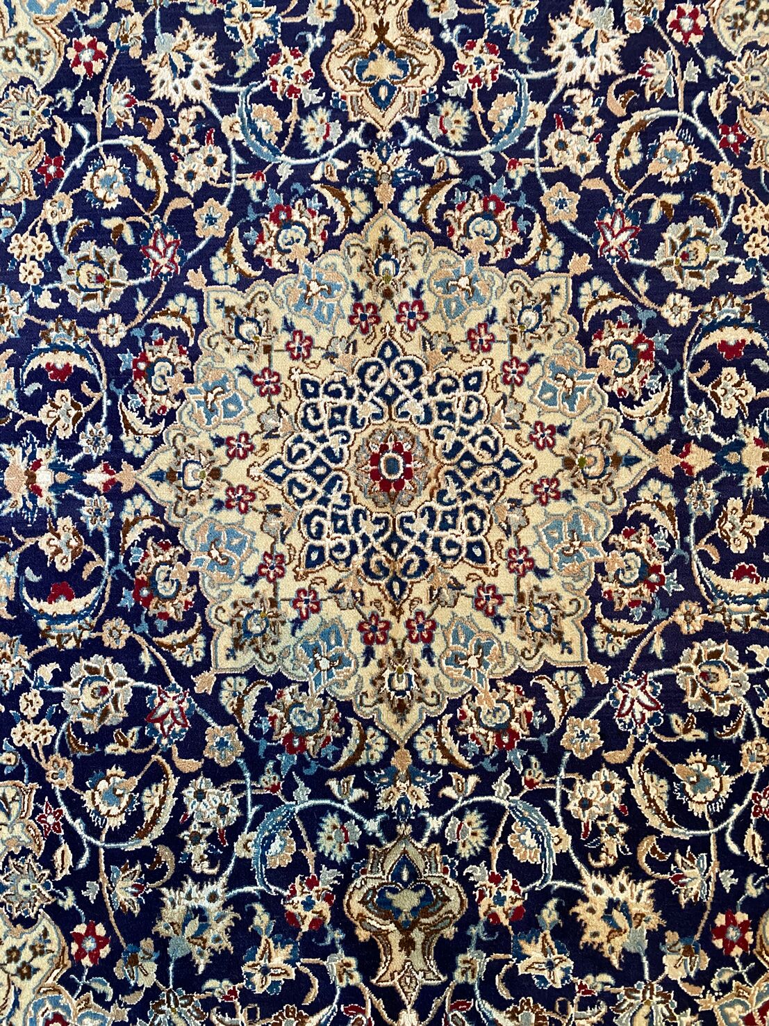Never The Less Its Pure Lamb’s Pile with Touch of Silk on Cotton Base. Blue Tones Dyed Using Traditional Methods. Superb Quality Piece From City Of Nain.