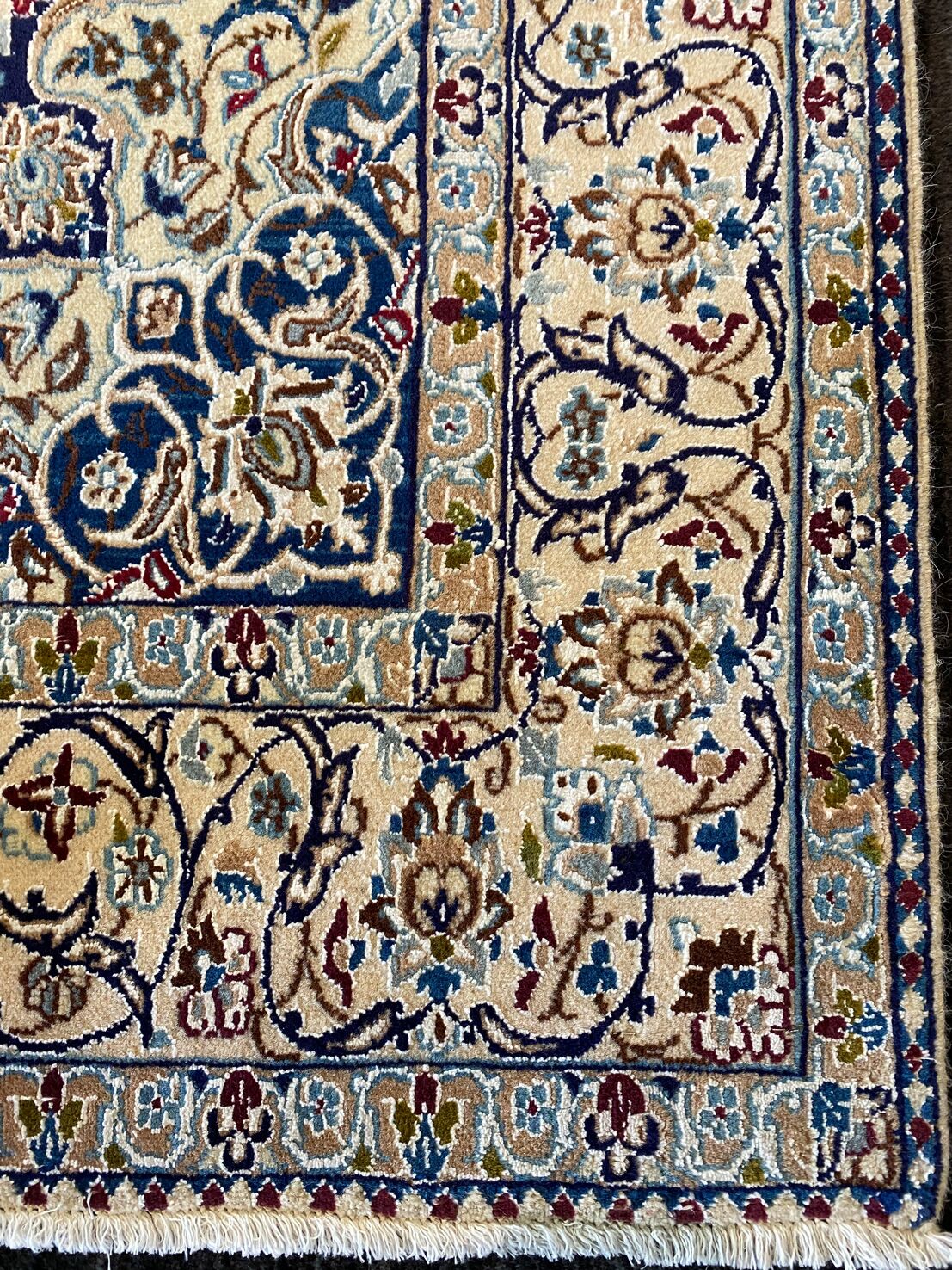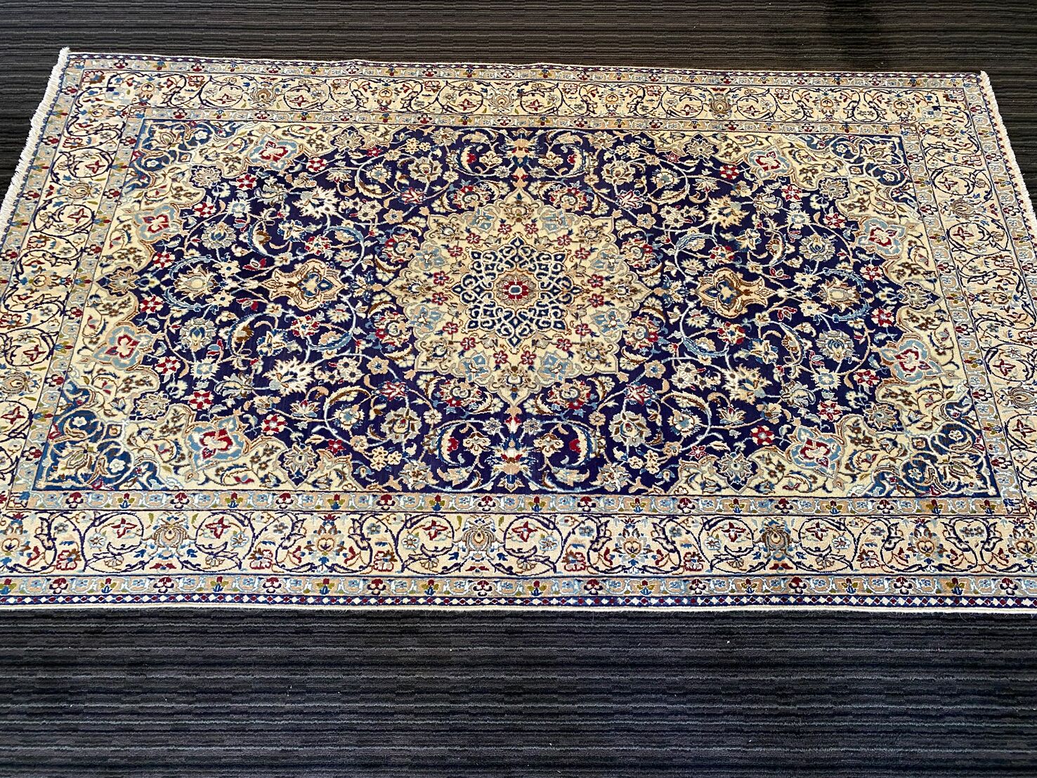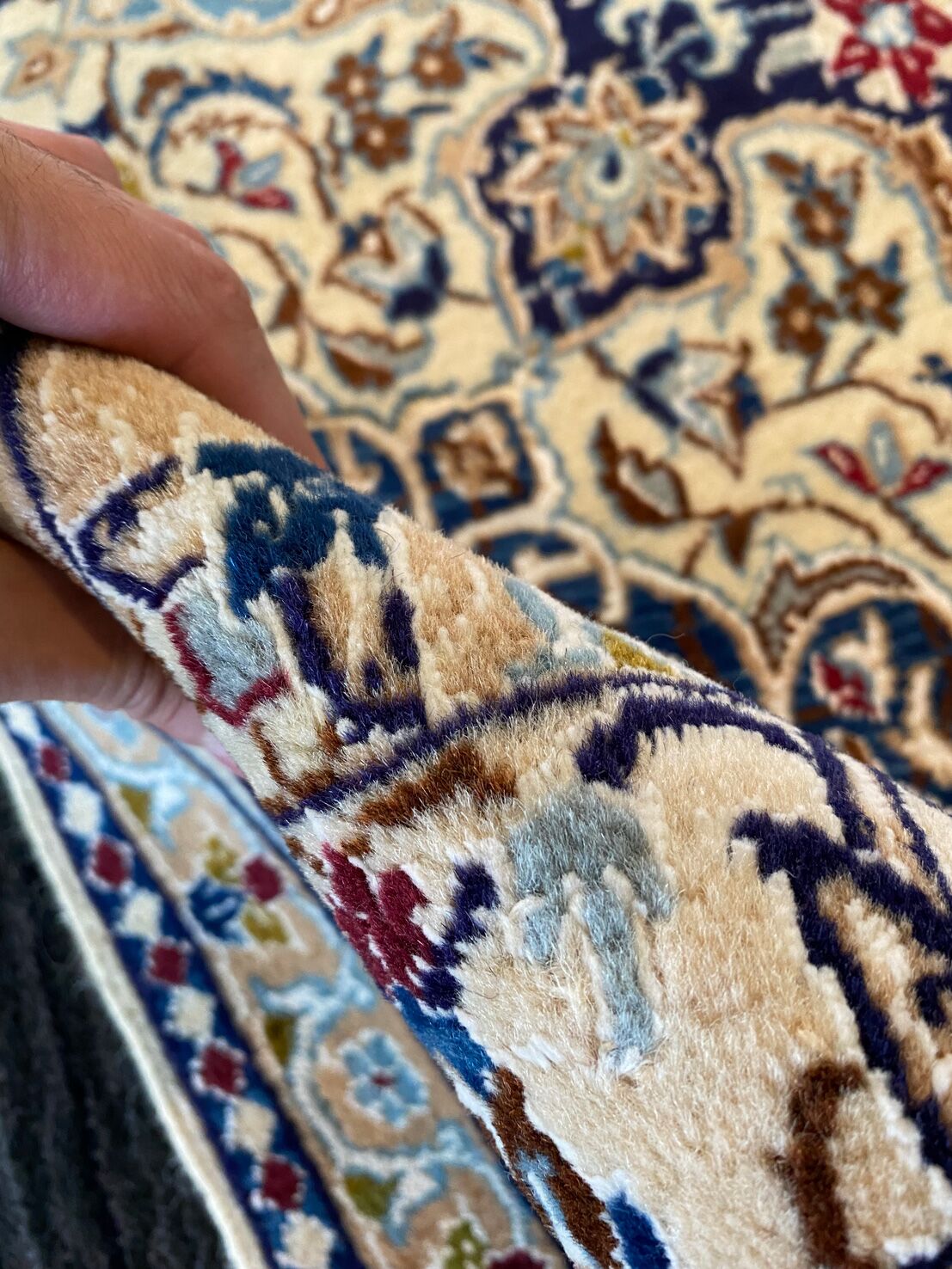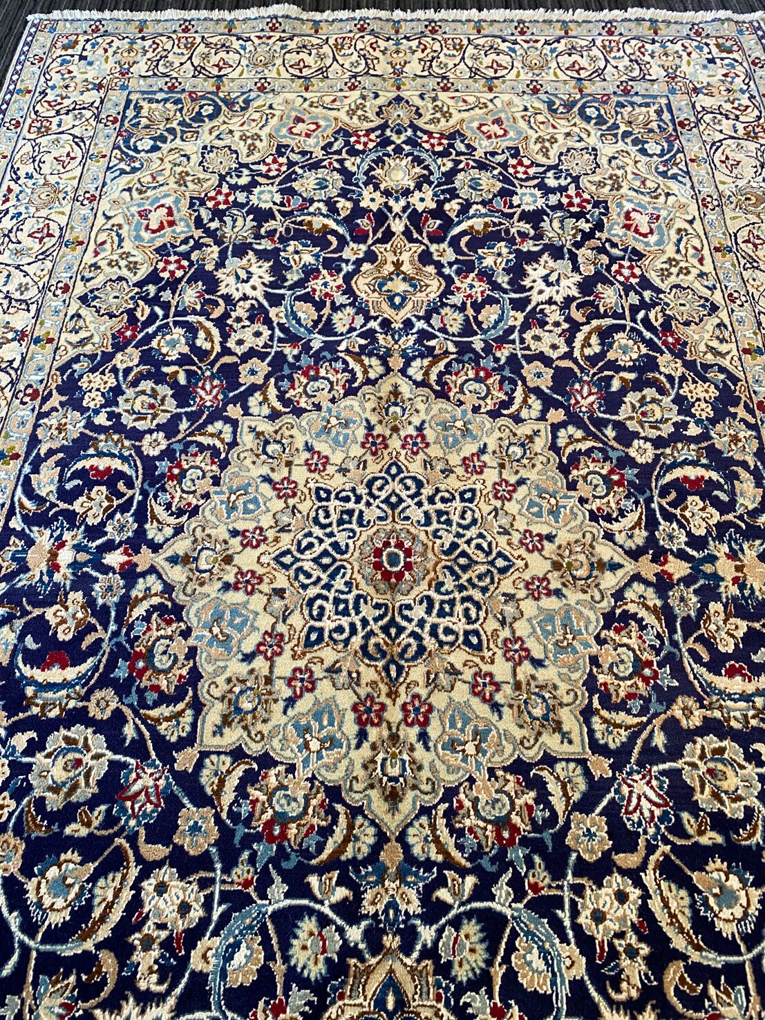 Never The Less Its Pure Lamb’s Pile with Touch of Silk on Cotton Base. Blue Tones Dyed Using Traditional Methods. Superb Quality Piece From City Of Nain.