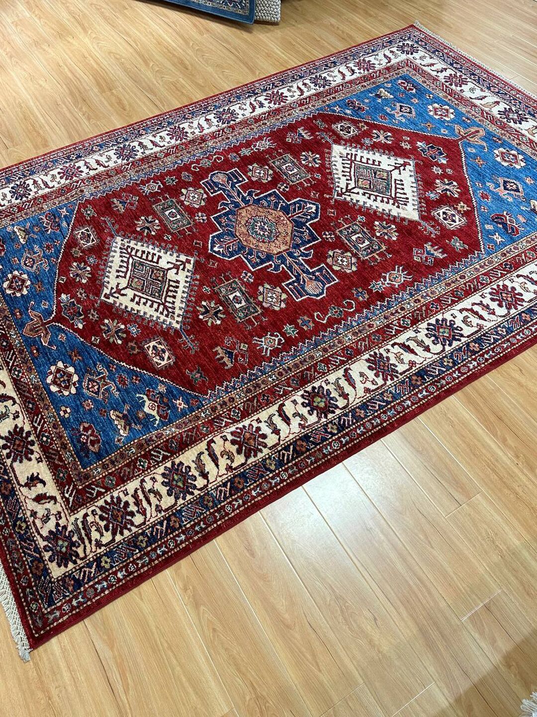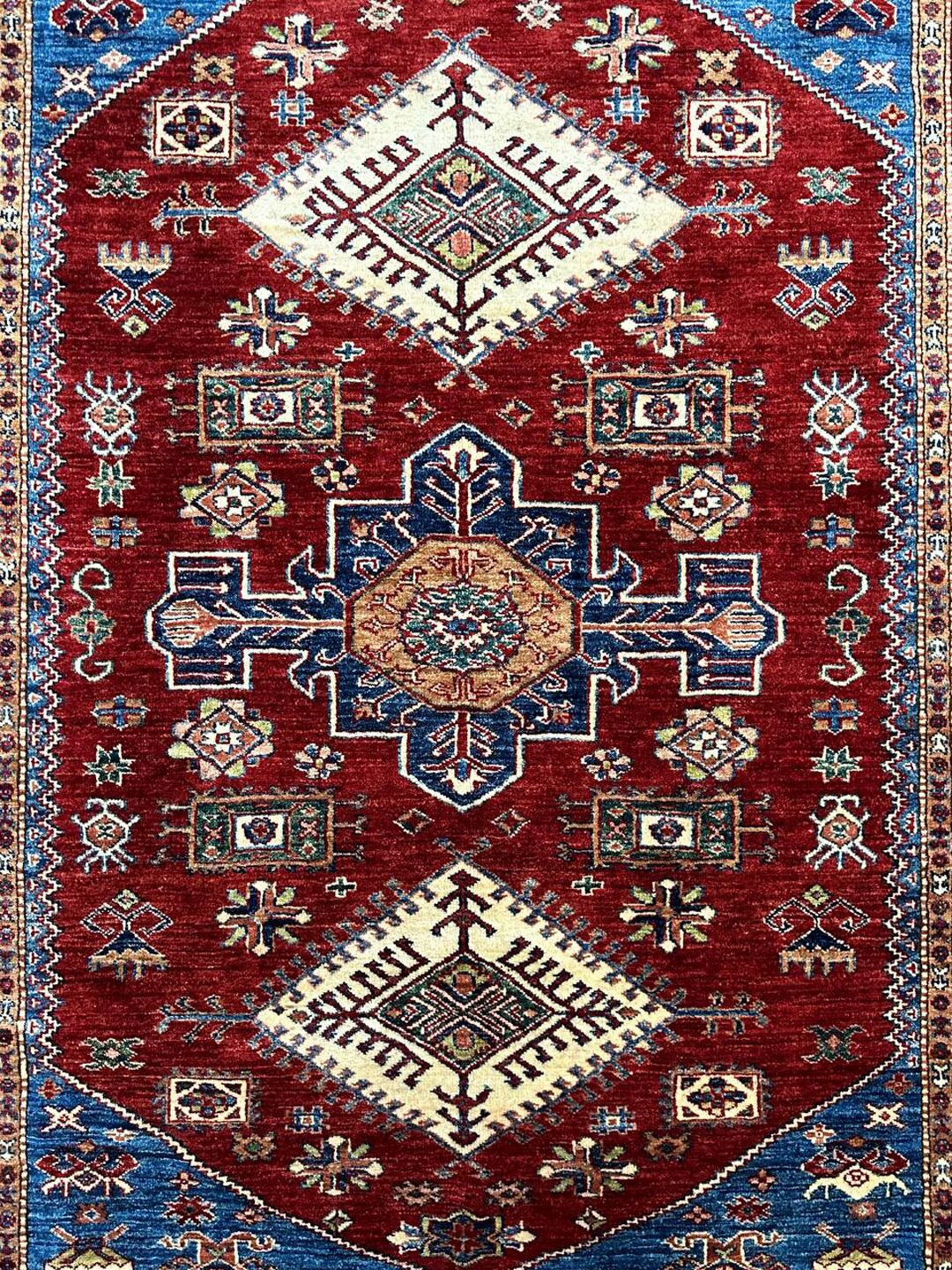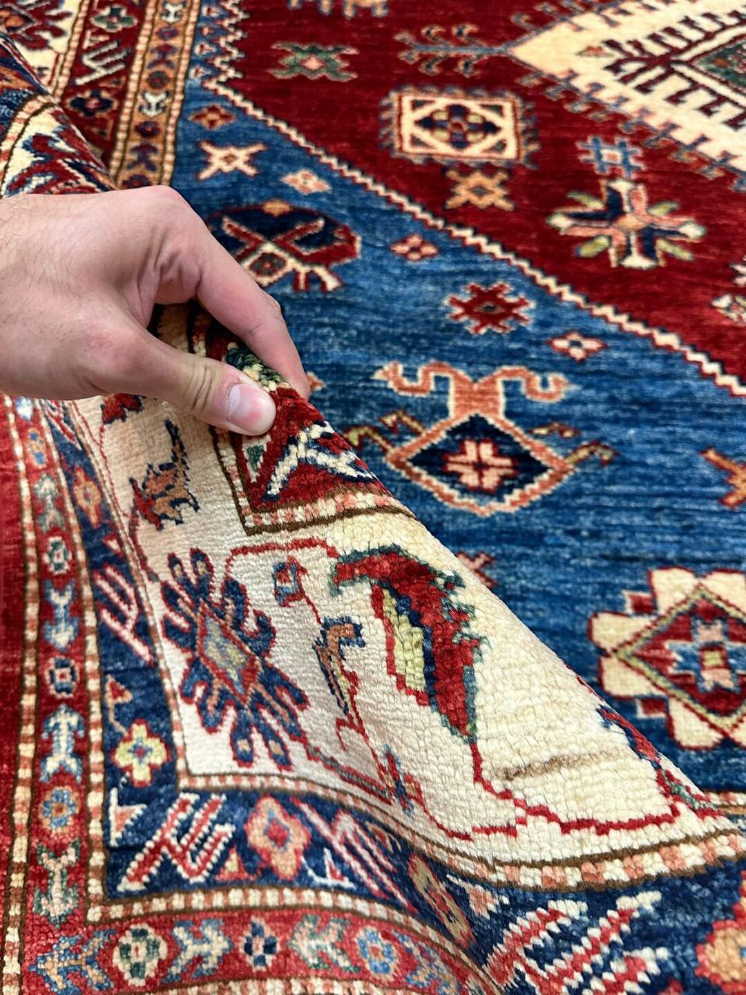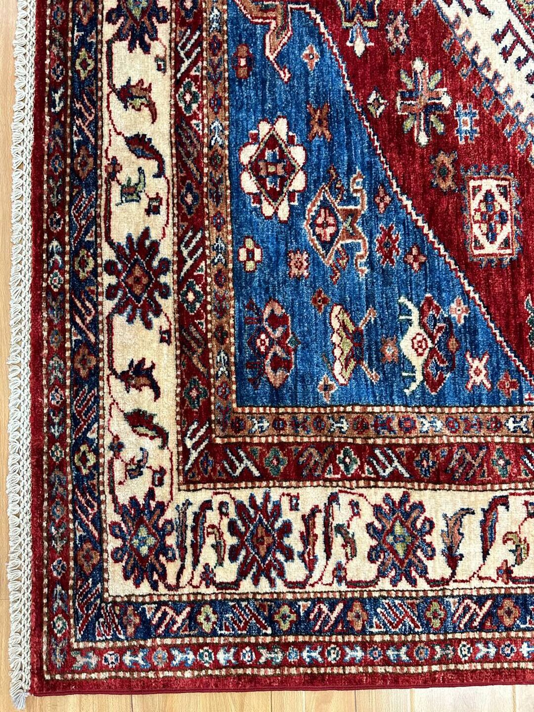• Design: Showcases a beautiful geometric Caucasian design in blue, beige, yellow, green, and maroon tones, dyed using traditional vegetable dye methods.