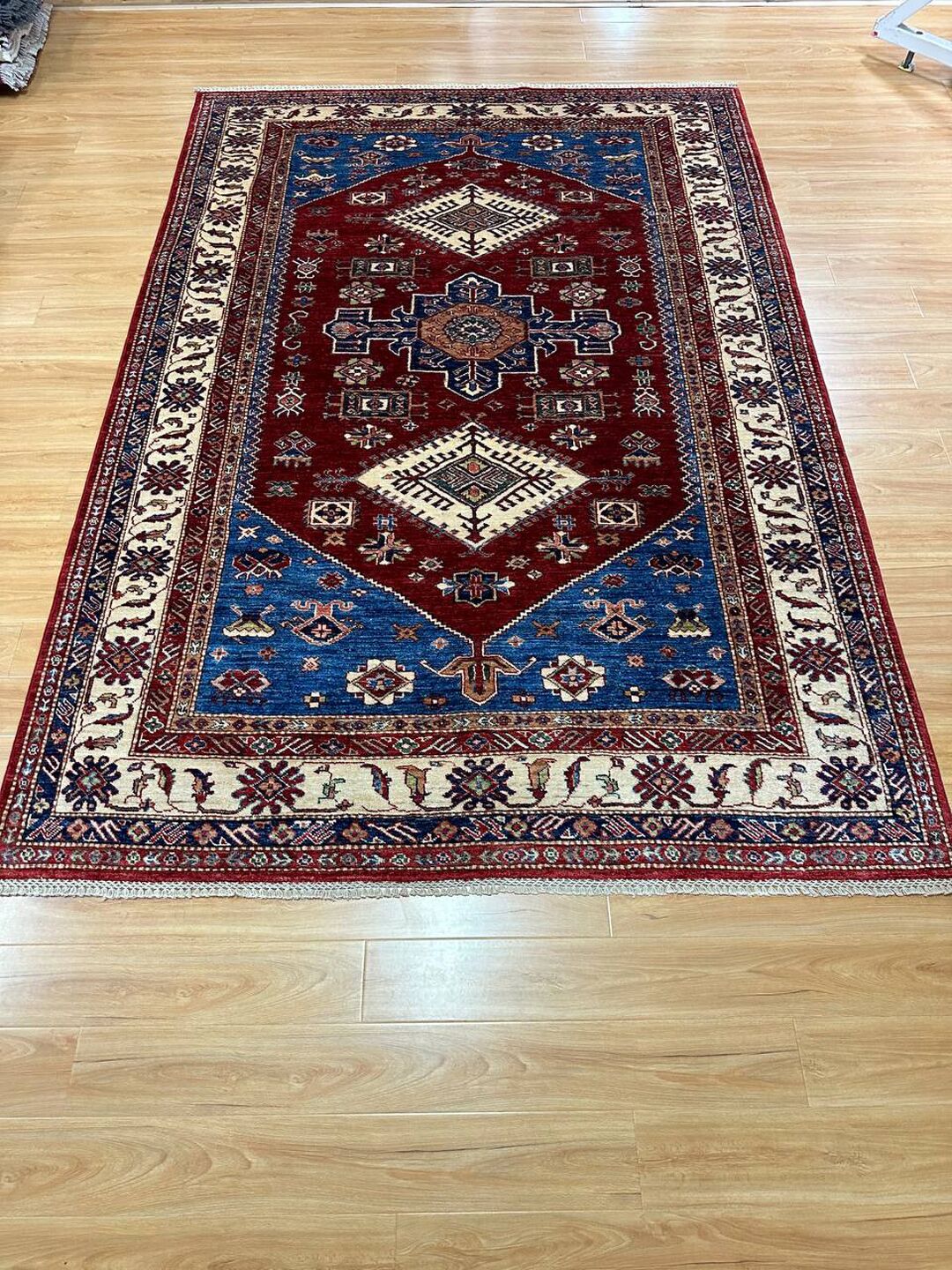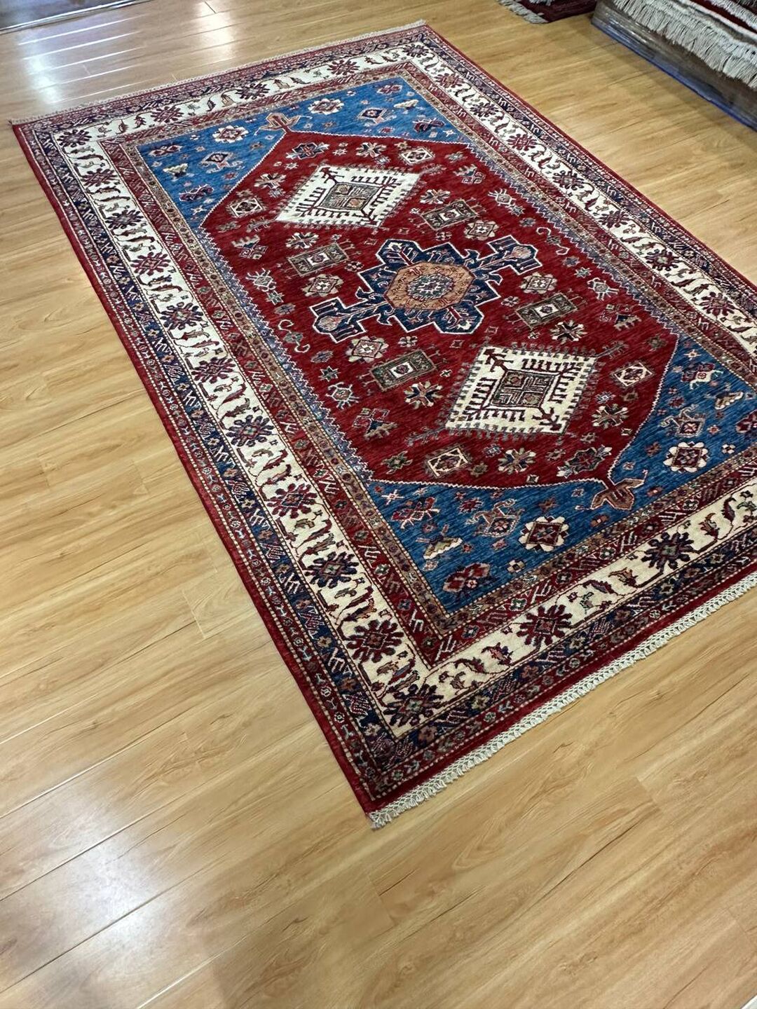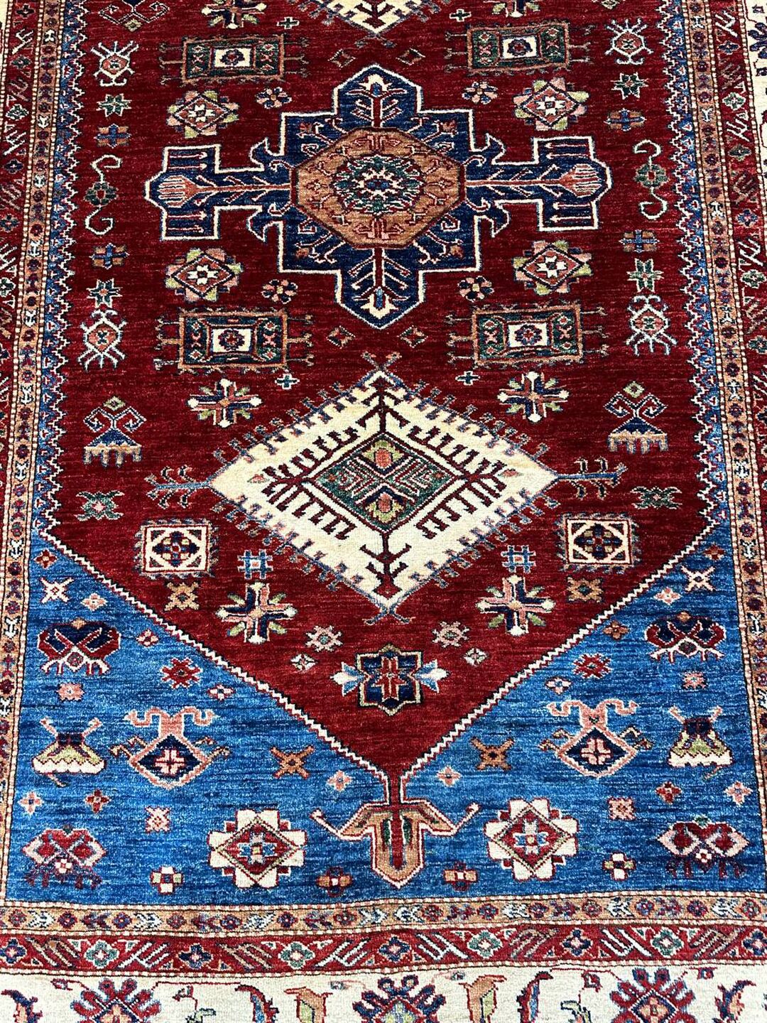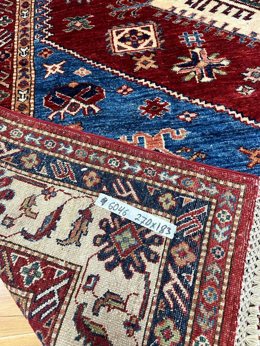• Design: Showcases a beautiful geometric Caucasian design in blue, beige, yellow, green, and maroon tones, dyed using traditional vegetable dye methods.
