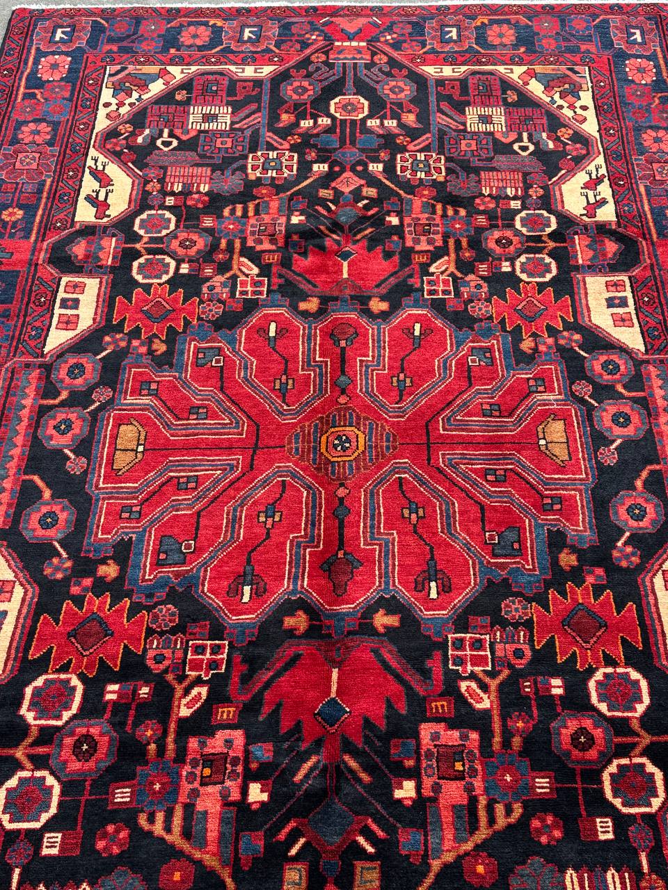 – Rare Tribal Beauty: Discover the rare tribal beauty of this room-size hand-knotted Nahavand rug. A challenging find, this piece showcases pure hand-spun wool pile on a cotton base, featuring a deep tone dyed using traditional methods.