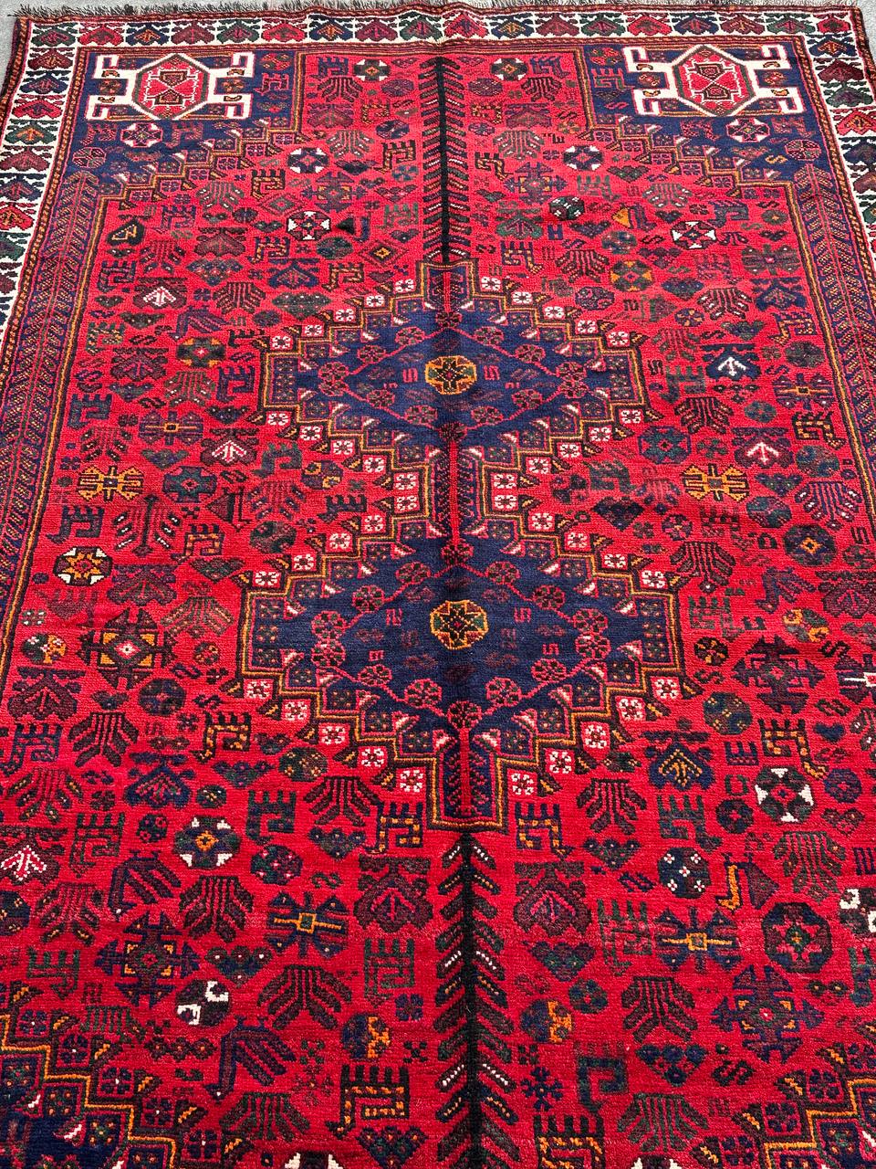 – Timeless Elegance: Immerse your space in the timeless elegance of this certified hand-knotted Persian Qashghai Shiraz rug. A wide, heavy-quality piece with a dense pile that promises durability for generations. The rug features pure hand-spun wool pile on a wool base, showcasing a deep red tone dyed using traditional methods.
