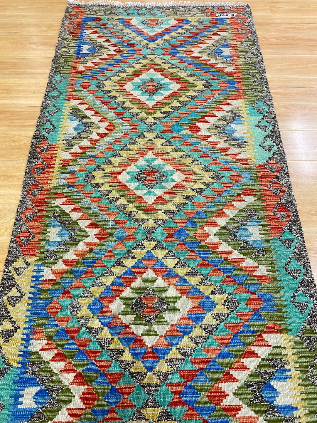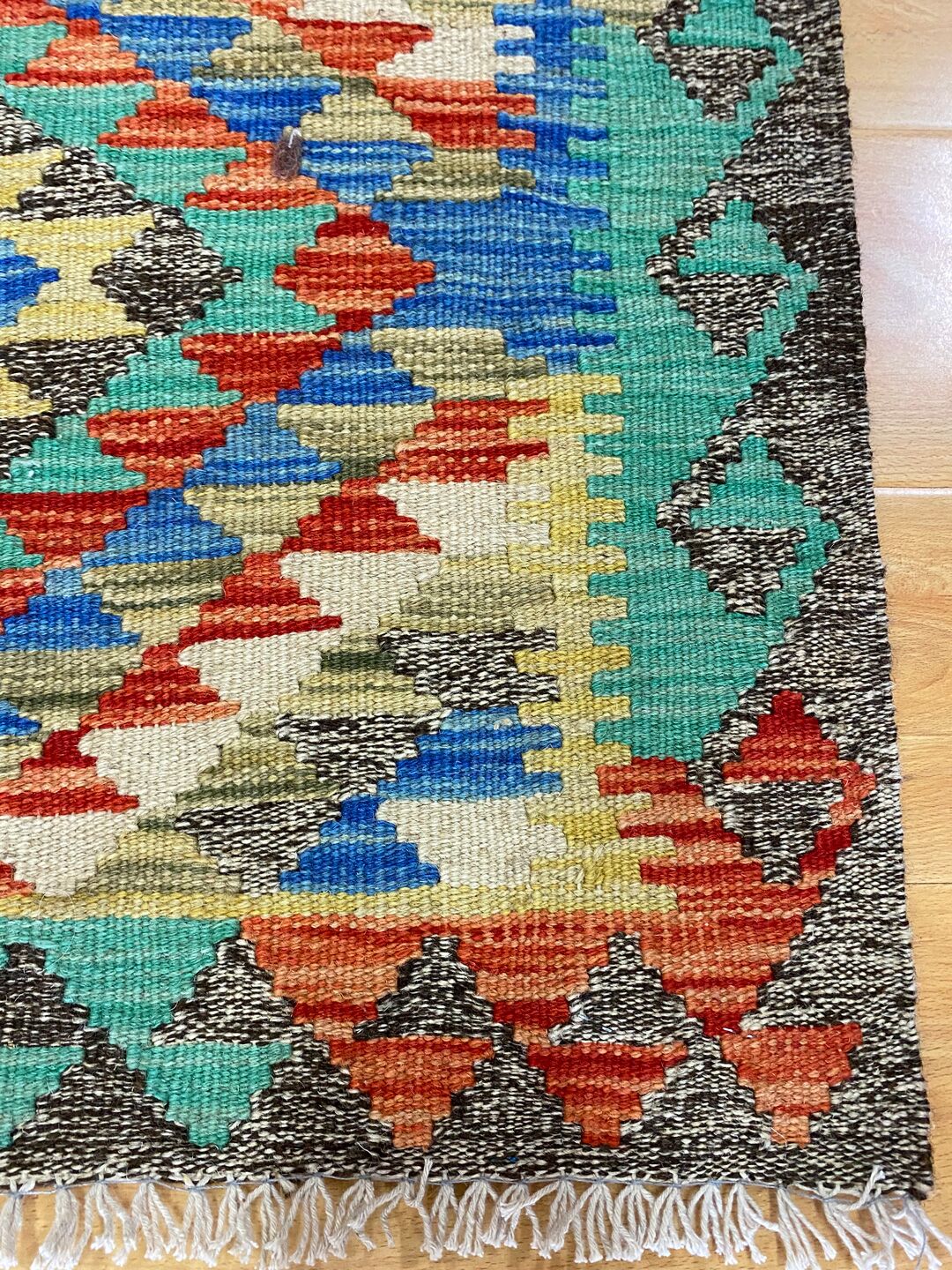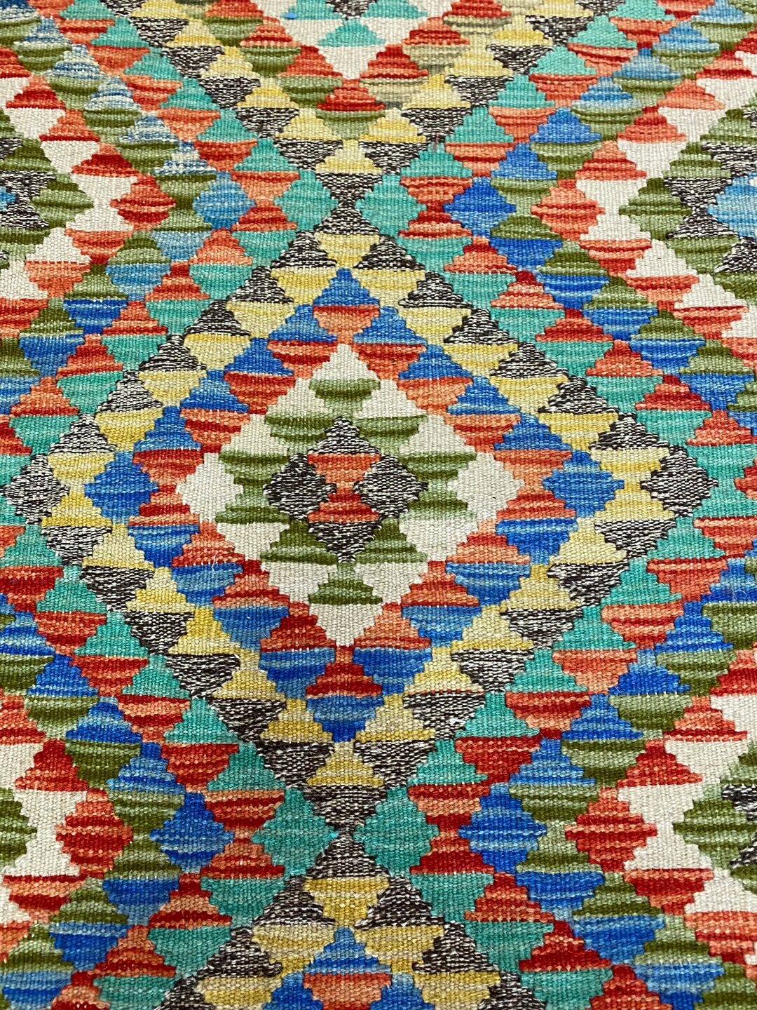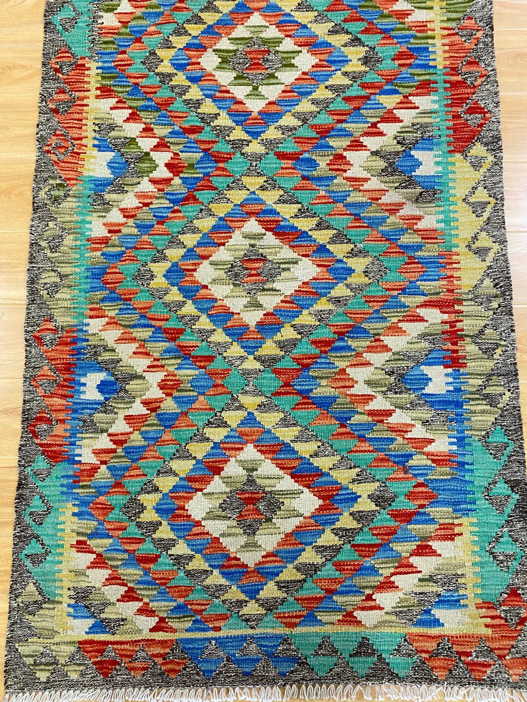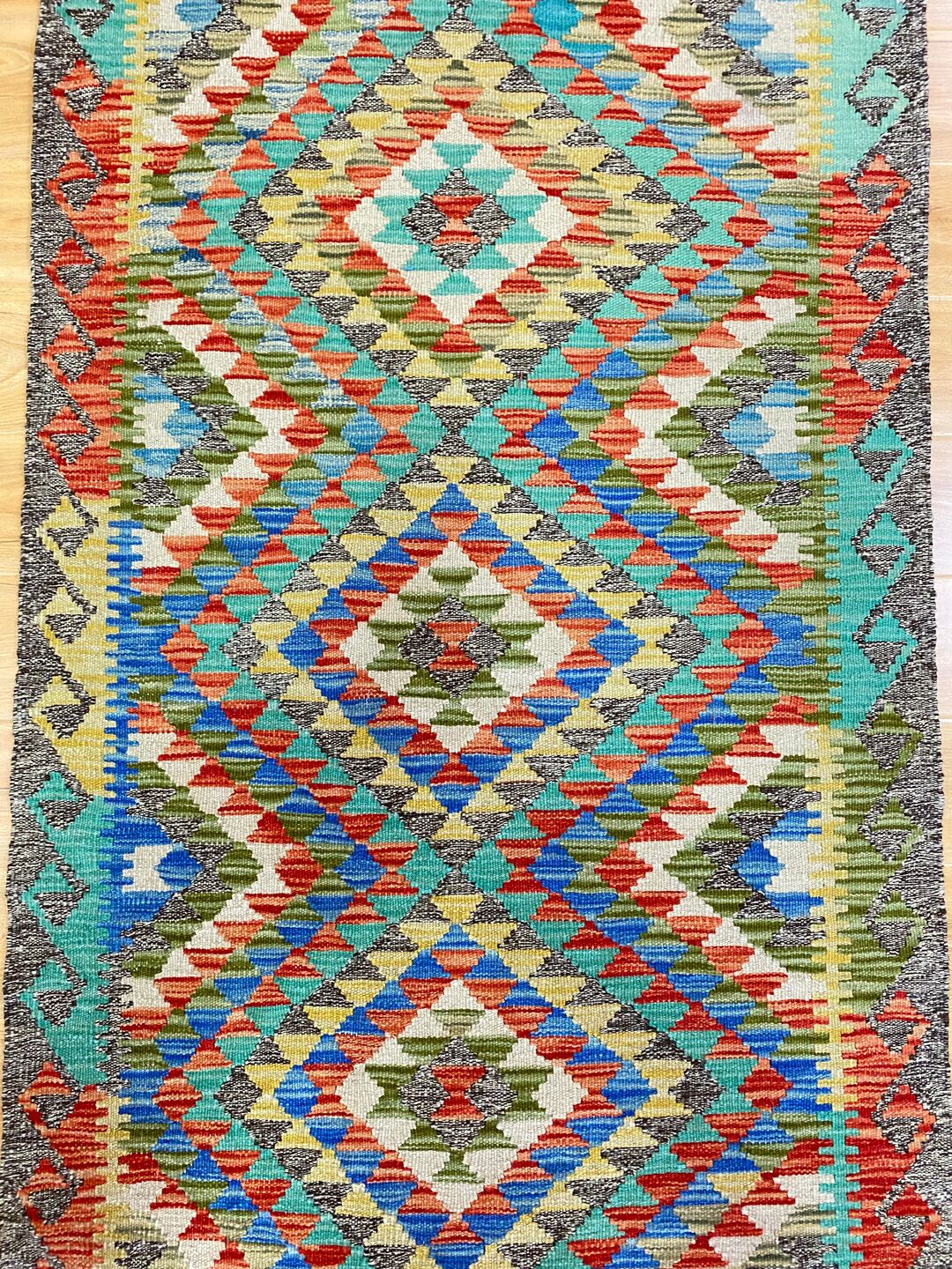 Decorative Hand Woven Vegetable Dye Boho Maymana Kilim Runner. Above All It Is Reversible. It Also Has A Pure Hand Spun Wool Pile On Wool Base. Vibrant Tone Dyed Using Vegetable Dyes.
