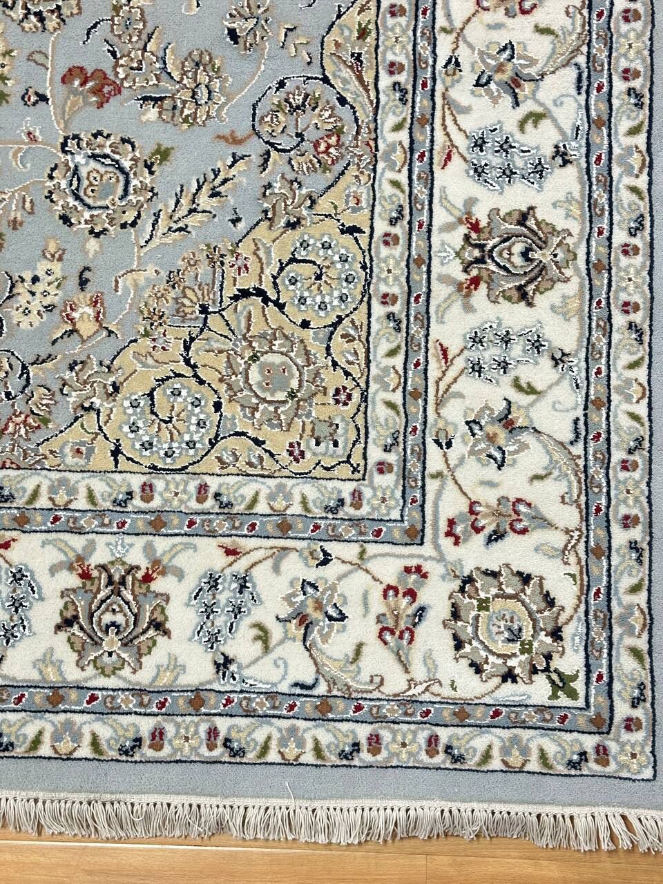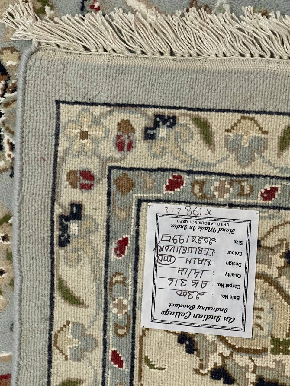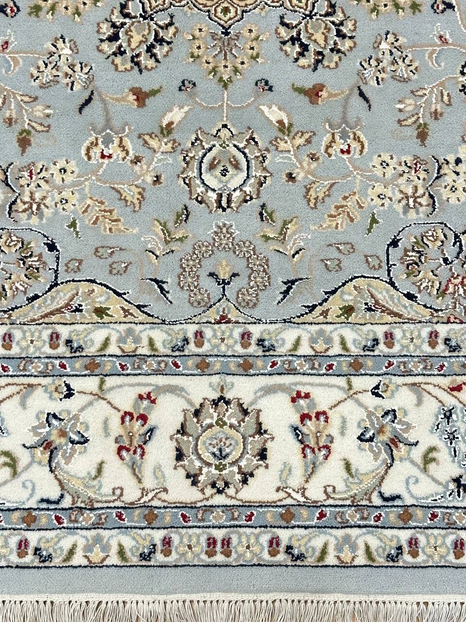 – Timeless Beauty: Add sophistication to your home with this brand-new, full-pile hand-knotted Indian rug, featuring a refined Nain design. Made from pure wool and silk-like blend on a cotton base, it showcases vibrant tones of Light Blue, creamy ivory, and light tones vegetable dyed using traditional methods.