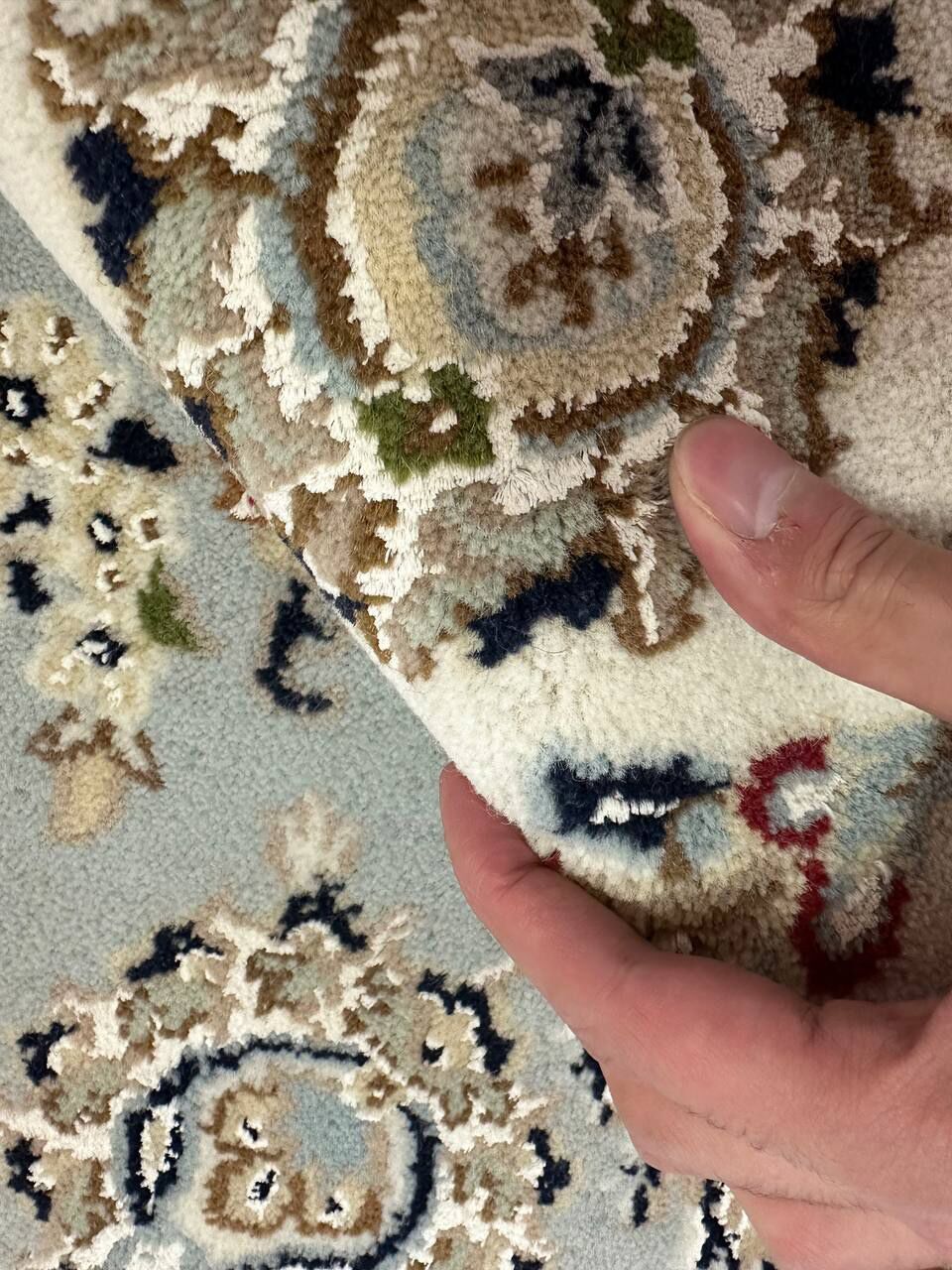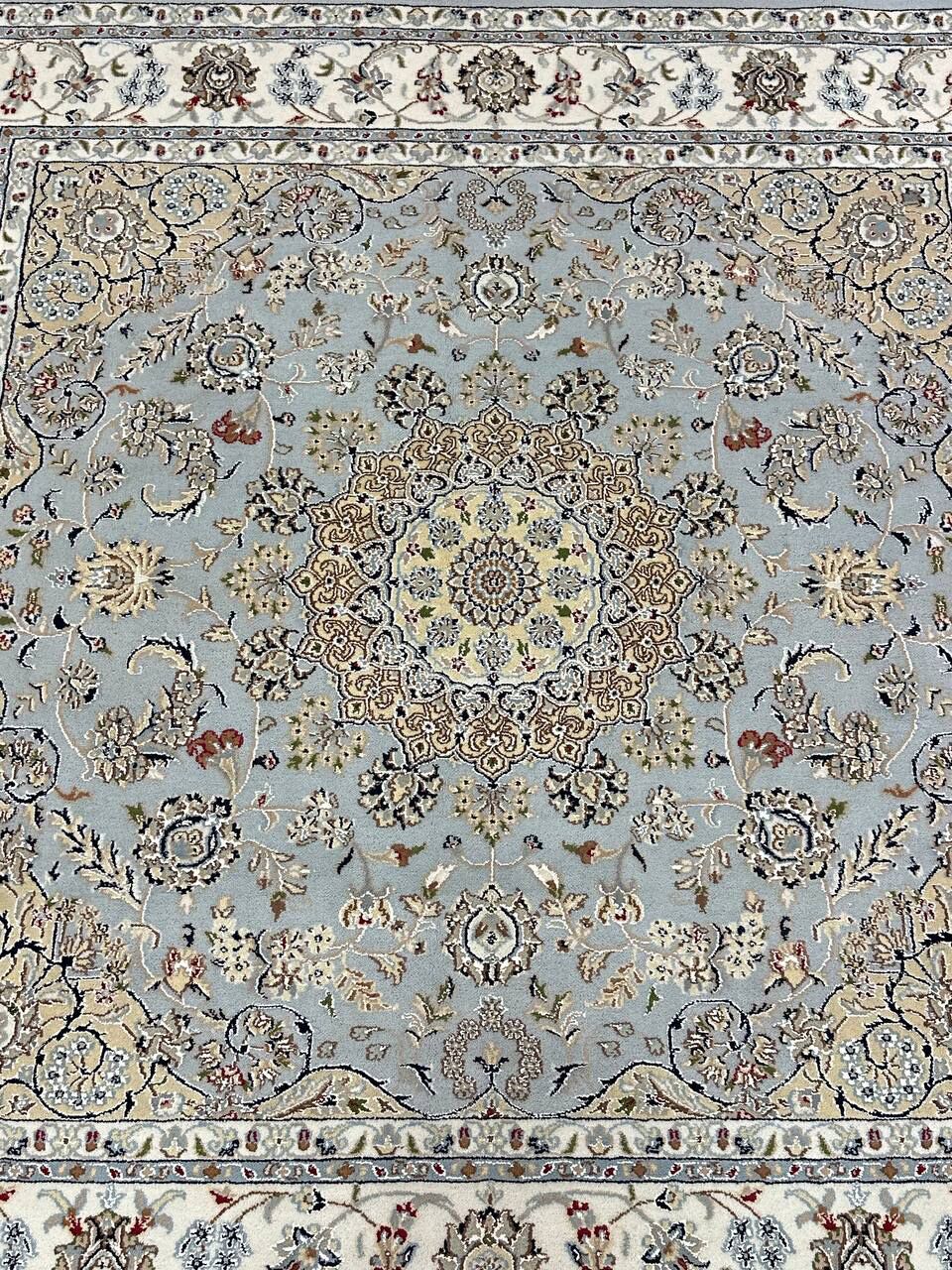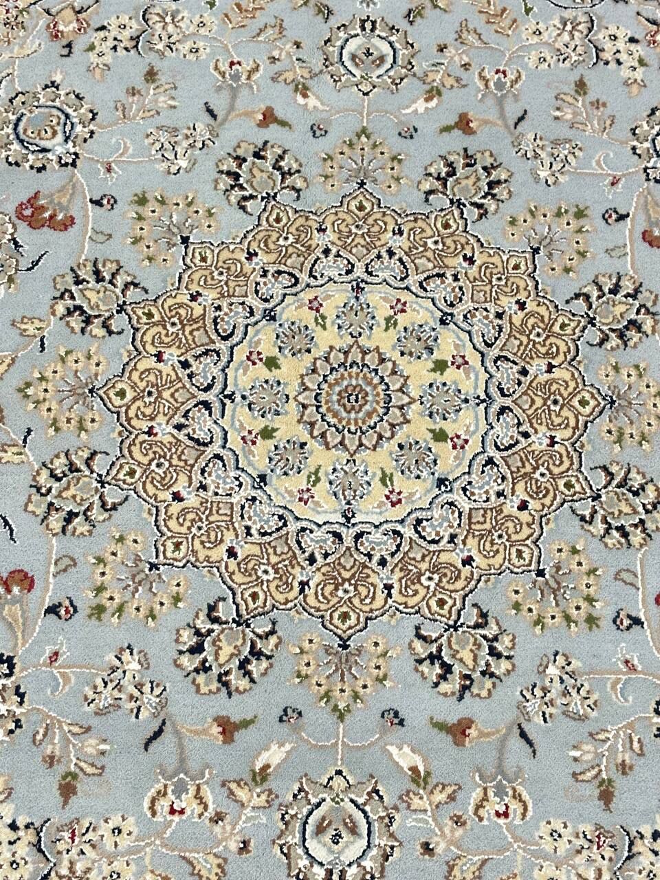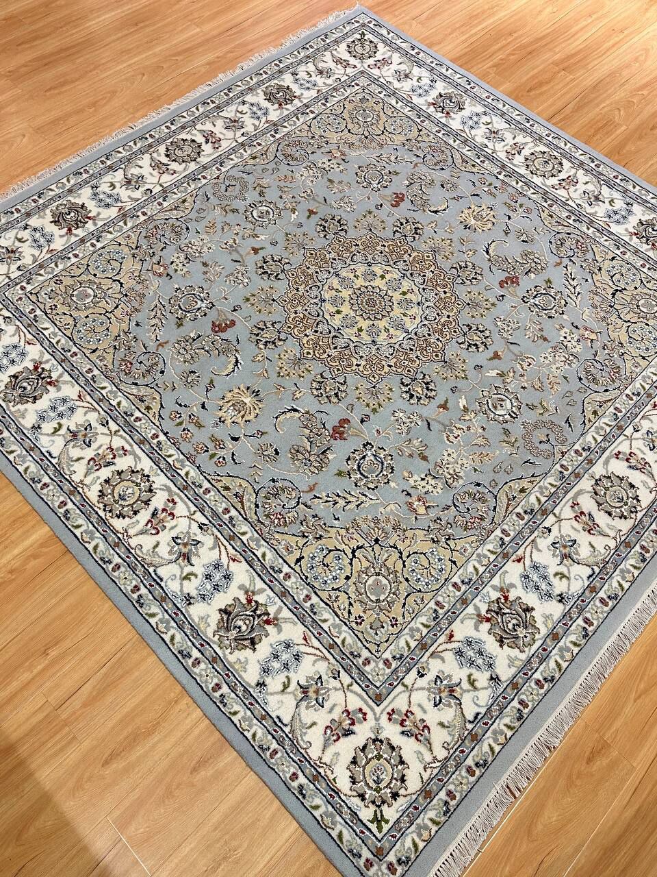 – Timeless Beauty: Add sophistication to your home with this brand-new, full-pile hand-knotted Indian rug, featuring a refined Nain design. Made from pure wool and silk-like blend on a cotton base, it showcases vibrant tones of Light Blue, creamy ivory, and light tones vegetable dyed using traditional methods.