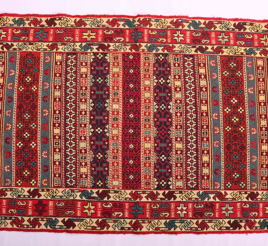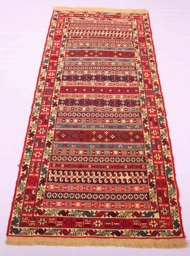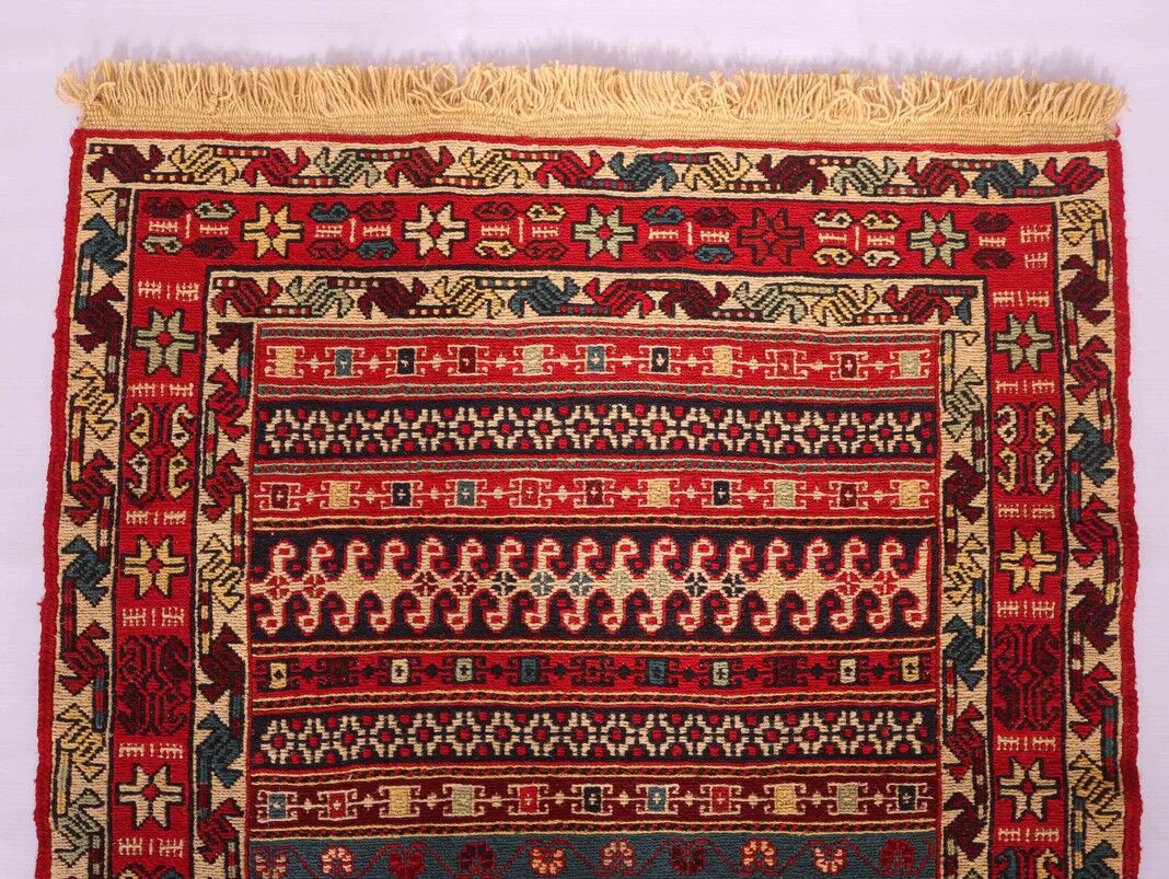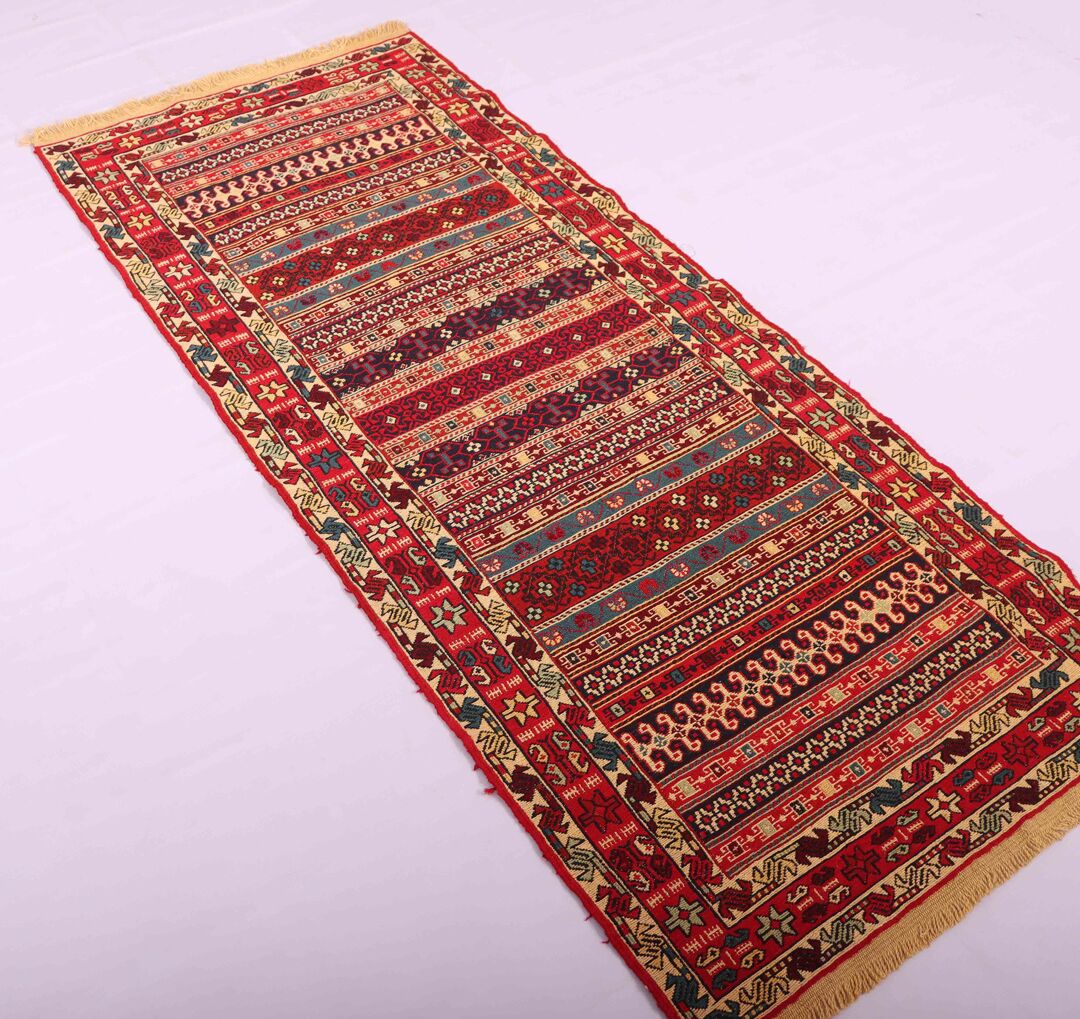 – Artistic Craftsmanship: Immerse yourself in the beauty of a Persian Ardebil Sumak Kilim Runner Rug, featuring three weaving techniques and a pure hand-spun wool pile with silk on a wool base.