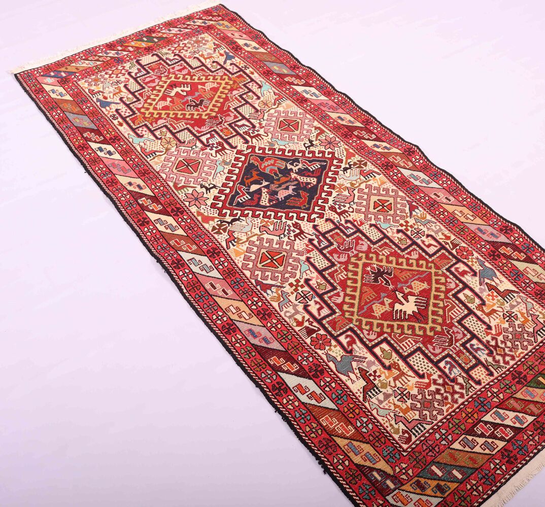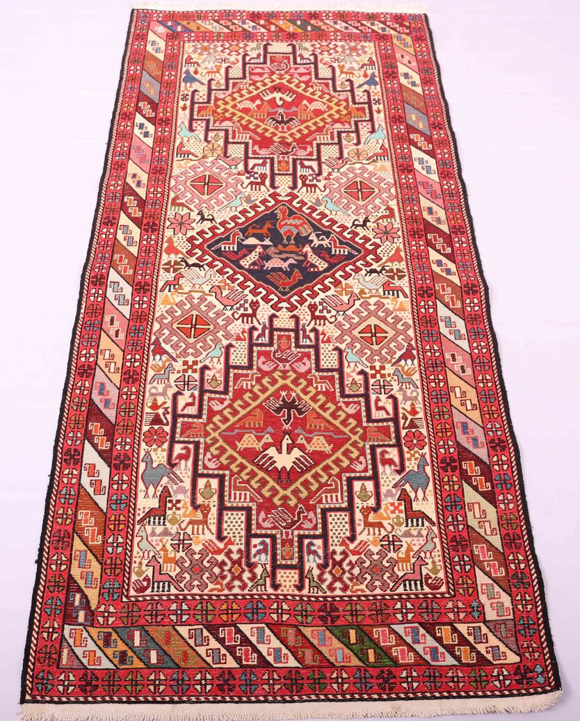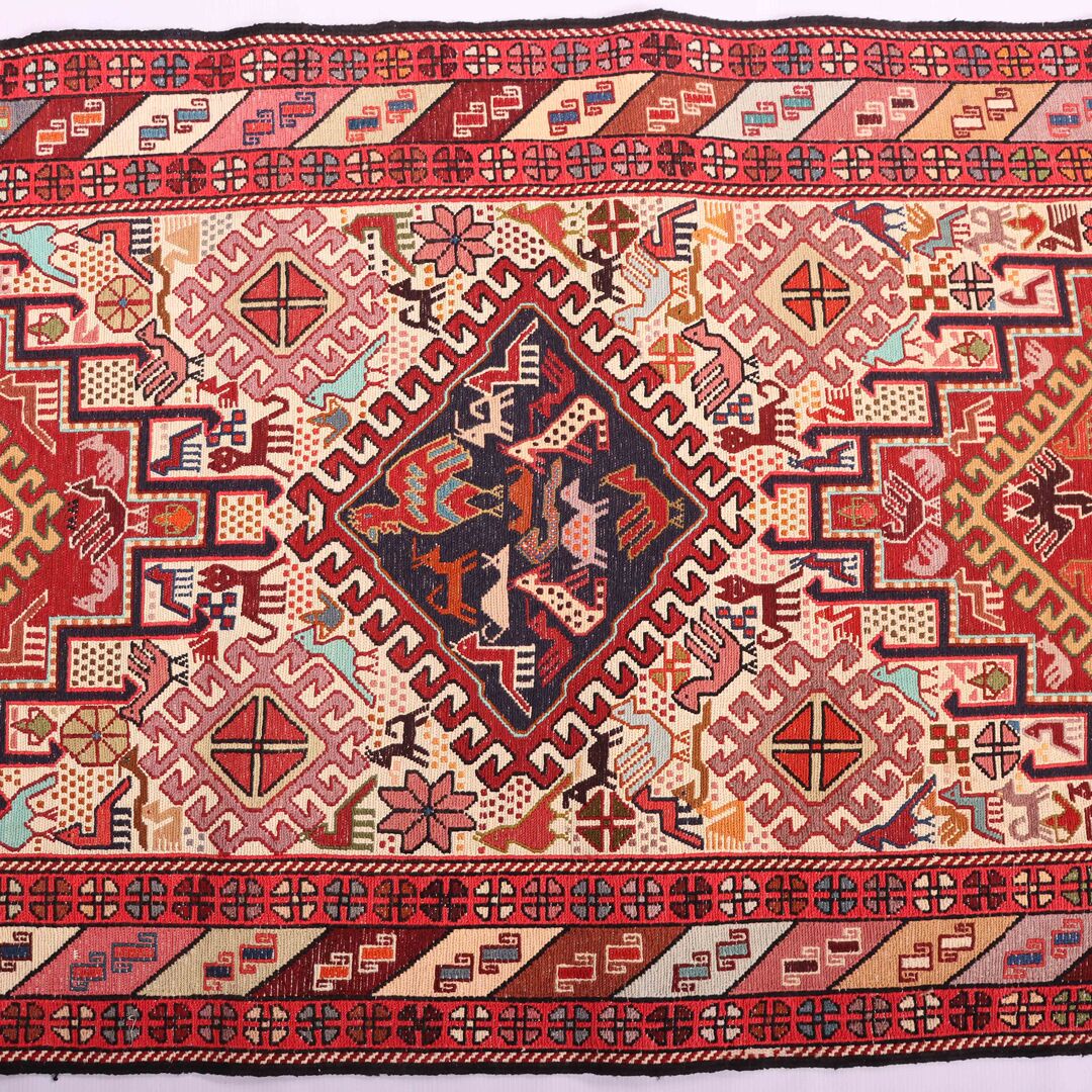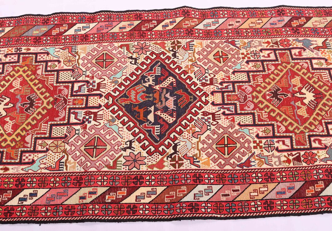 – Artistic Craftsmanship: Immerse yourself in the beauty of a Persian Ardebil Sumak Kilim Runner Rug, featuring three weaving techniques and a pure hand-spun wool pile with silk on a wool base.