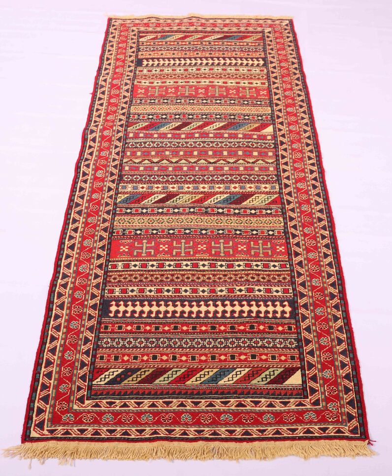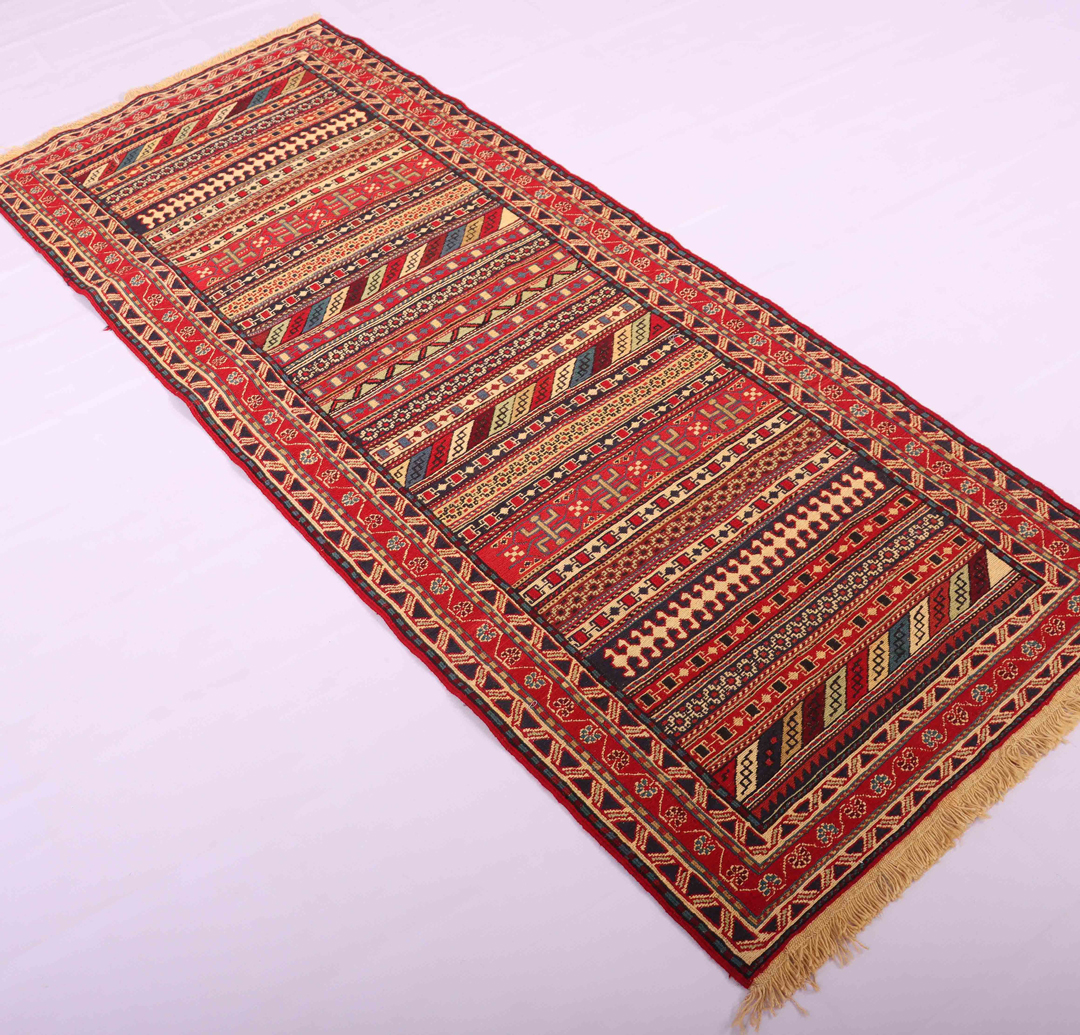 – Artistic Craftsmanship: Immerse yourself in the beauty of a Persian Ardebil Sumak Kilim Runner Rug, featuring three weaving techniques and a pure hand-spun wool pile with silk on a wool base.