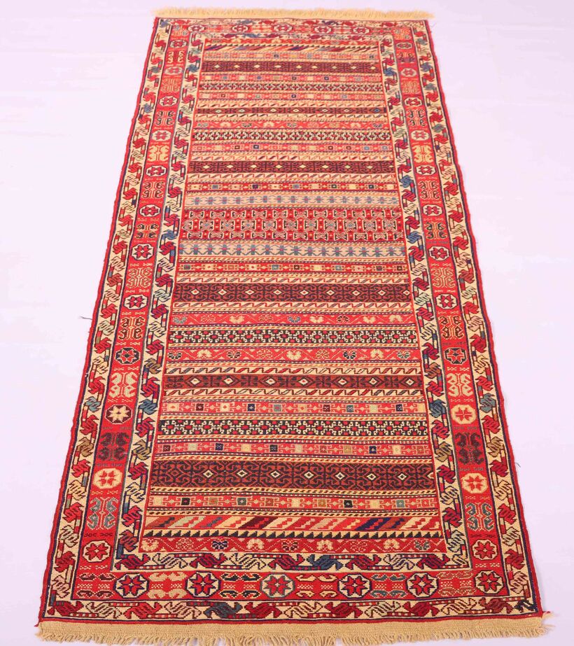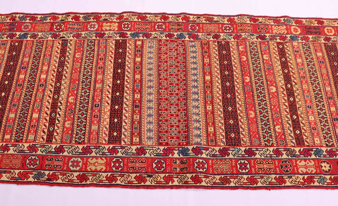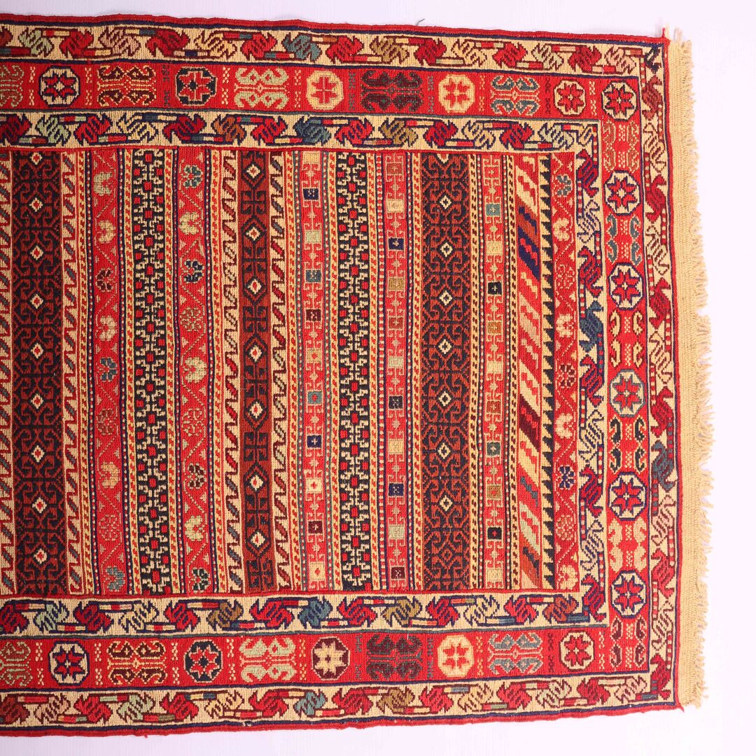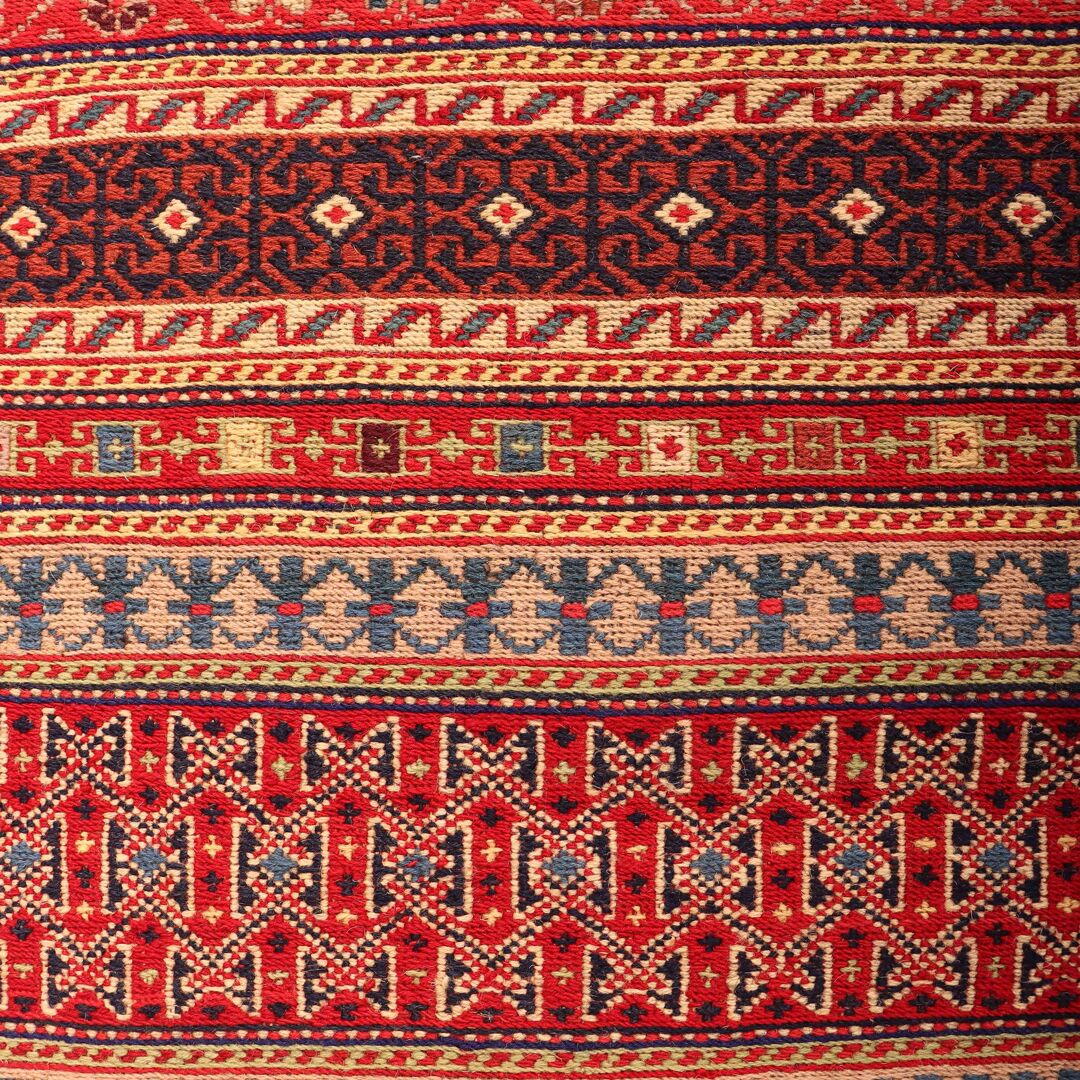 – Artistic Craftsmanship: Immerse yourself in the beauty of a Persian Ardebil Sumak Kilim Runner Rug, featuring three weaving techniques and a pure hand-spun wool pile with silk on a wool base.