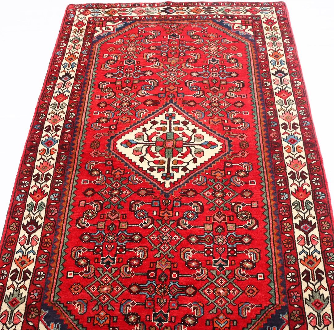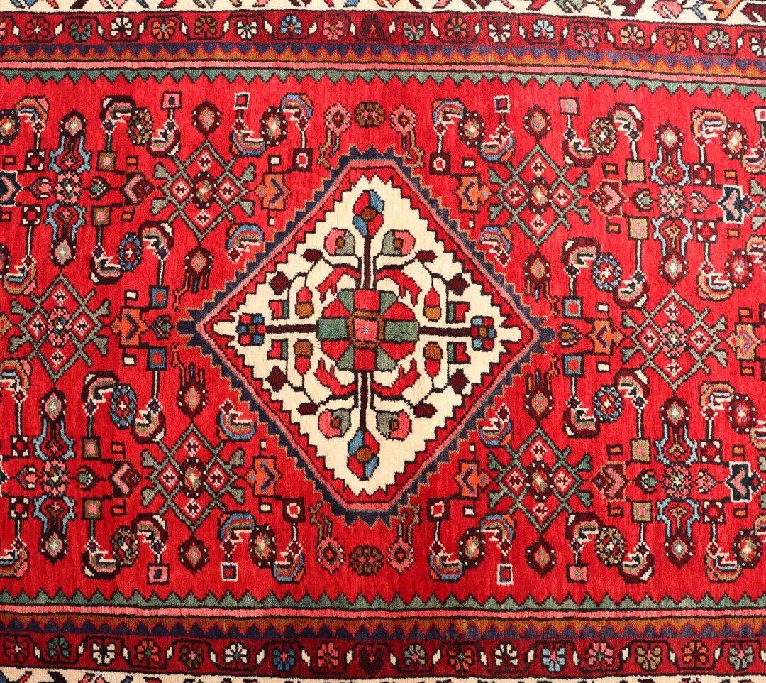 – Durable Elegance: Elevate your Room with this Tribal design handmade Persian Hamadan Rug, known for its hard-wearing and durable qualities. Pure hand-spun wool pile on a cotton base provides both comfort and longevity.