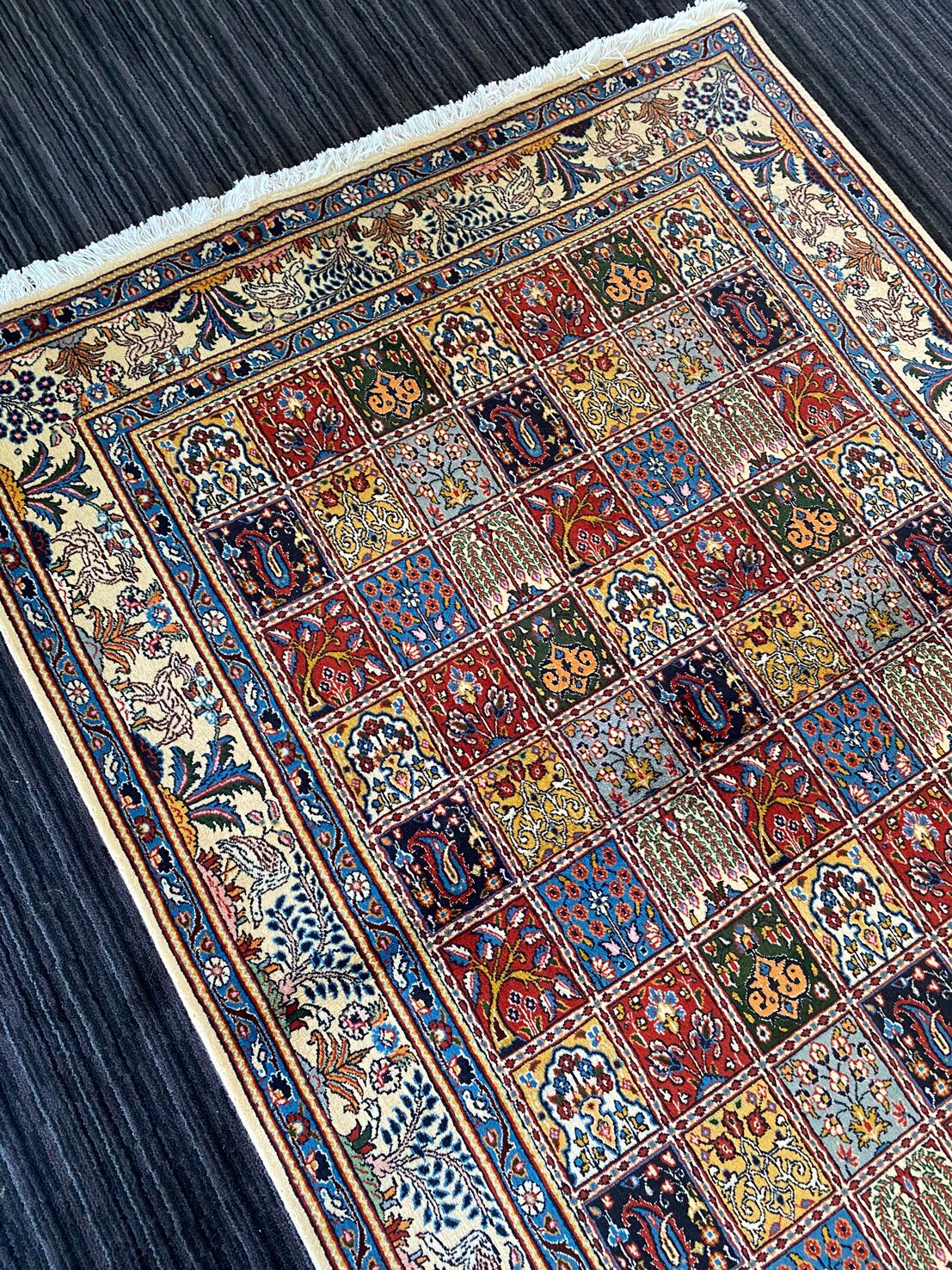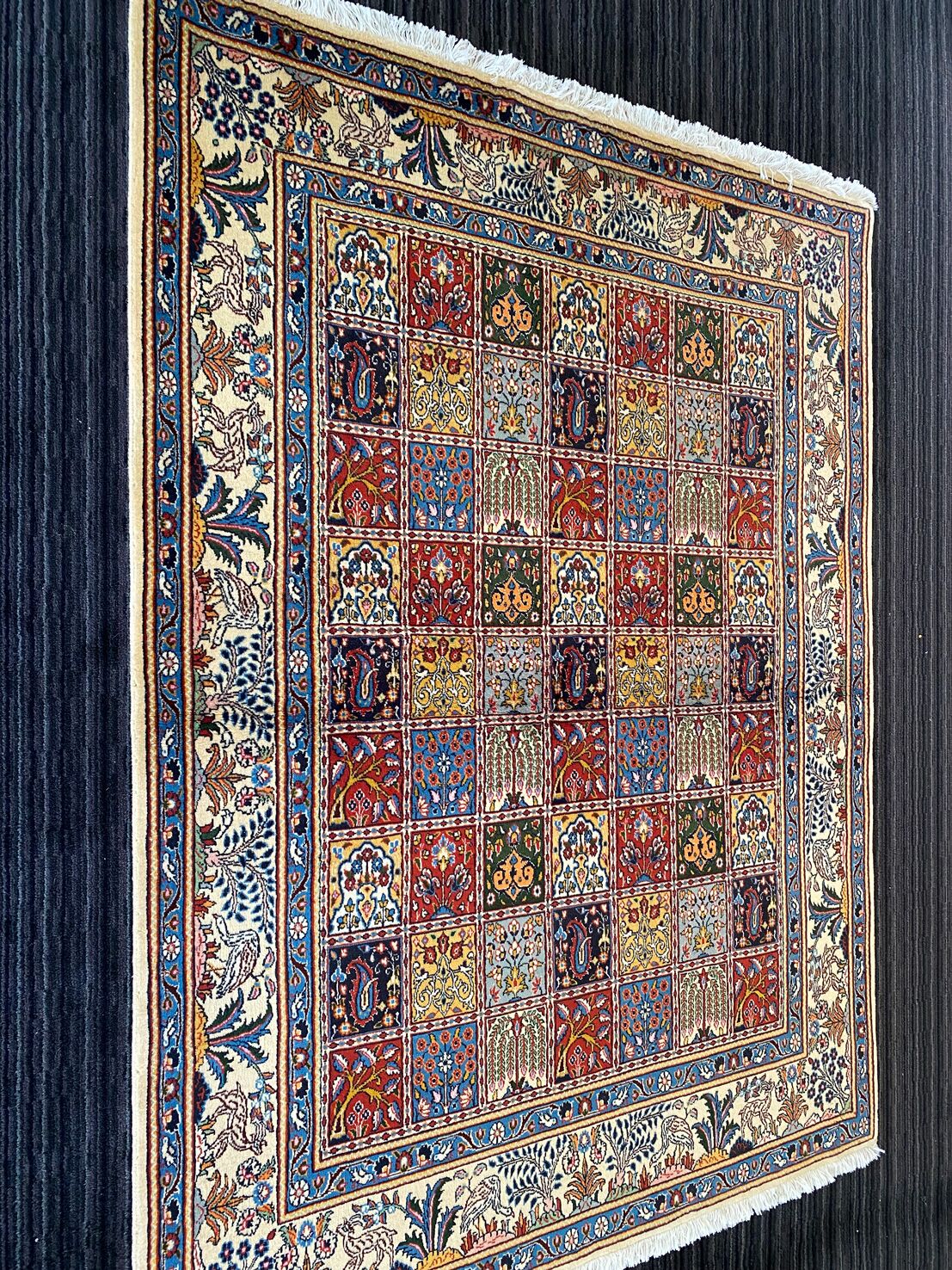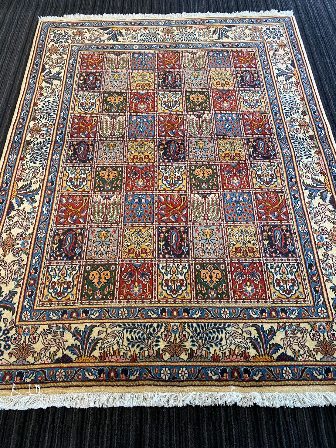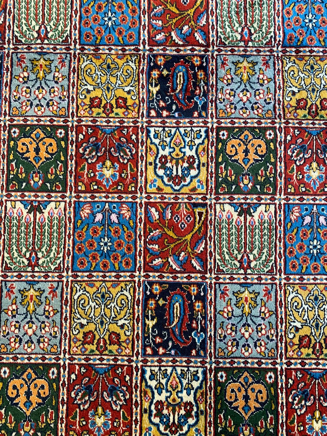 Amazing Room Size Garden Design Handmade Persian Bakhtiari Rug. Above All It Is Hard To Find This Design In Original Persian Handmade Carpets. It Also Has Pure Lamb’s Wool Pile On Fine Cotton Base. Multi-Color Tone Dyed Using Traditional Methods.