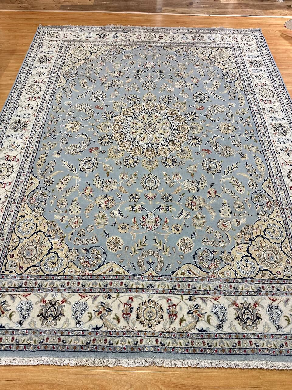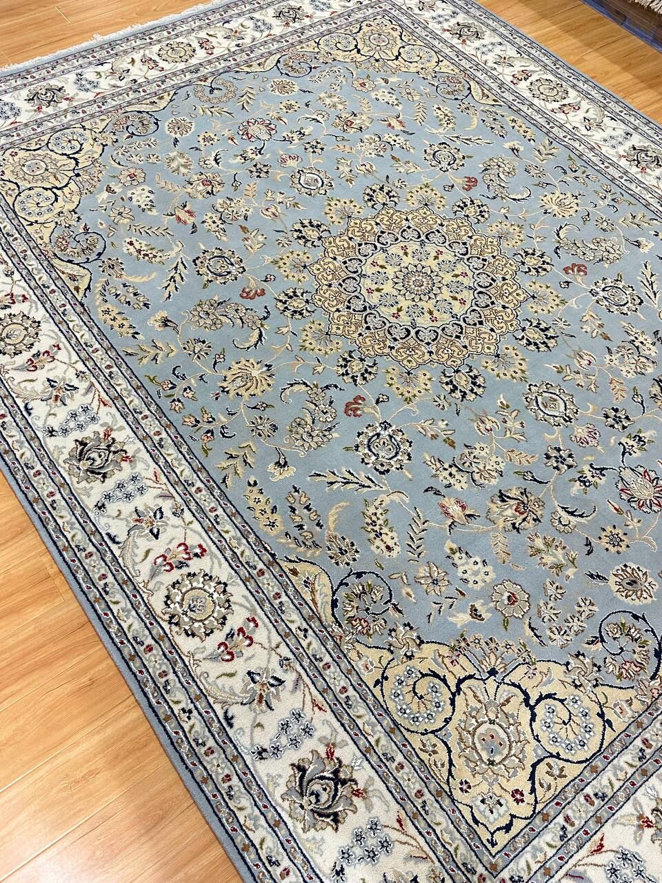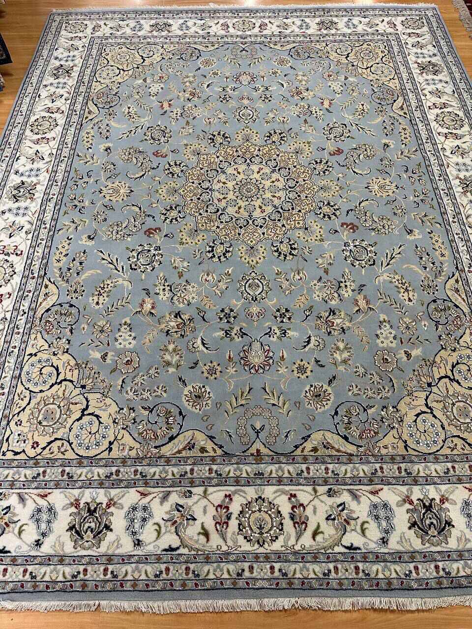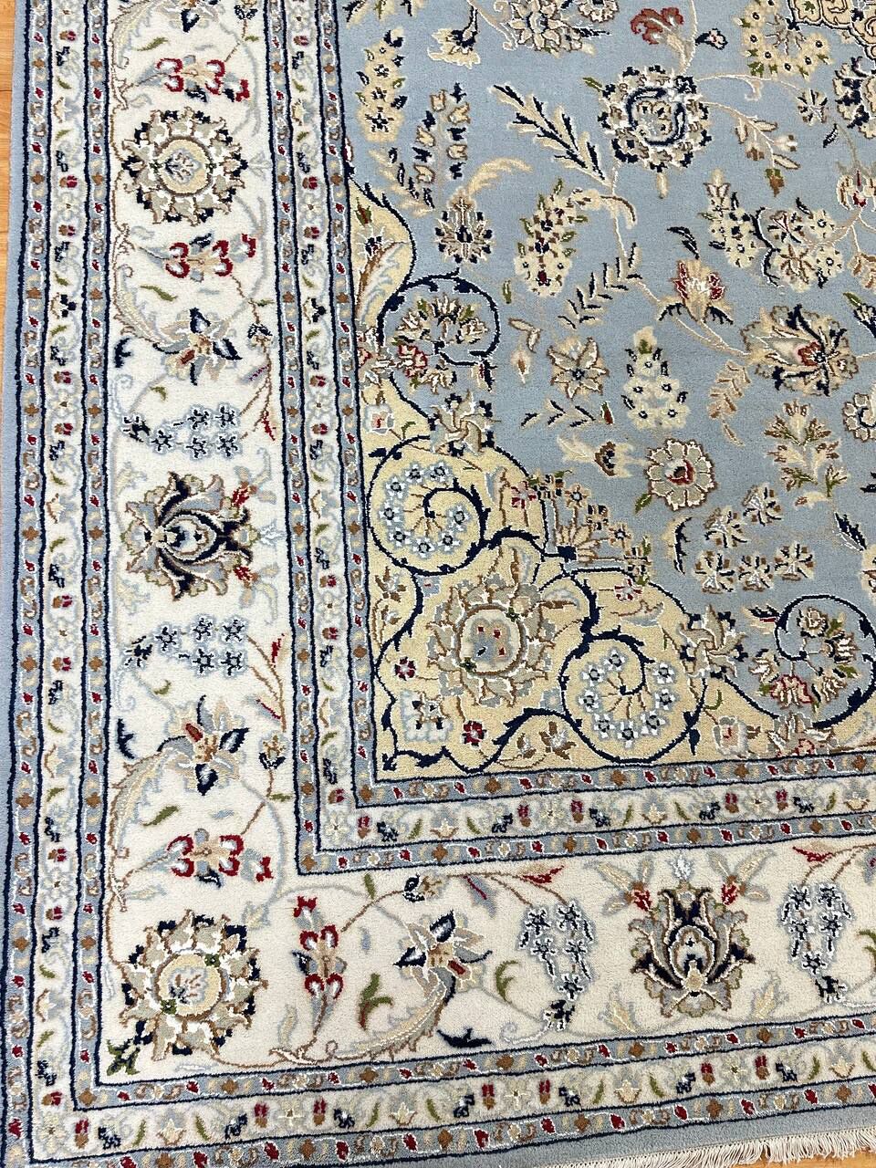 – Timeless Beauty: Add sophistication to your home with this brand-new, full-pile hand-knotted Indian rug, featuring a refined Nain design. Made from pure wool and silk-like blend on a cotton base, it showcases vibrant tones of Light Blue, creamy ivory, and light tones vegetable dyed using traditional methods.
