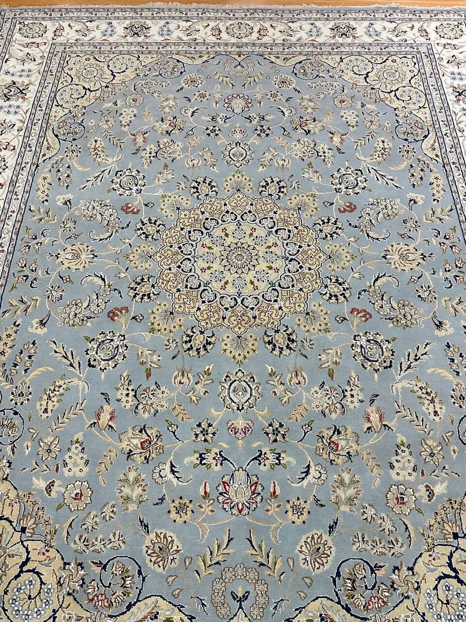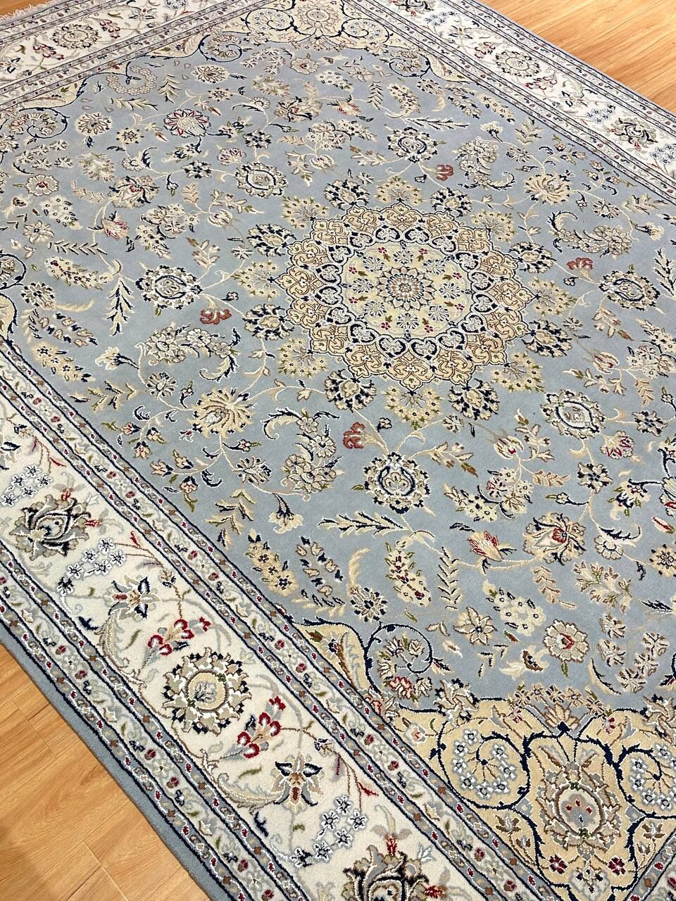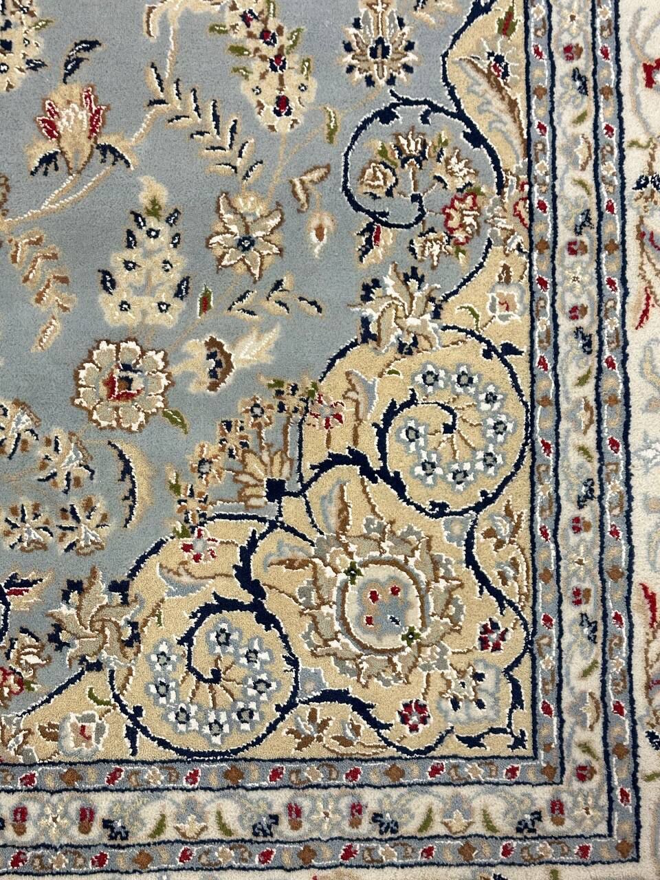 – Timeless Beauty: Add sophistication to your home with this brand-new, full-pile hand-knotted Indian rug, featuring a refined Nain design. Made from pure wool and silk-like blend on a cotton base, it showcases vibrant tones of Light Blue, creamy ivory, and light tones vegetable dyed using traditional methods.