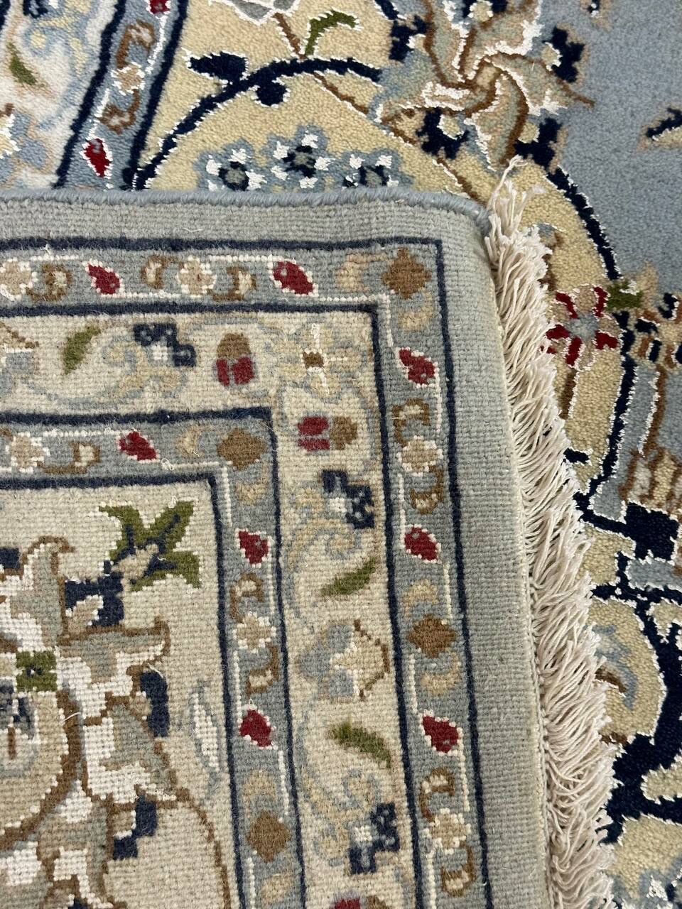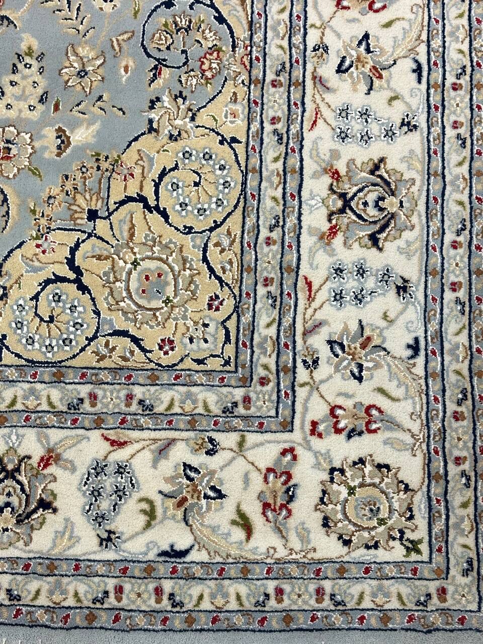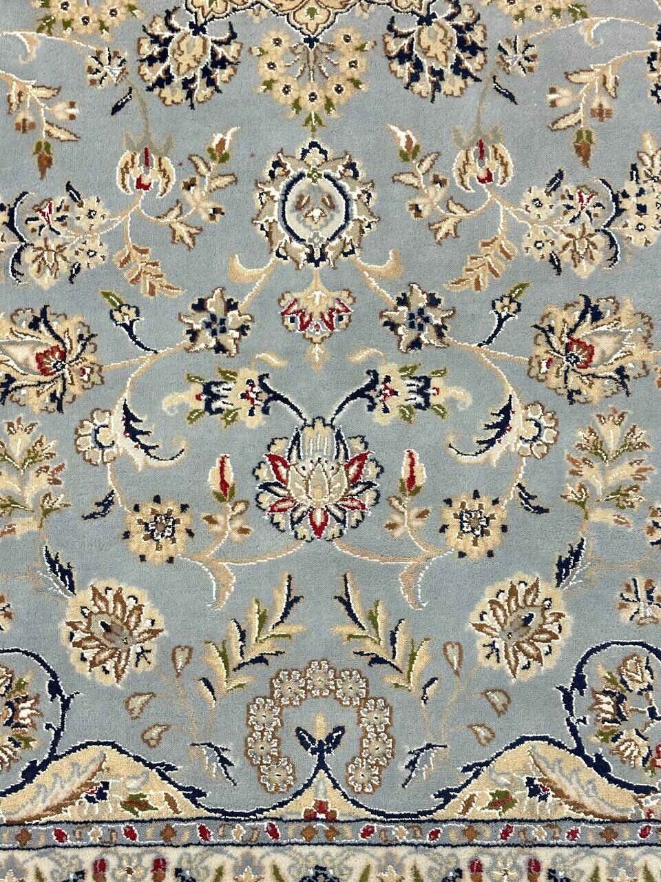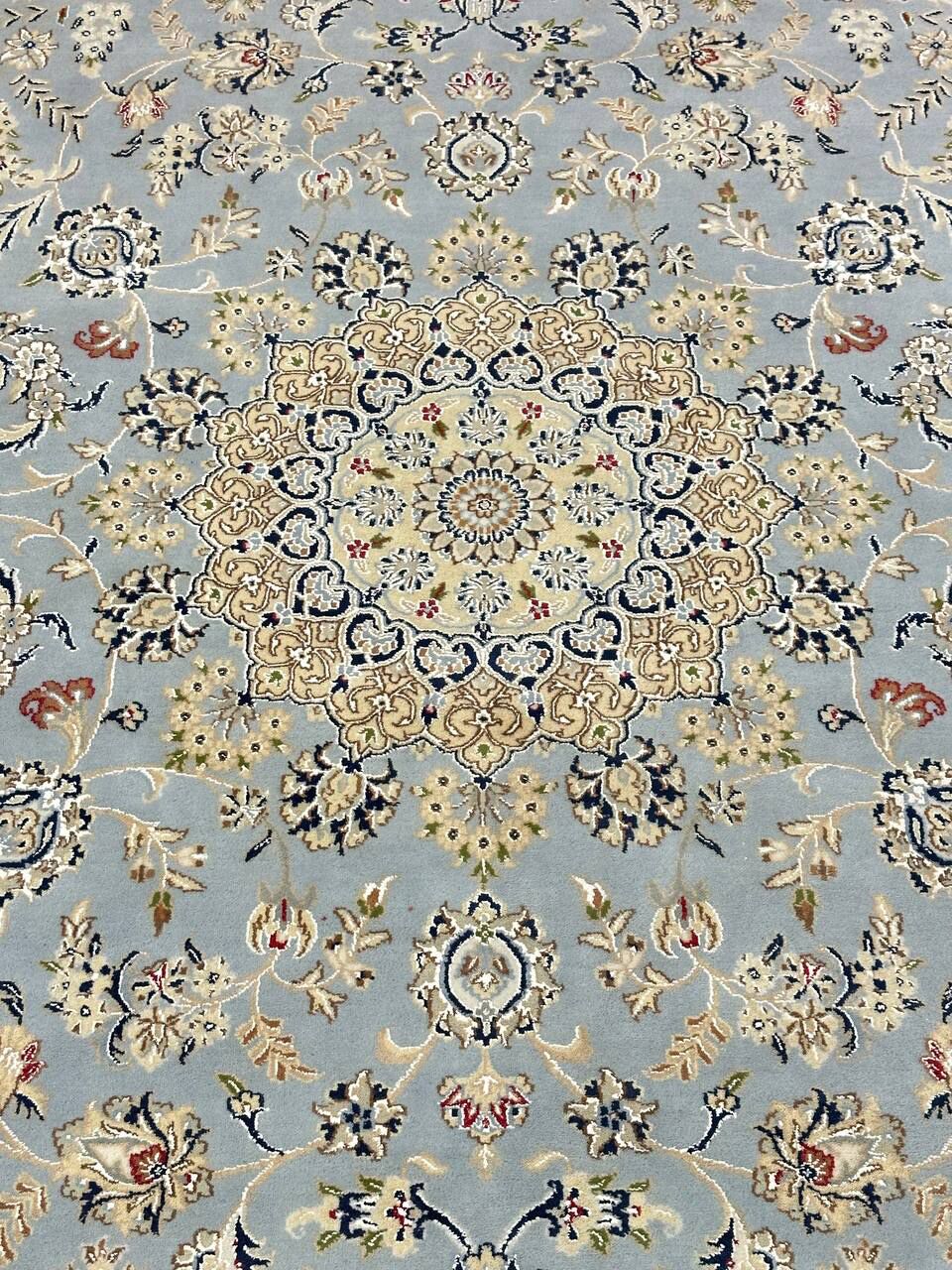 – Timeless Beauty: Add sophistication to your home with this brand-new, full-pile hand-knotted Indian rug, featuring a refined Nain design. Made from pure wool and silk-like blend on a cotton base, it showcases vibrant tones of Light Blue, creamy ivory, and light tones vegetable dyed using traditional methods.